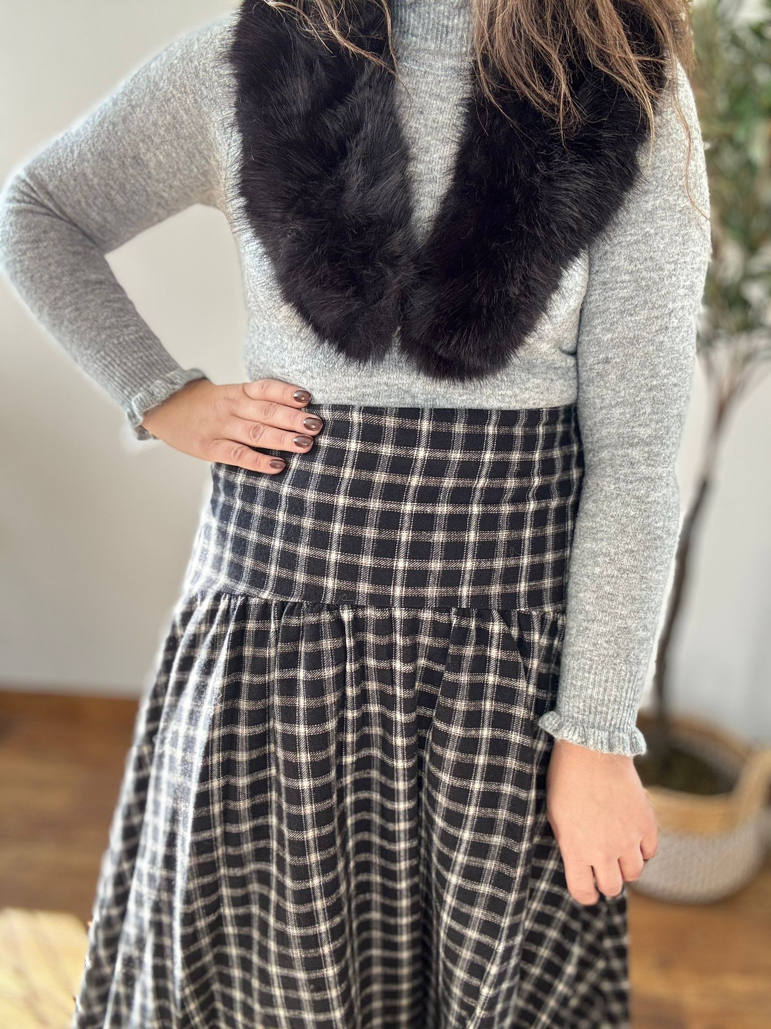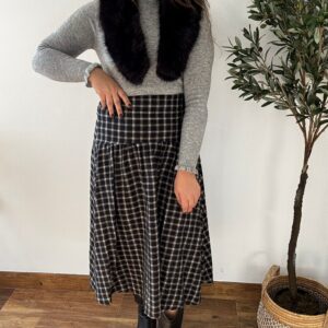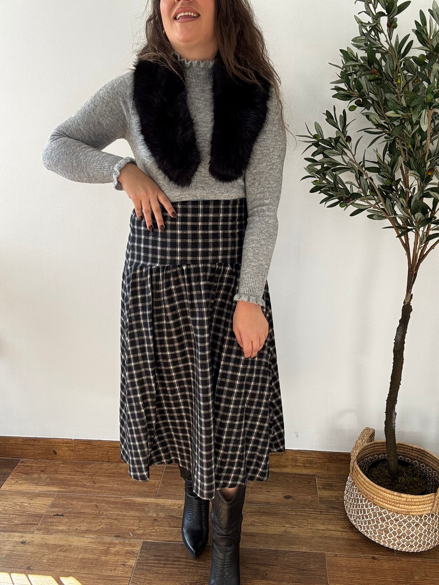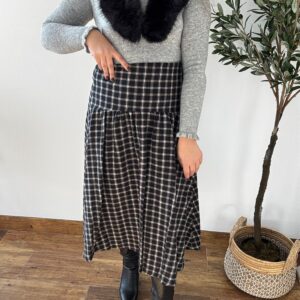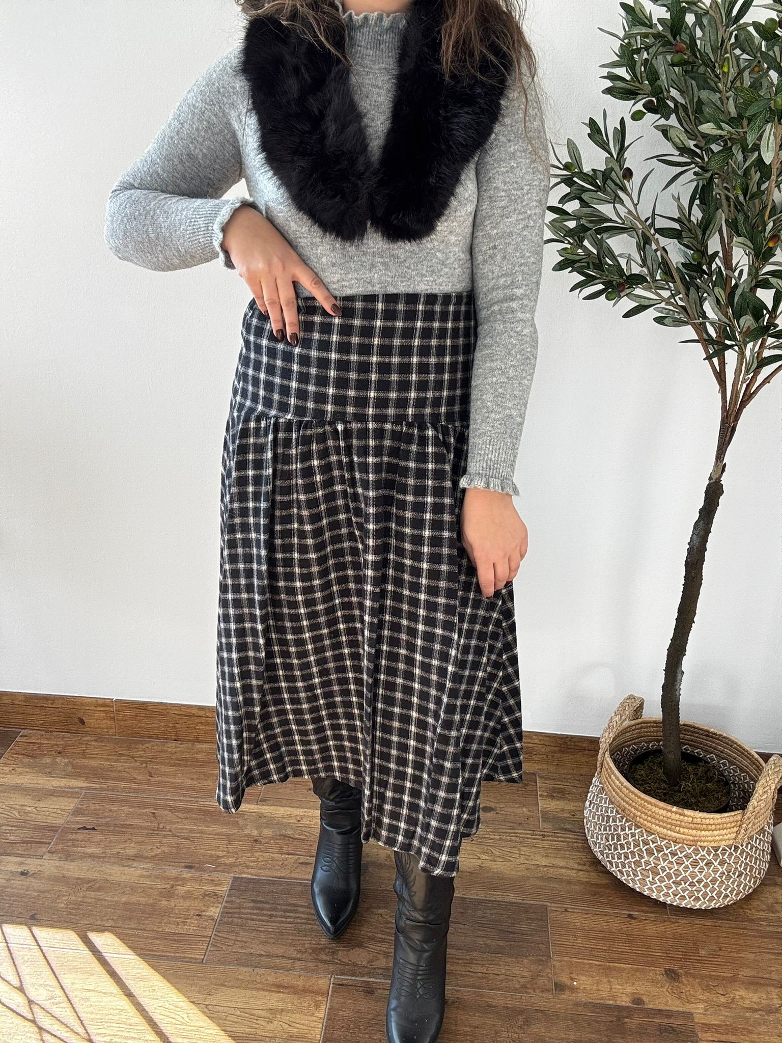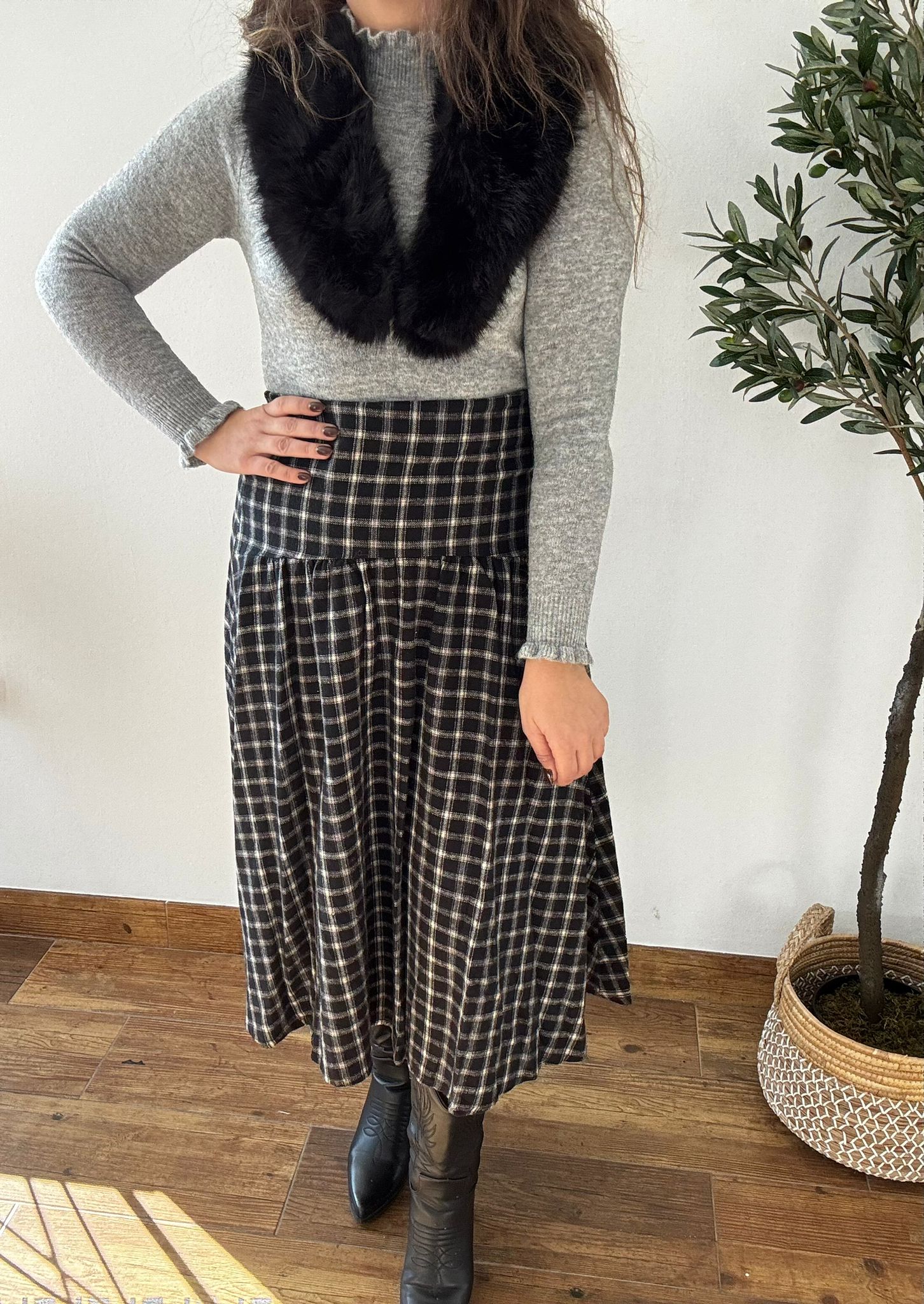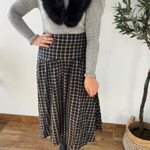 Falda de cuadros con vuelo a la cadera en franela calentita. Tiene cintura engomada. TU RECOMENDADA 36/40. Ana lleva habitualmente talla 40/42 y mide 1.71m Medidas de la falda: cintura estirada 94, cadera 150 y largo 87cm