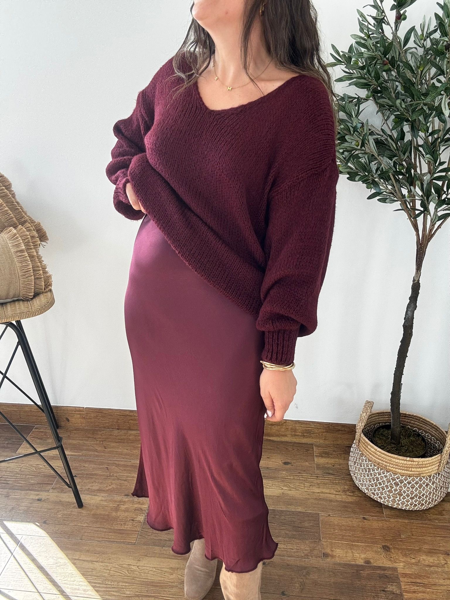 Falda satinada con cintura engomada. TU RECOMENDADA 36/42. Ana lleva habitualmente talla L 40/42 y mide 1.71m. Medidas de la falda: cintura estirada 100, cadera 120 y largo 94cm
