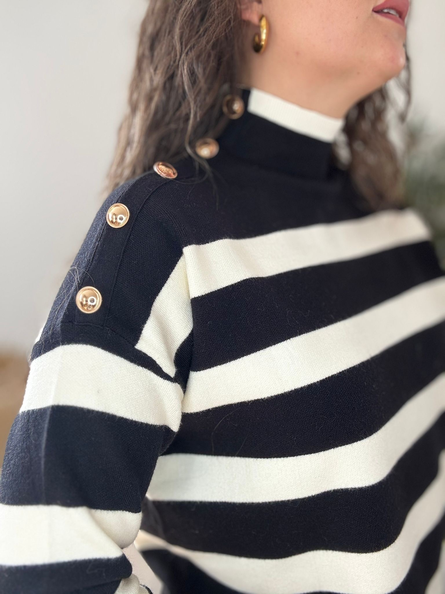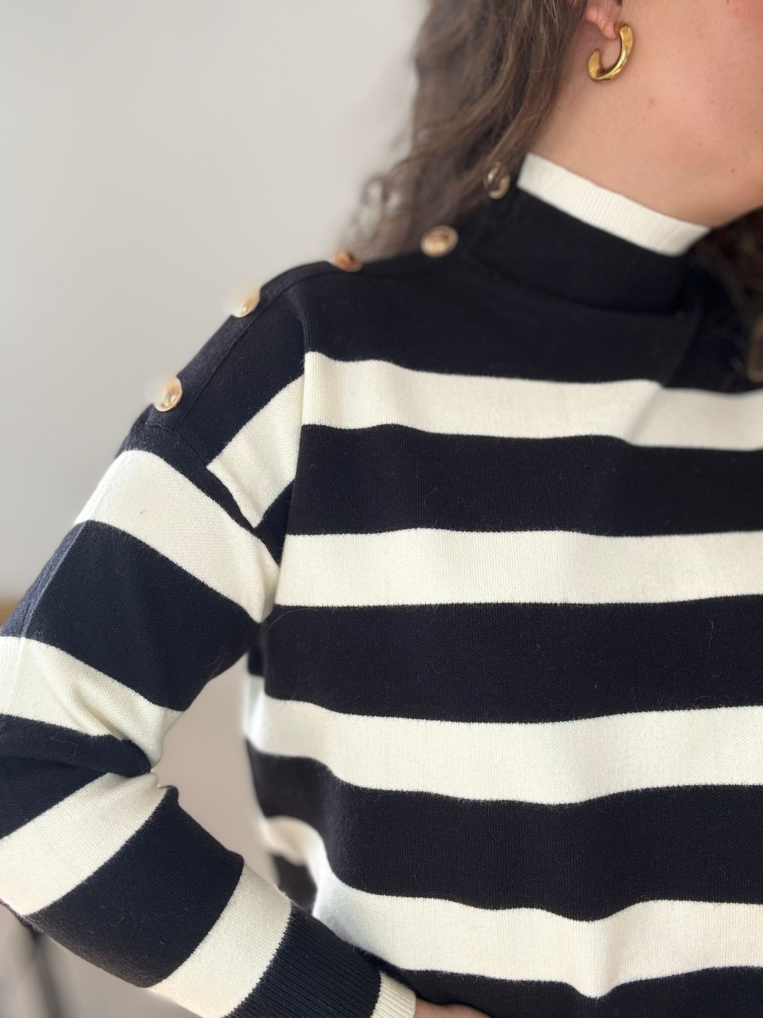 Jersey de punto prensado con detalle de botones en el lateral. TU RECOMENDADA 38/46. Ana lleva habitualmente talla L 40/42. Medidas del jersey: contorno de pecho 124 y largo 68cm