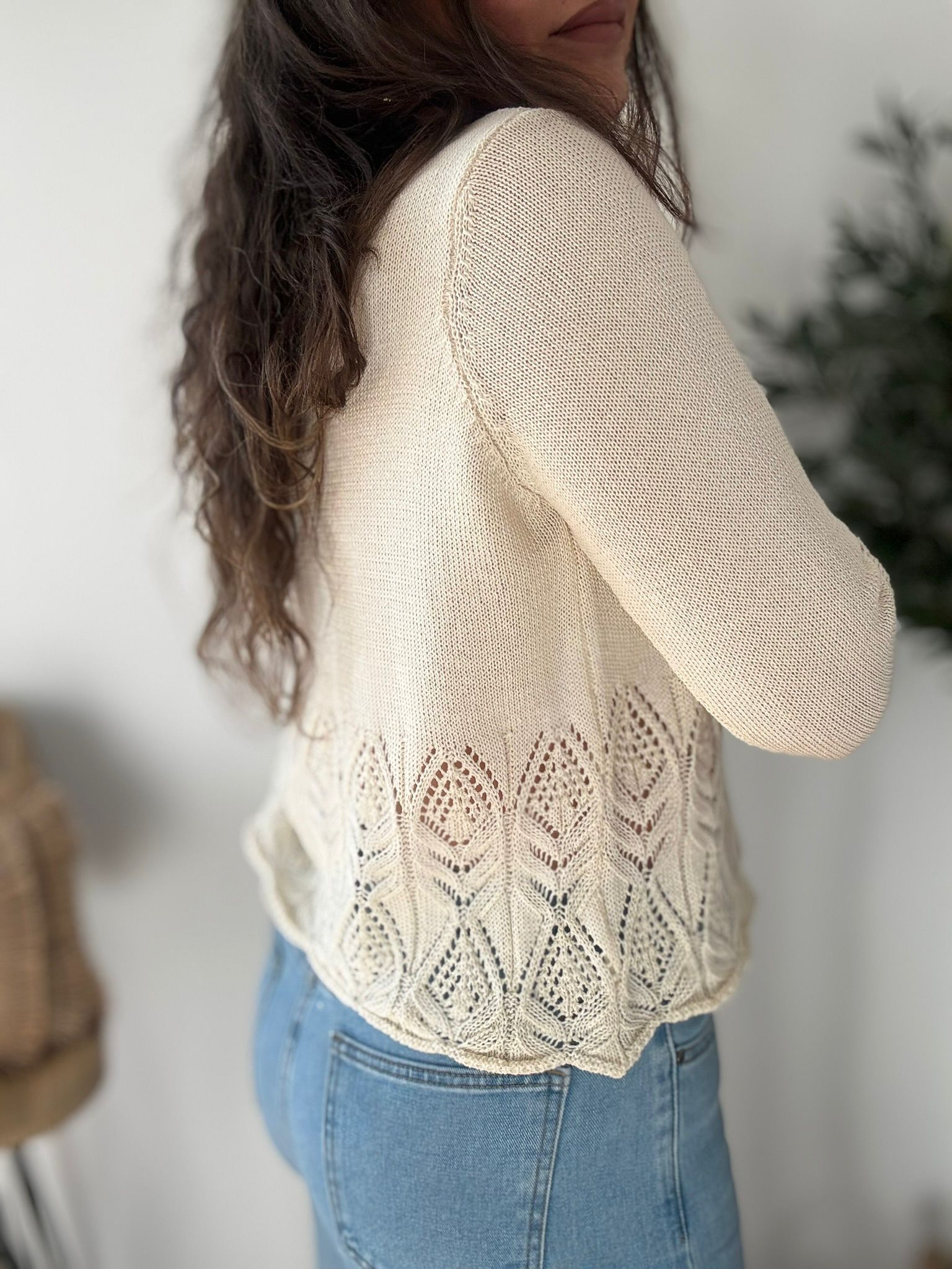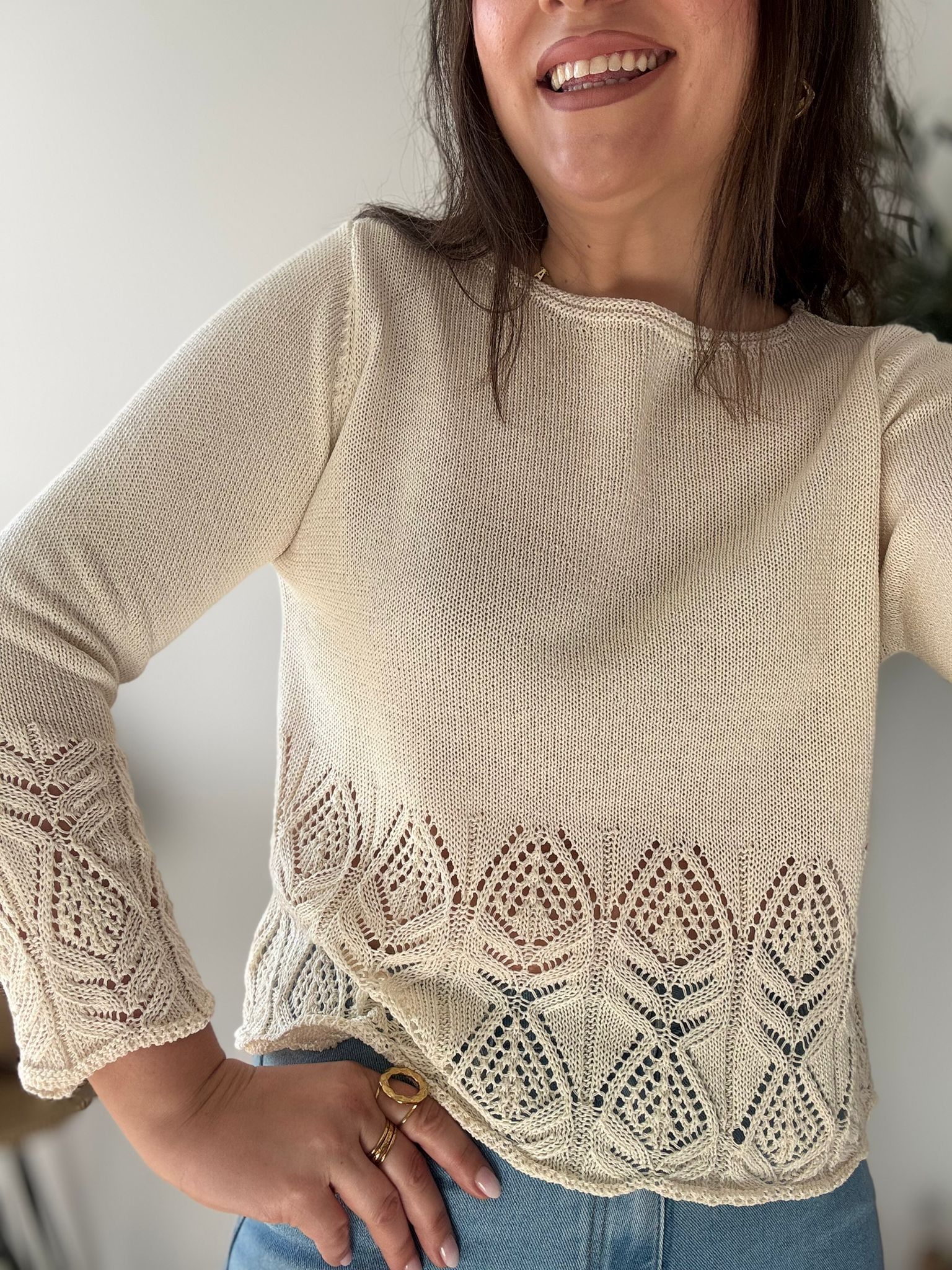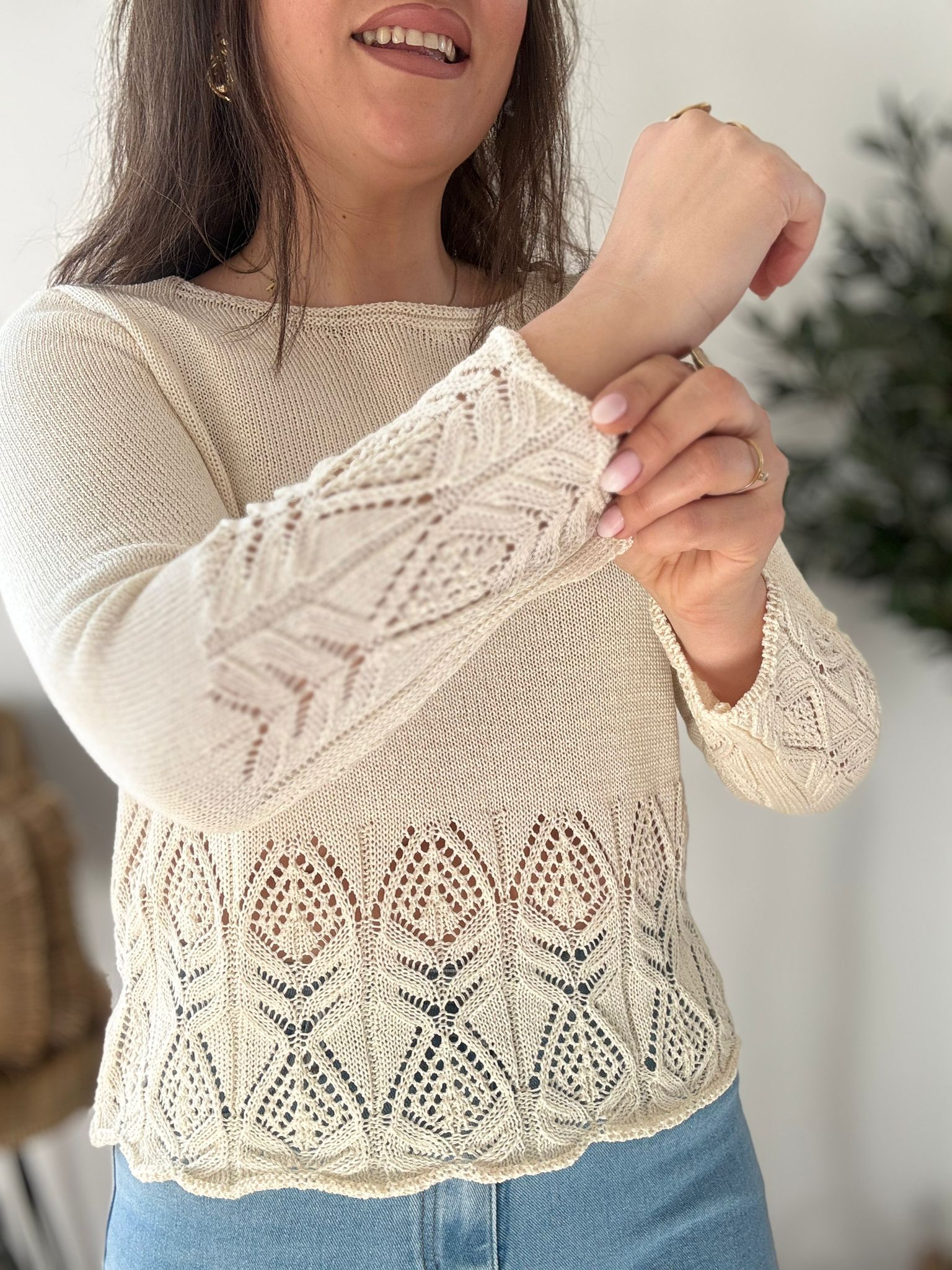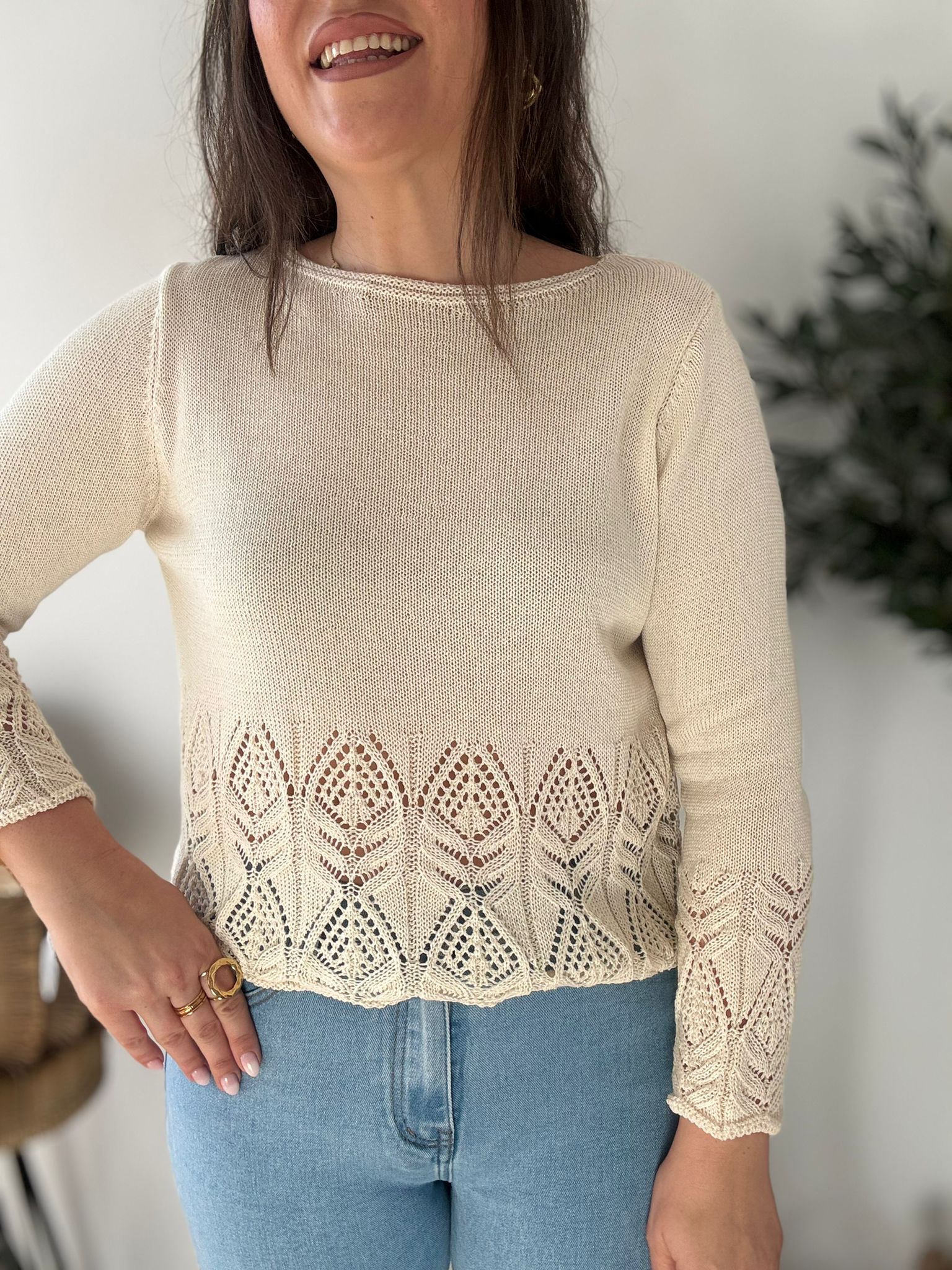 Jersey de algodón 100% con mangas y bajo calado. TU RECOMENDADA 34/42. Tiene punto elástico. Ana lleva habitualmente talla L/40