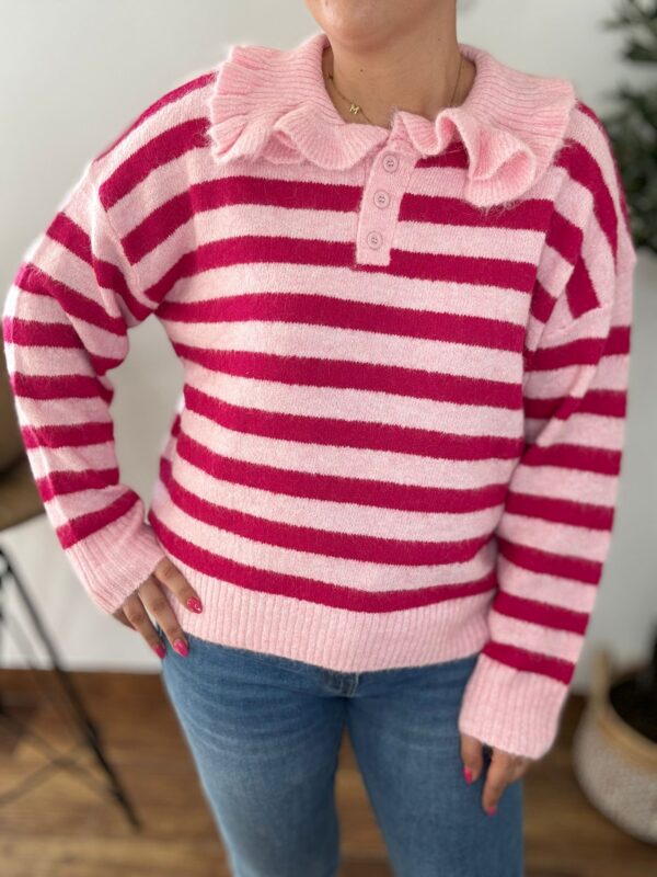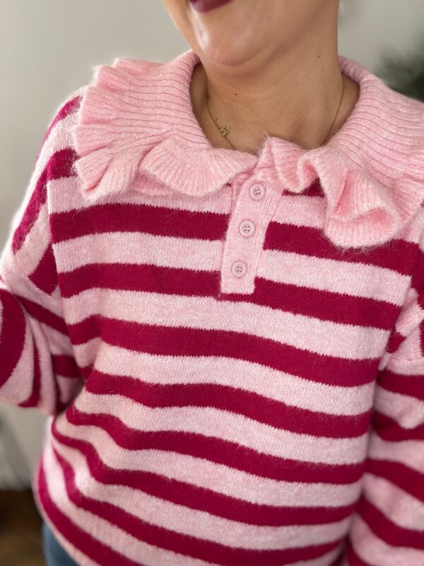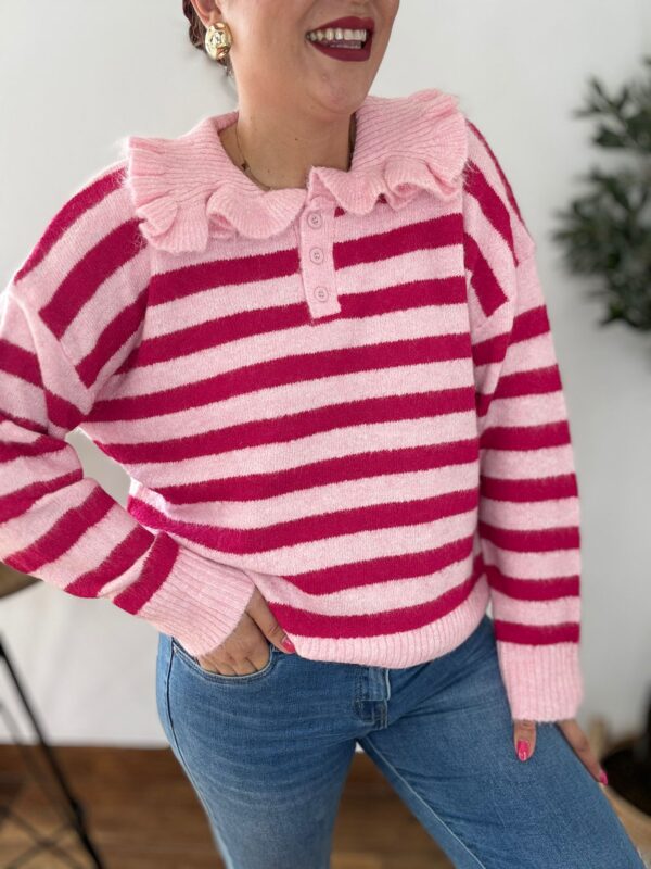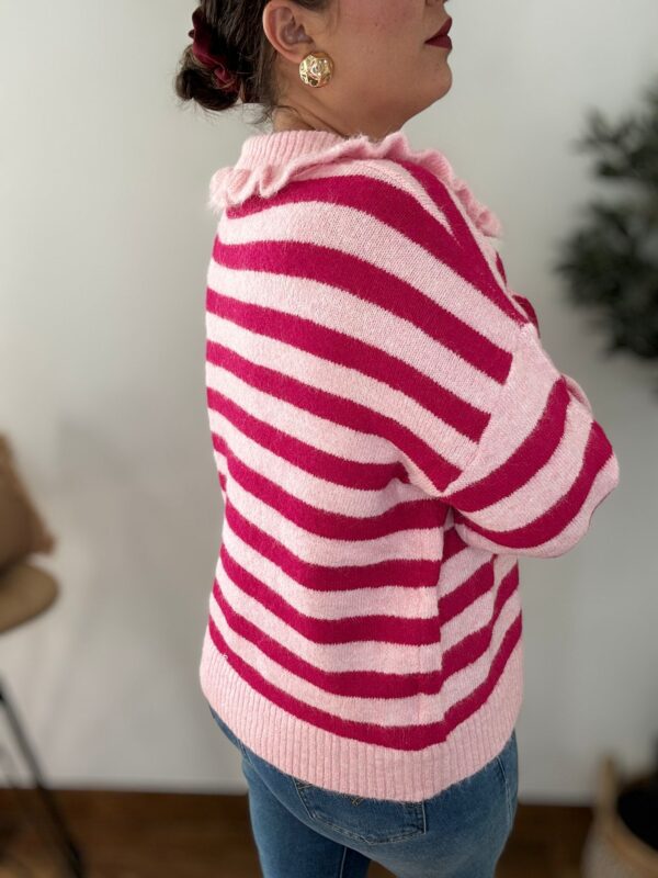 Jersey de lana suave (no pica) de rayas rosas y fucsia. OVERSIZE. TU RECOMENDADA 38/48. Ana lleva habitualmente talla L 40/42 y mide 1.71m
