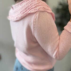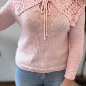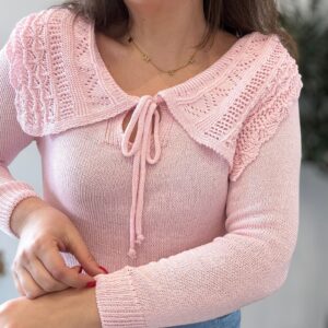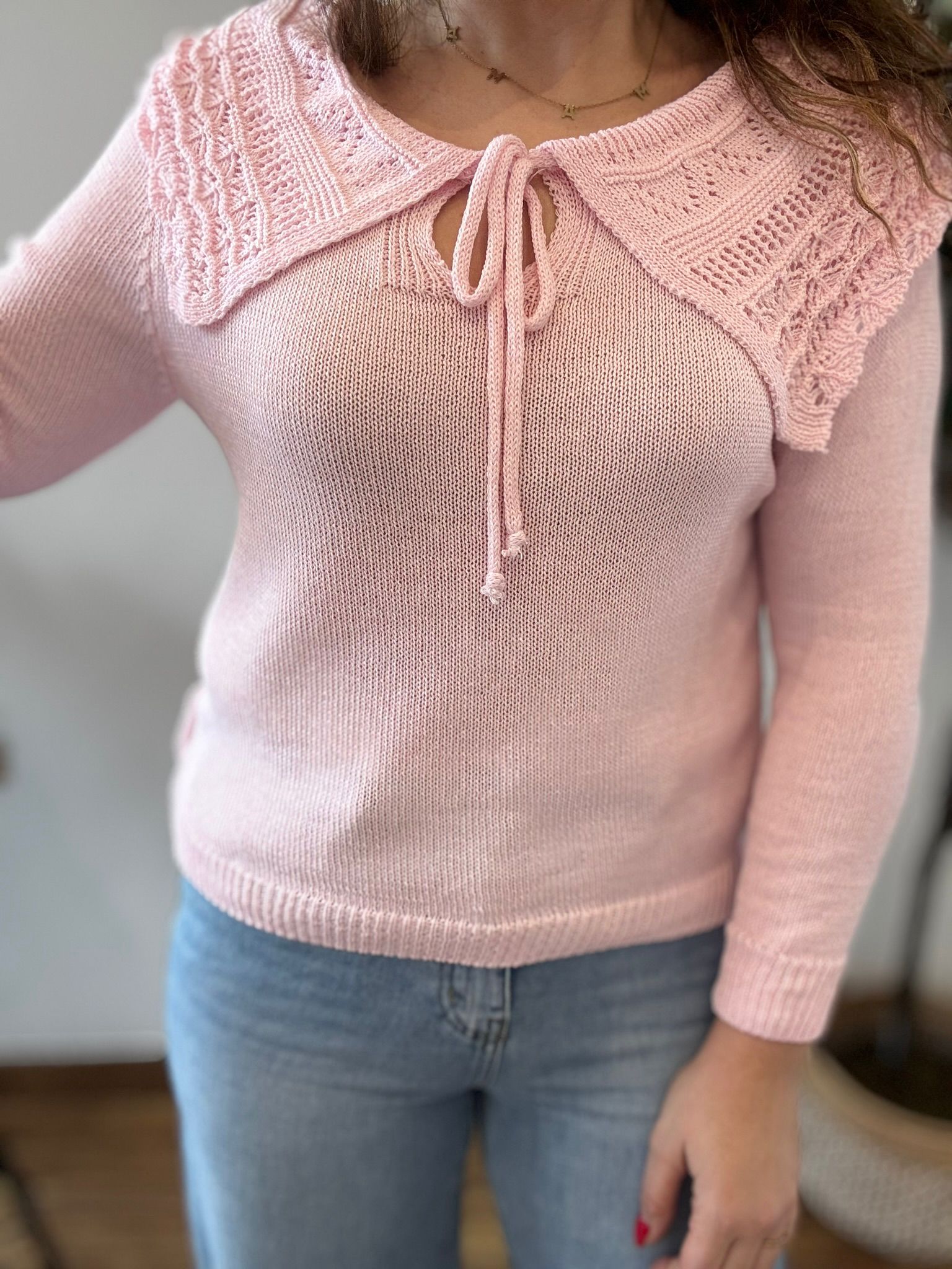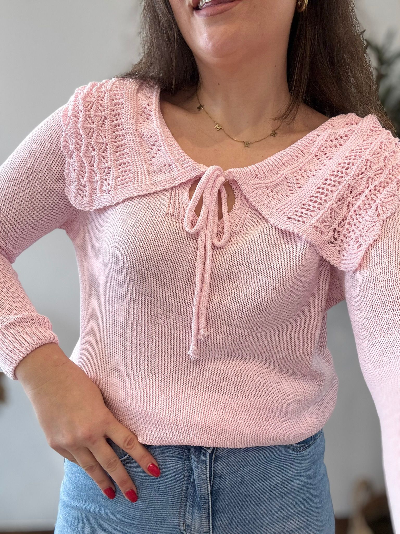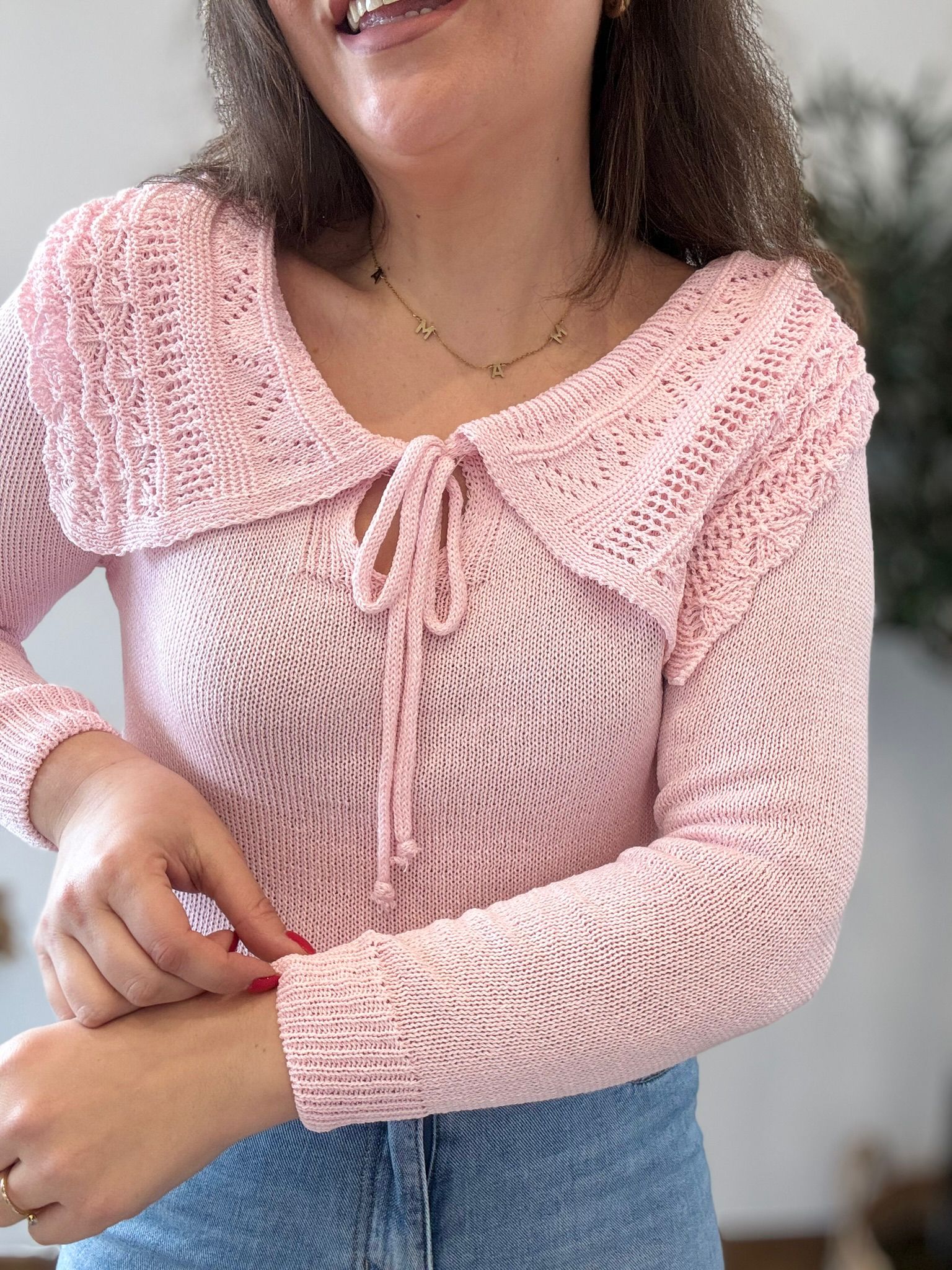 Jersey en hilo de algodón con detalle de cuello babero en crochet y lazada. TU RECOMENDADA 36/44. Ana lleva habitualmente talla L/40. Medidas del jersey: contorno de pecho 115 sin estirar y largo 59cm
