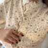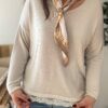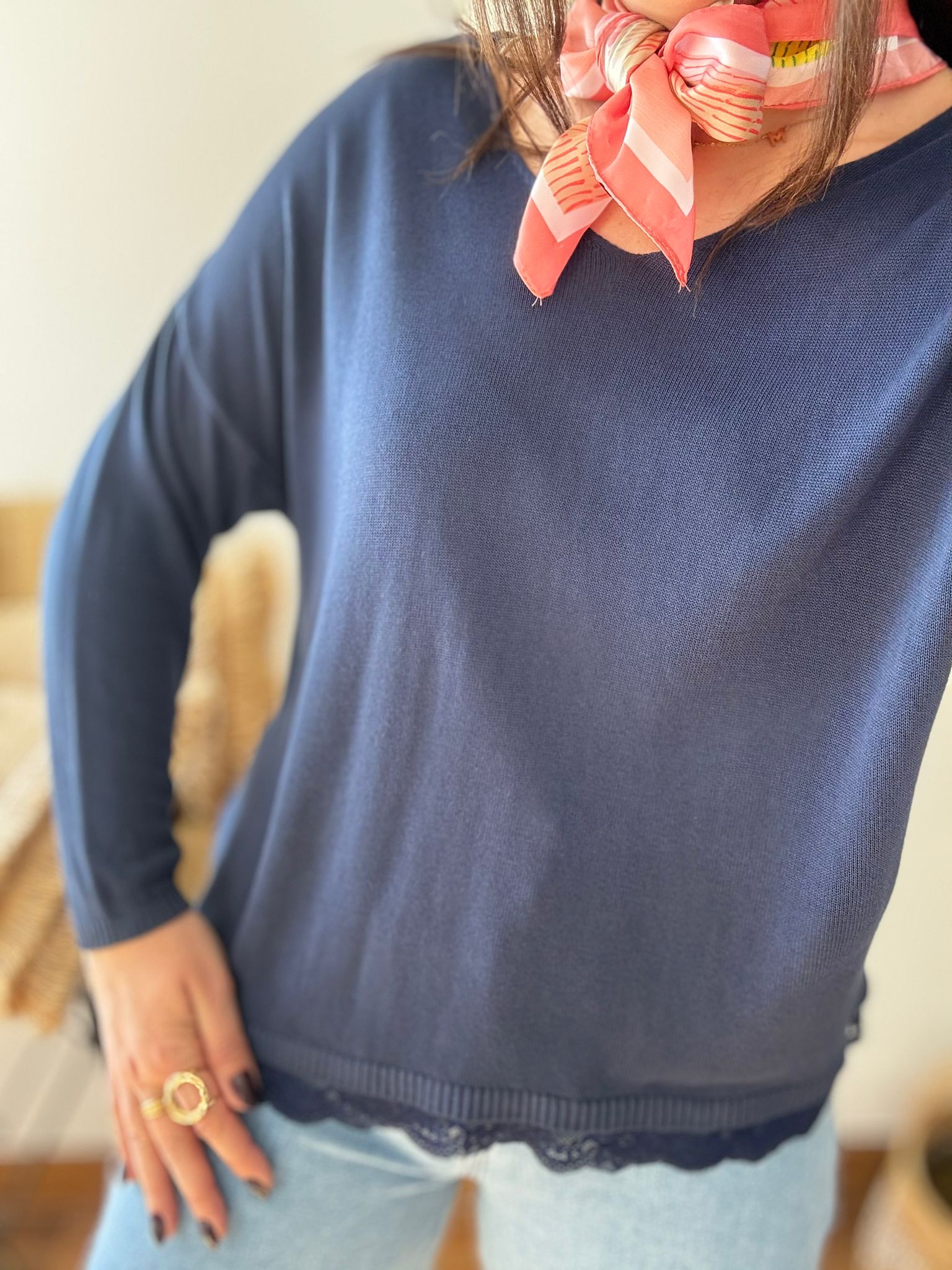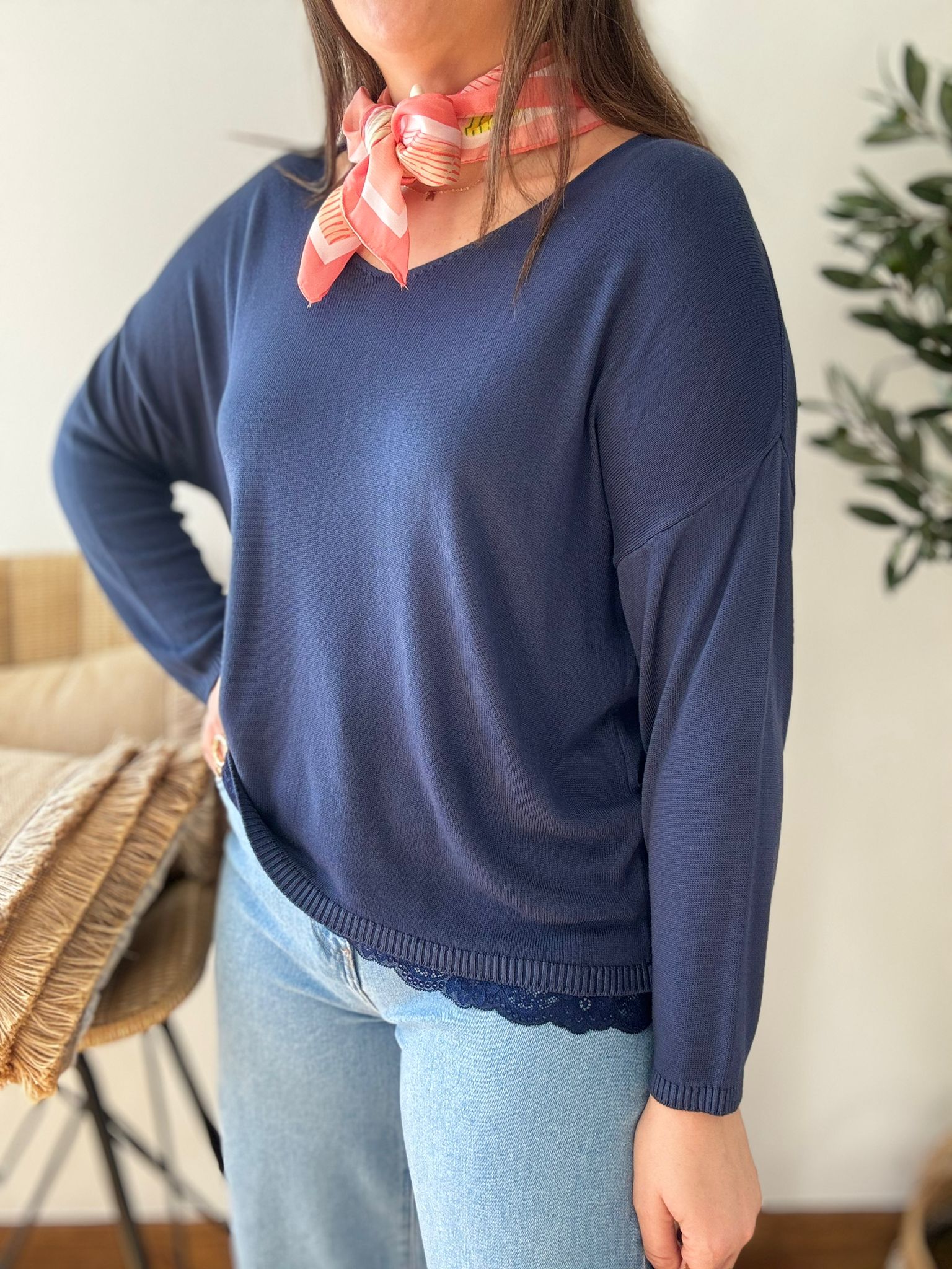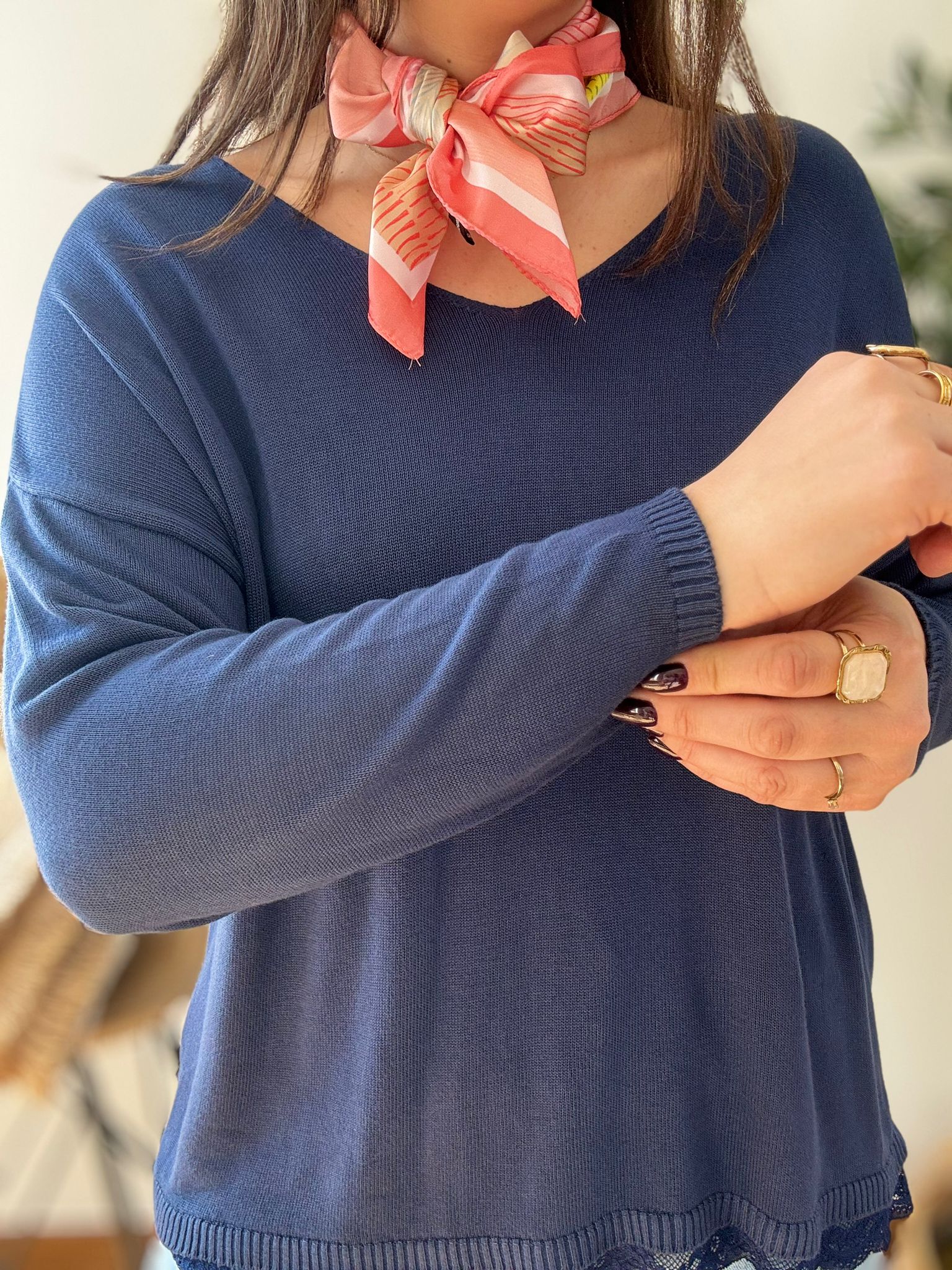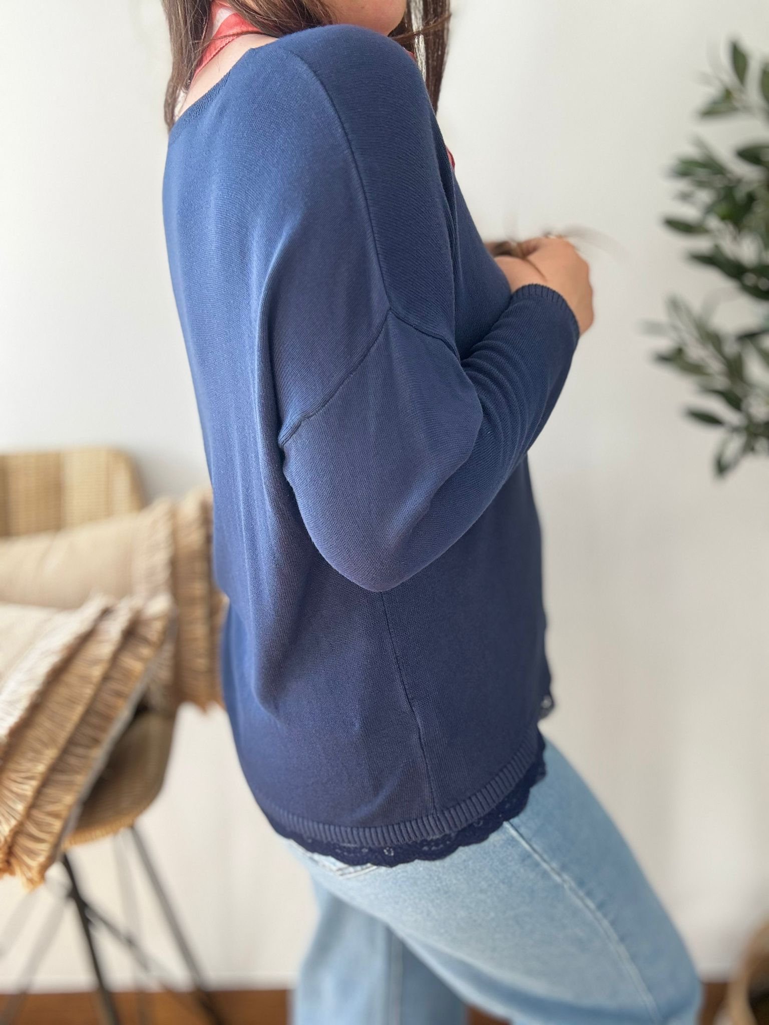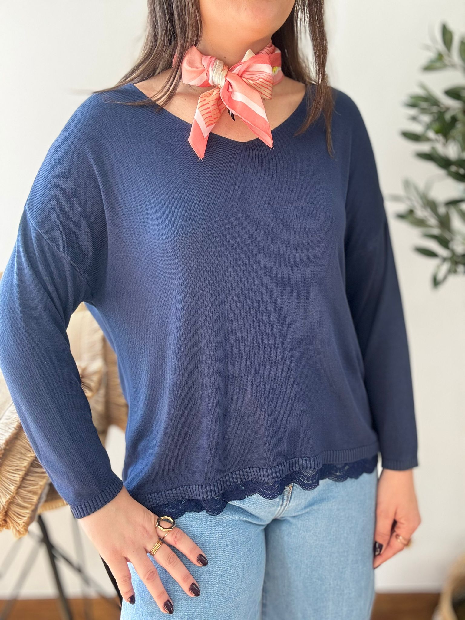 Jersey de hilo con cuello pico y terminación de encaje en la cadera. TU RECOMENDADA 38/44. Ana lleva habitualmente talla L/40. Medida del jersey: contorno de pecho 130 y largo 65cm