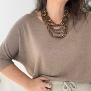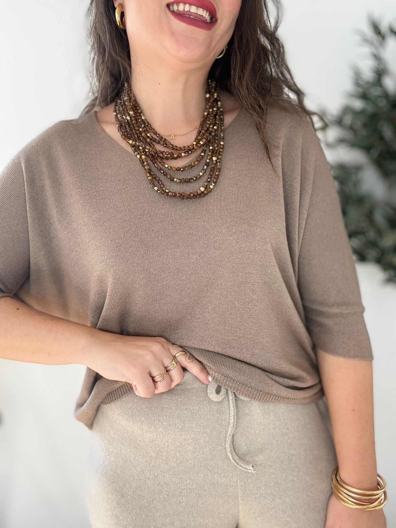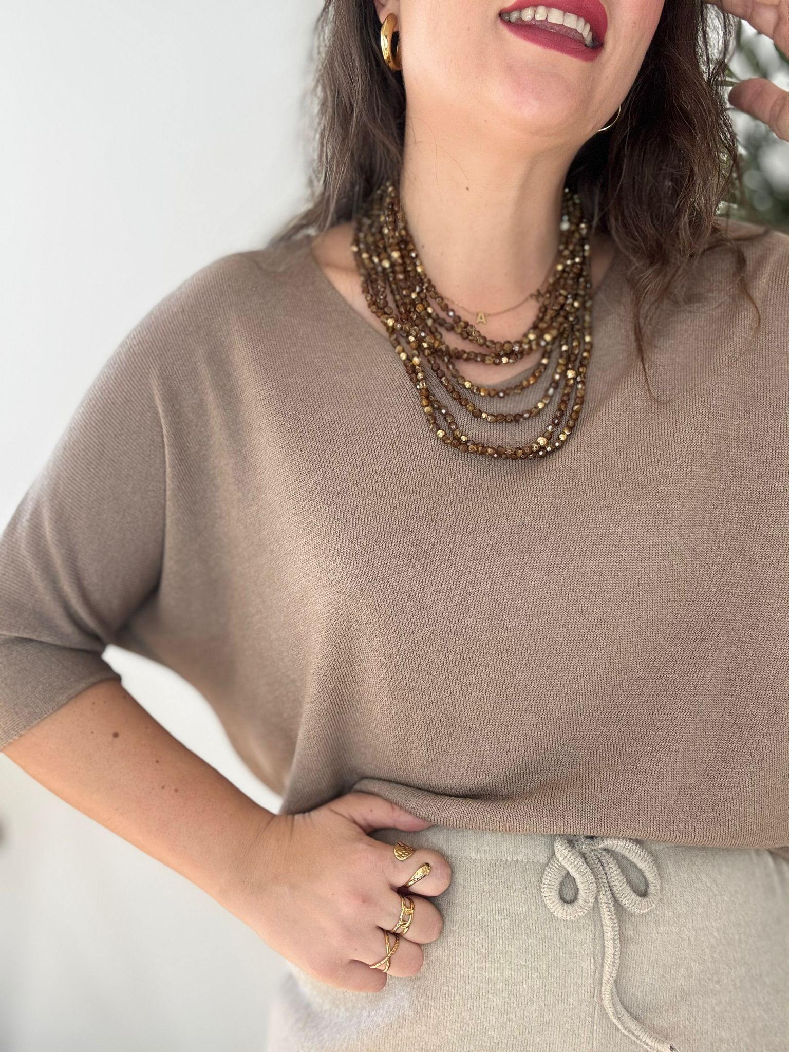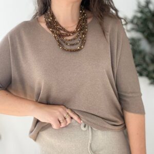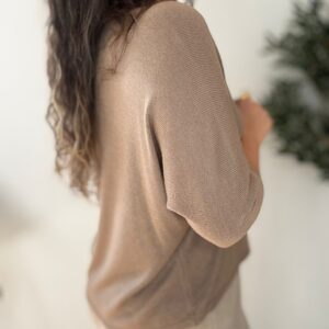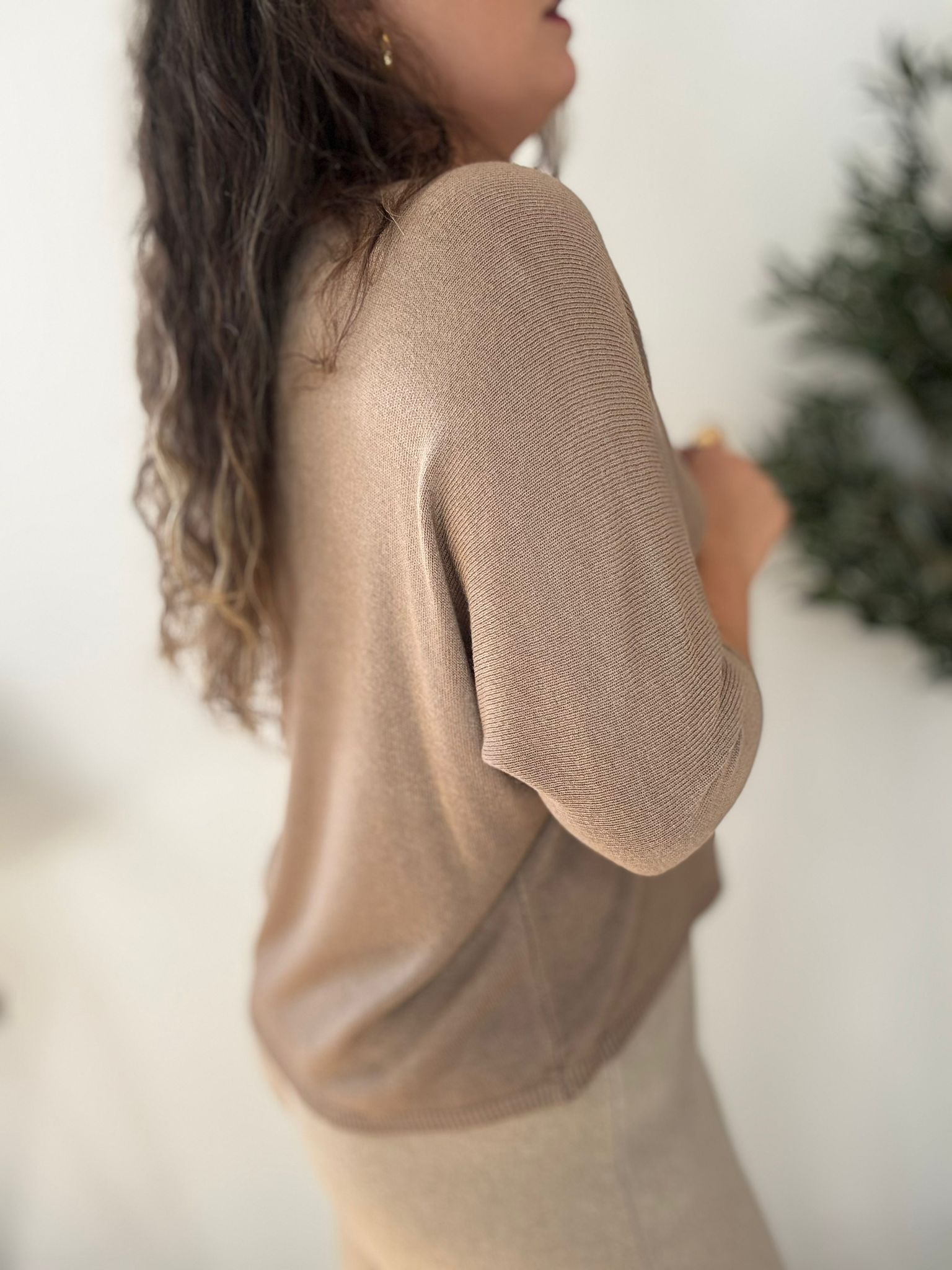 Jersey de punto finito con cuello de pico. TU RECOMENDADA 38/46. Ana lleva habitualmente talla L 40/42. Medidas del jersey: contorno de pecho 140 y largo 57cm