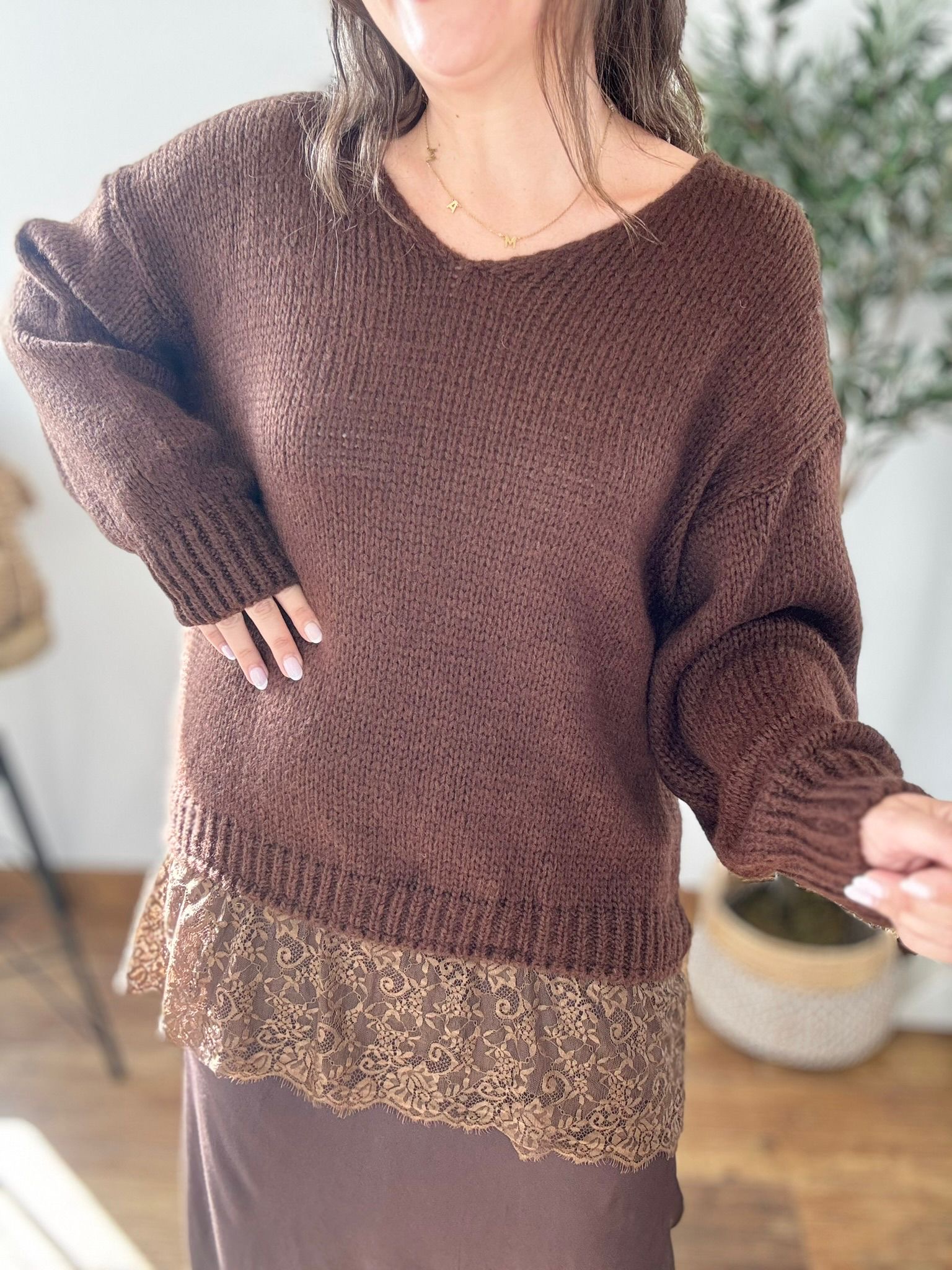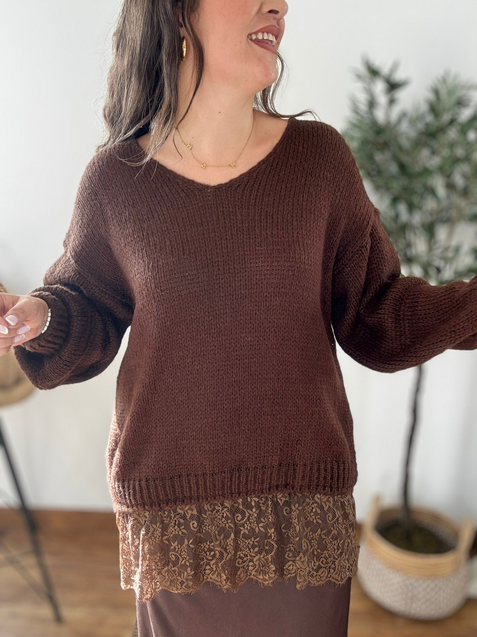 Maxi jersey de lana suave que no pica con cuello pico y bajos de encaje del mismo color. Es bastante oversize. TU RECOMENDADA 38/50. También se puede utilizar como vestido! Ana lleva habitualmente talla L y mide 1.71m. Medidas del jersey: contorno de pecho 130 y largo hasta abajo 77cm