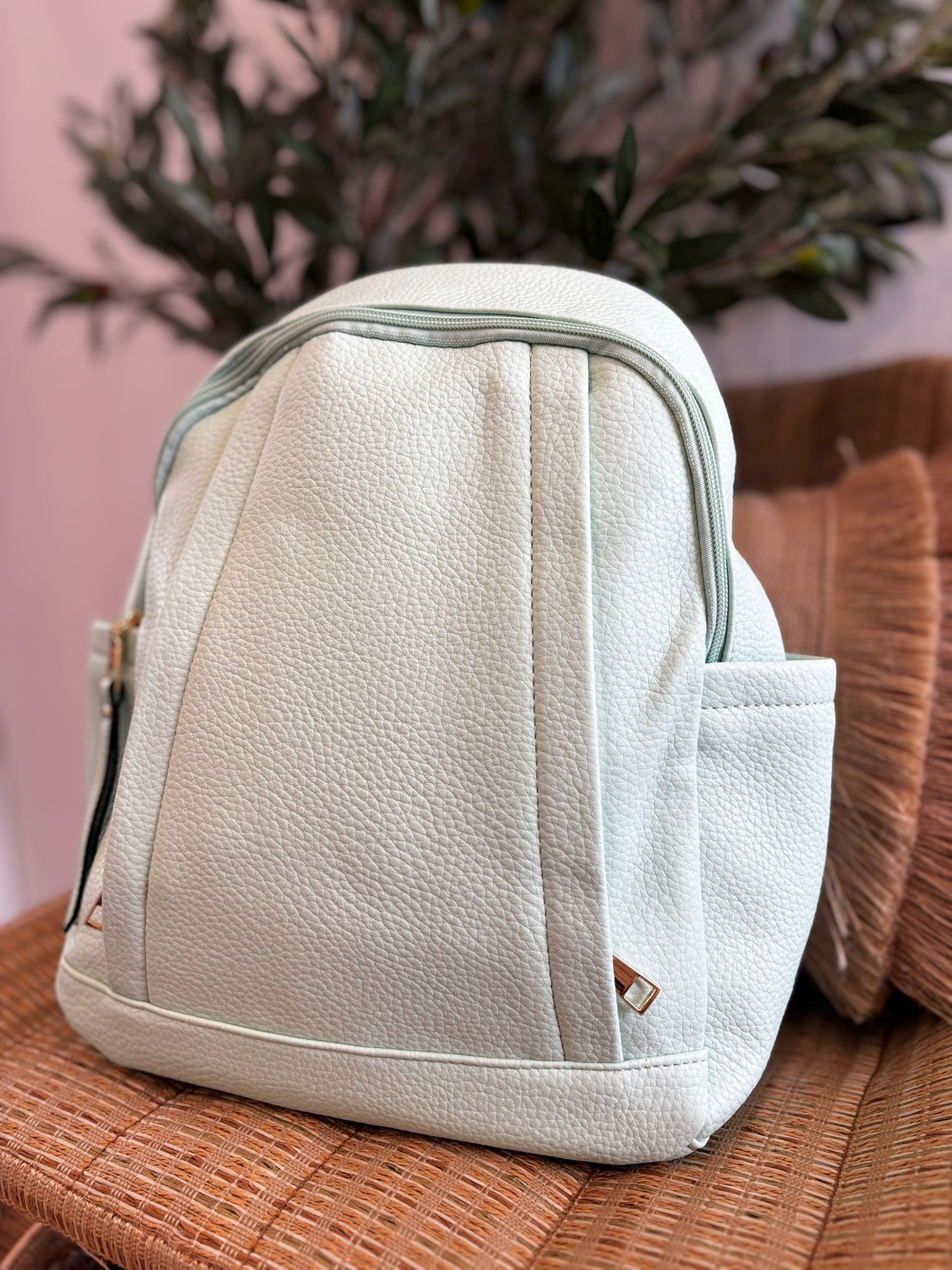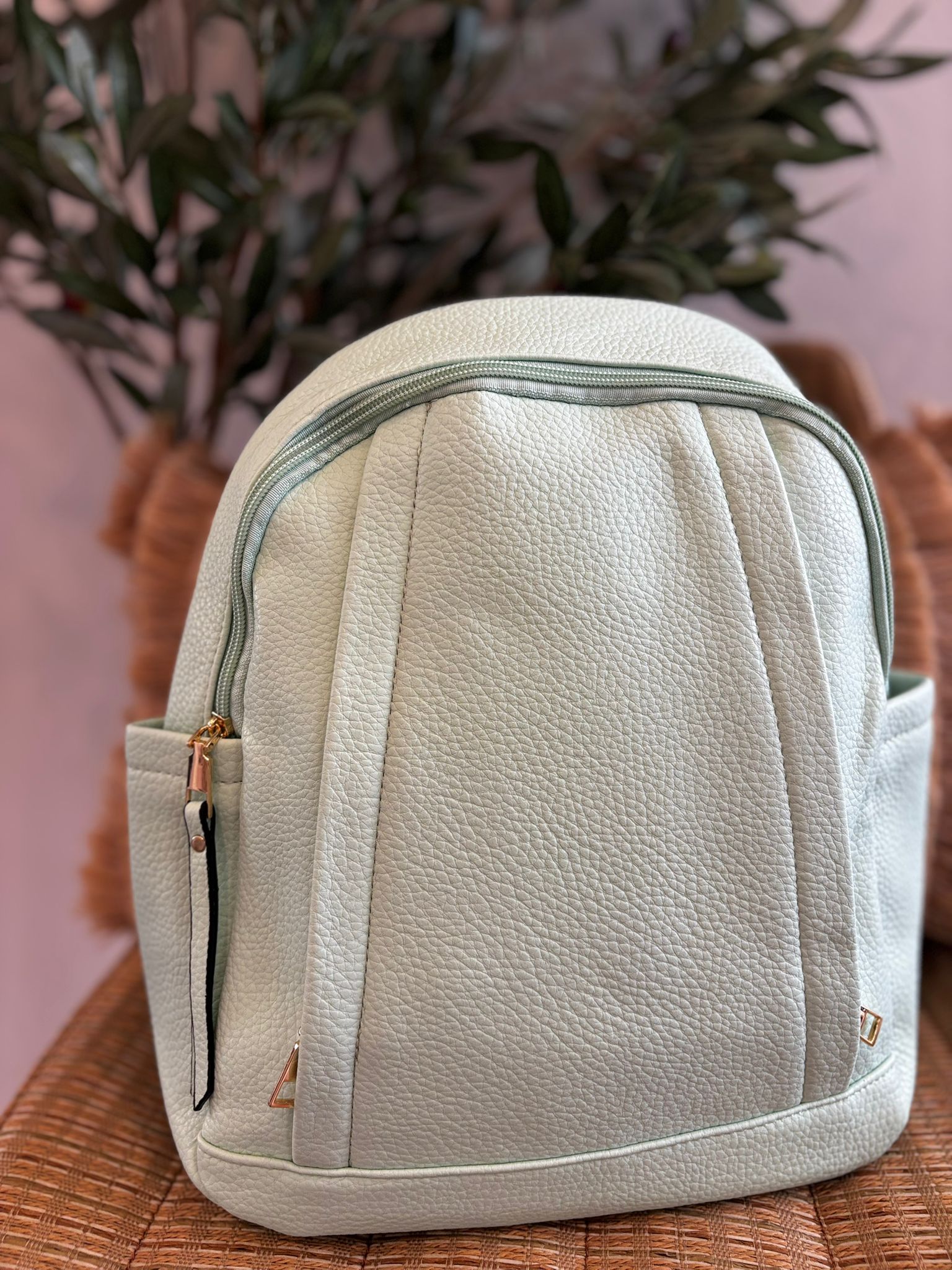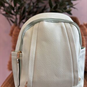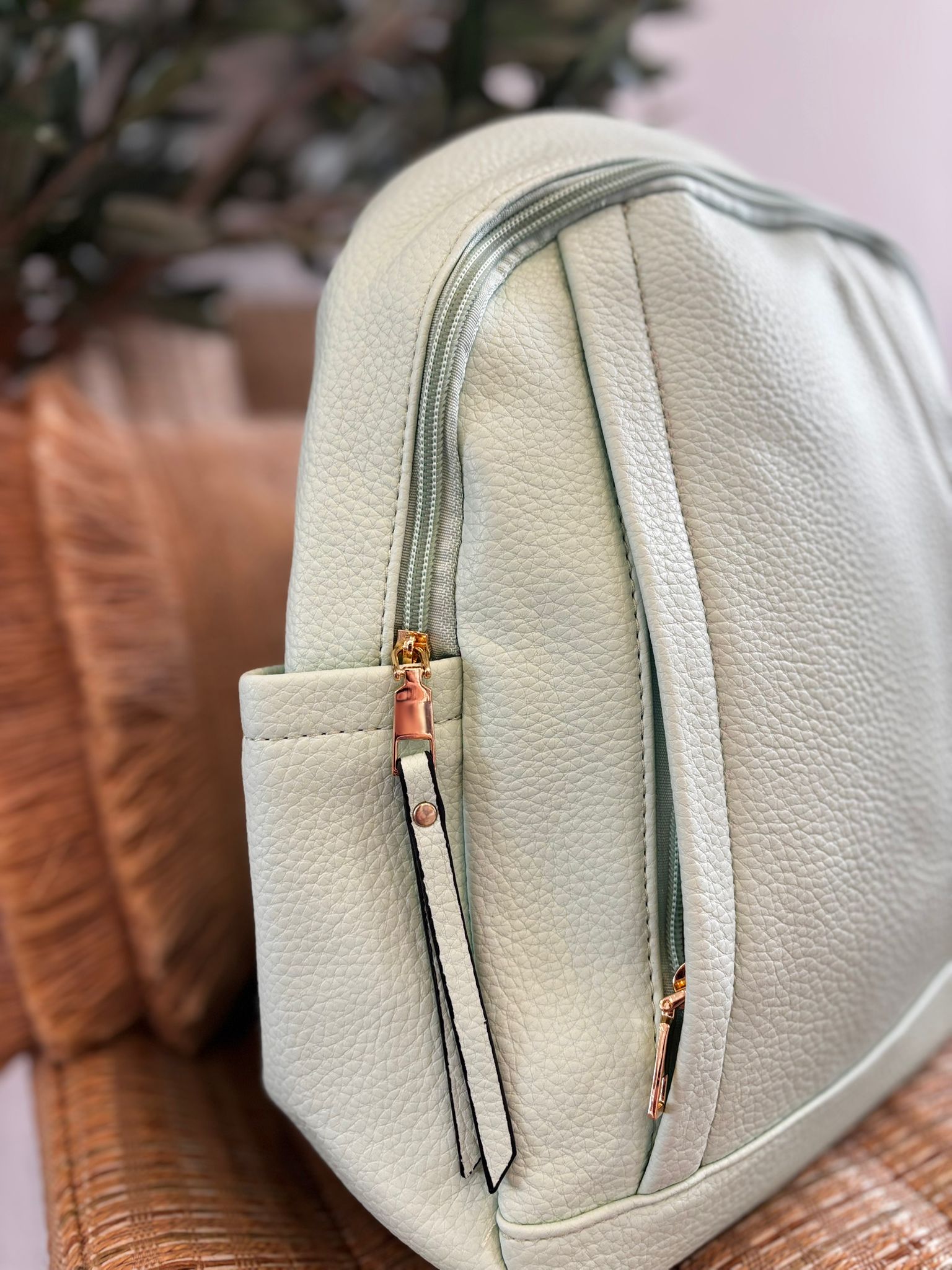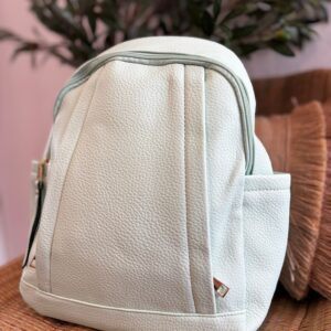 Mochila de polipiel con cremalleras exteriores e interiores. Cierre de cremallera. Medidas aproximadas 36×39