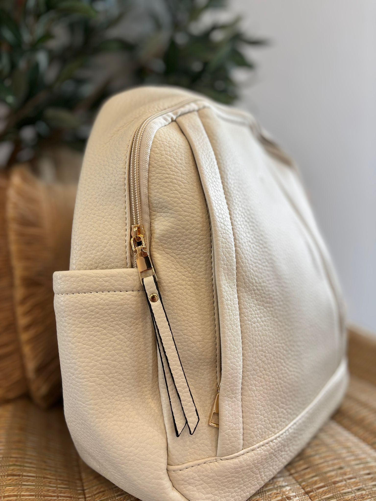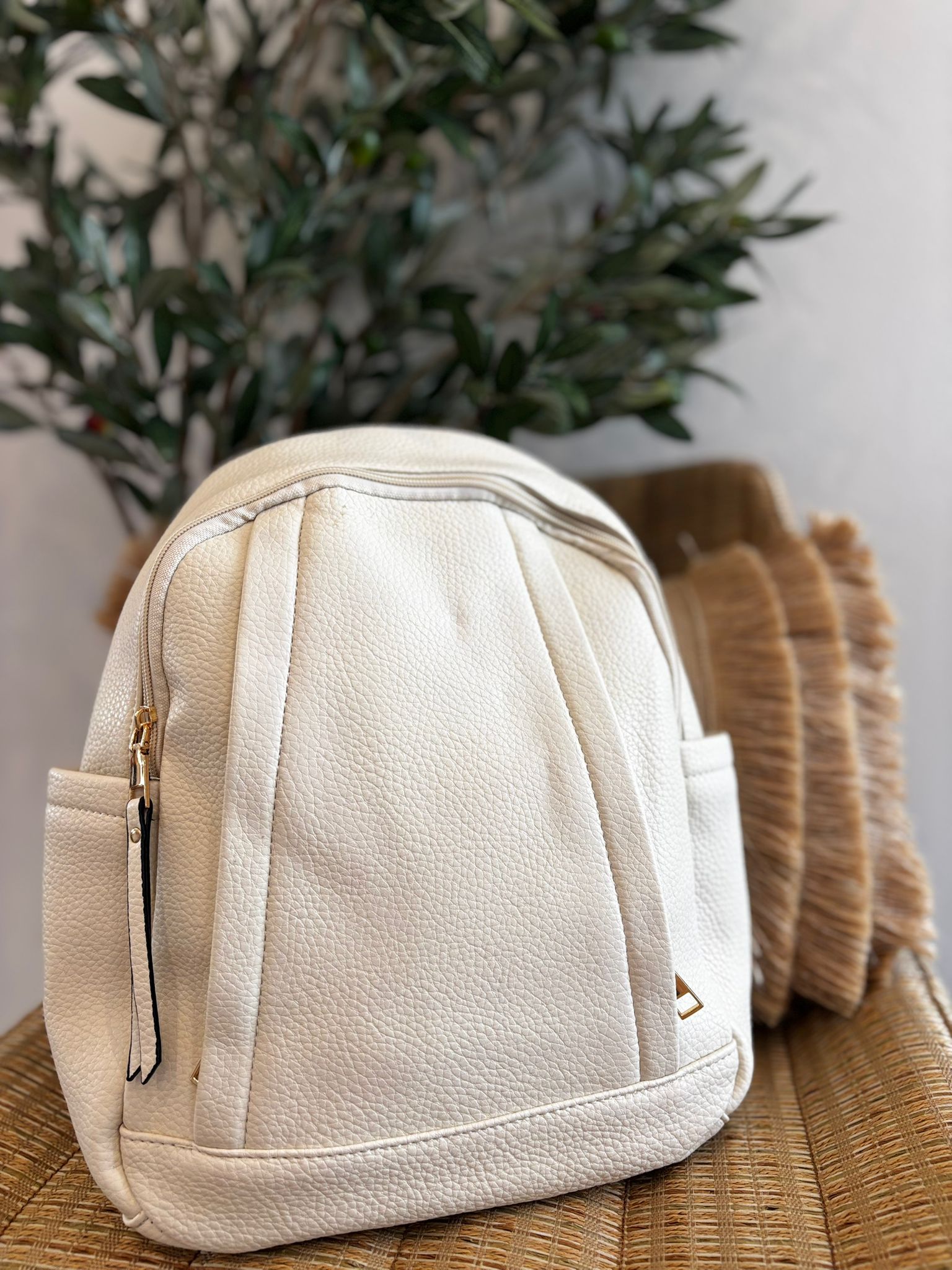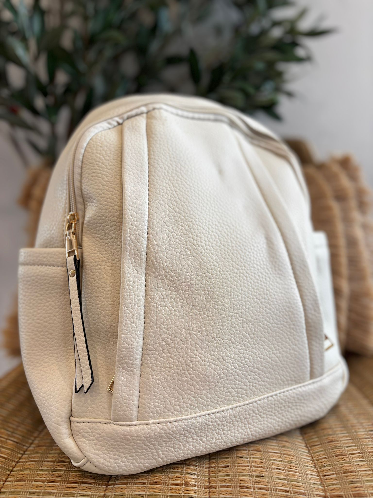 Mochila de polipiel con cremalleras exteriores e interiores. Cierre de cremallera. Medidas aproximadas 36×39