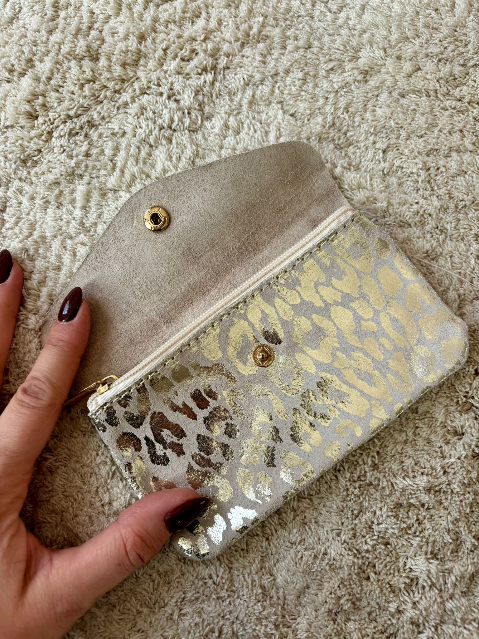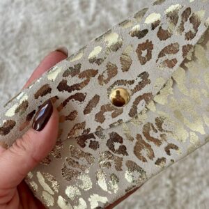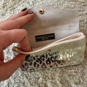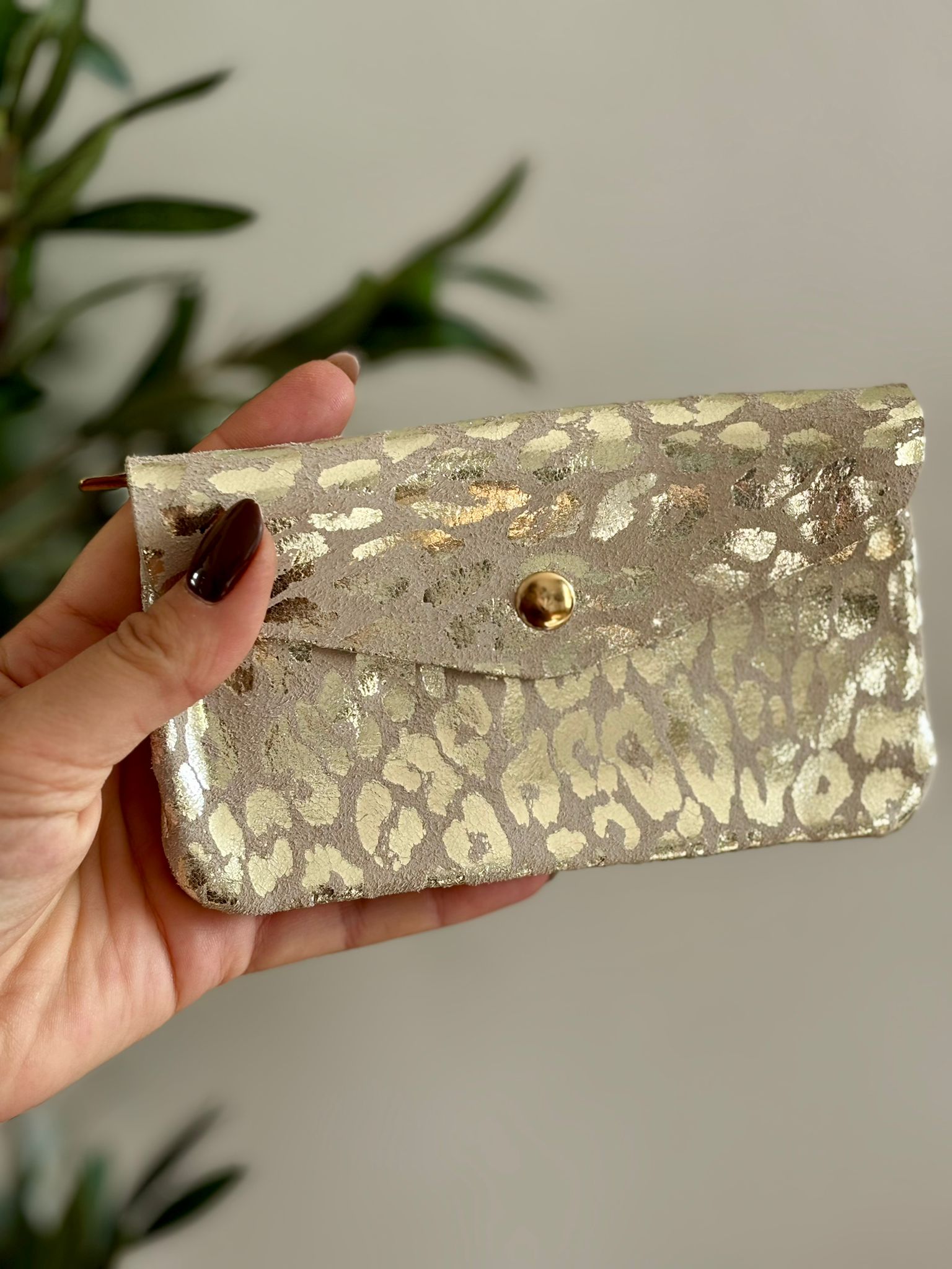 Monedero de piel estampado metalizado. Tiene varios compartimentos y cierre de clip y cremallera