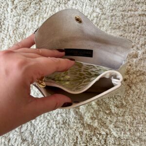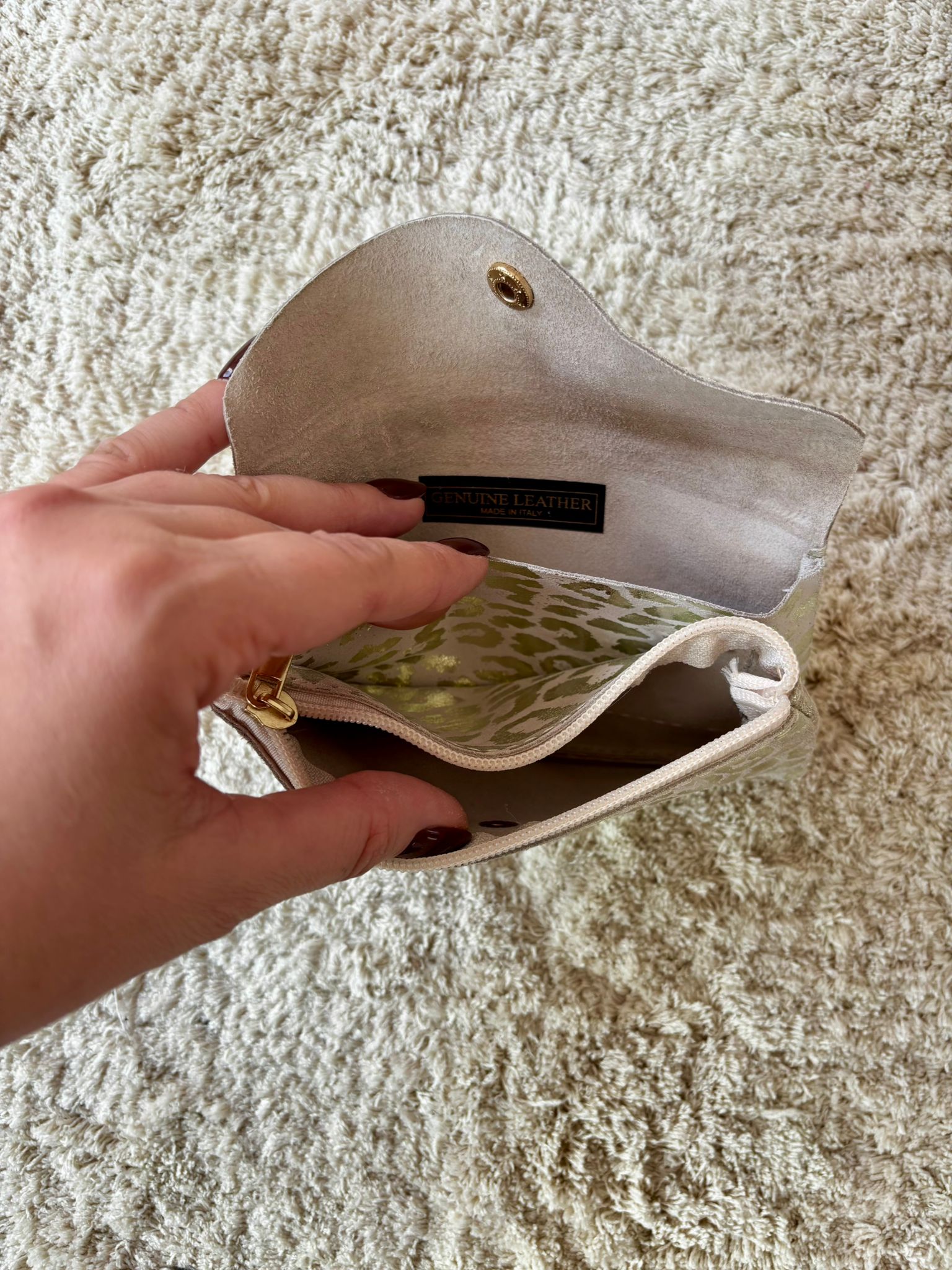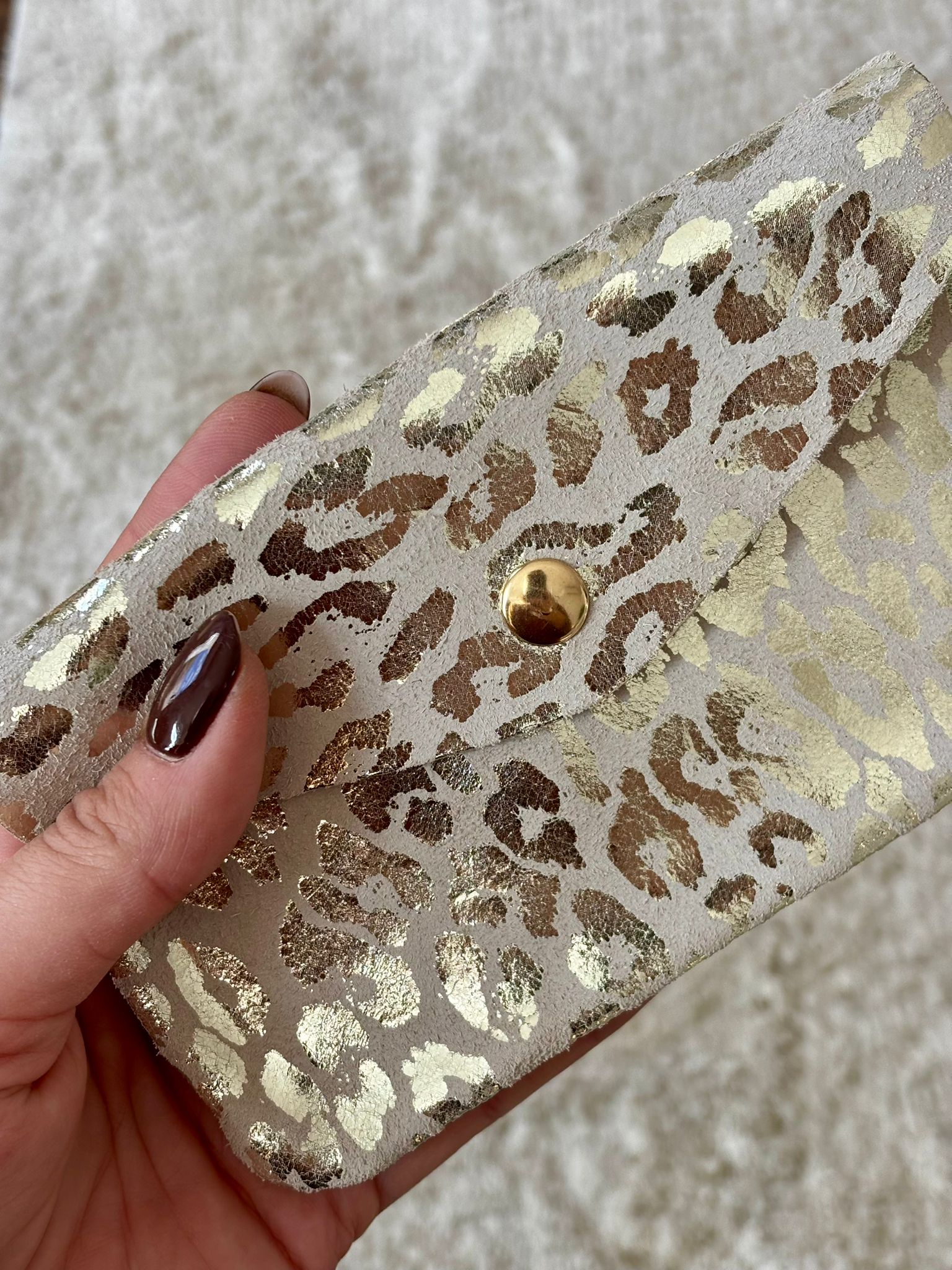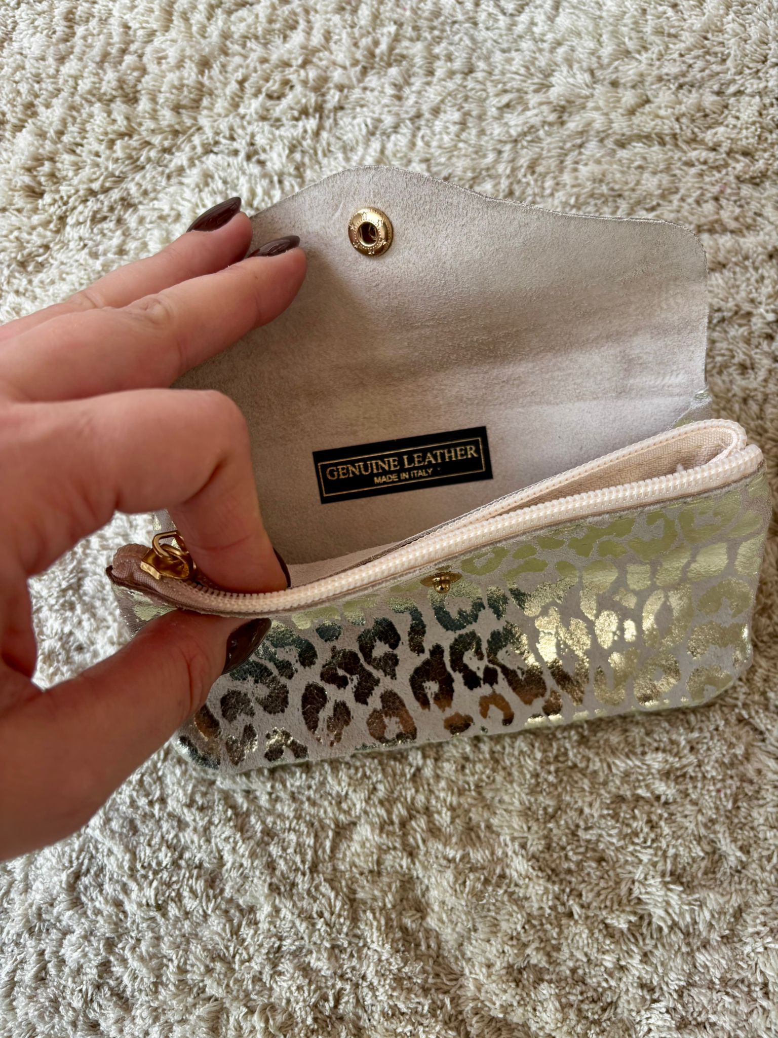 Monedero de piel estampado metalizado. Tiene varios compartimentos y cierre de clip y cremallera