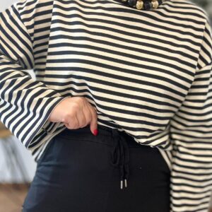 Pantalón fluido tipo deportivo de algodón con cintura elástica y cinta para ceñir. Lleva bolsillos. TU RECOMENDADA 36/44. Ana lleva habitualmente talla L/40 y mide 1.71m. Medidas del pantalón: cintura estirada 120, cadera 120 y largo 101cm