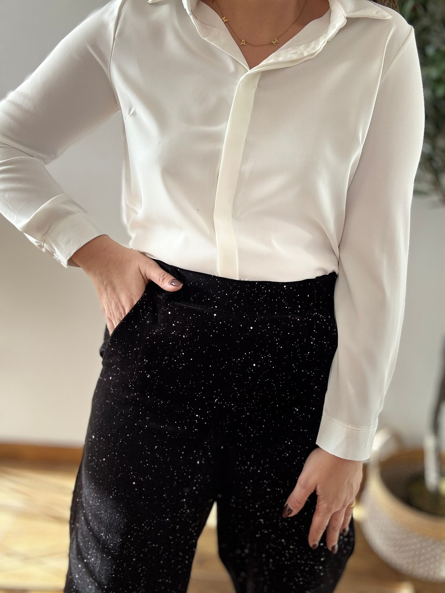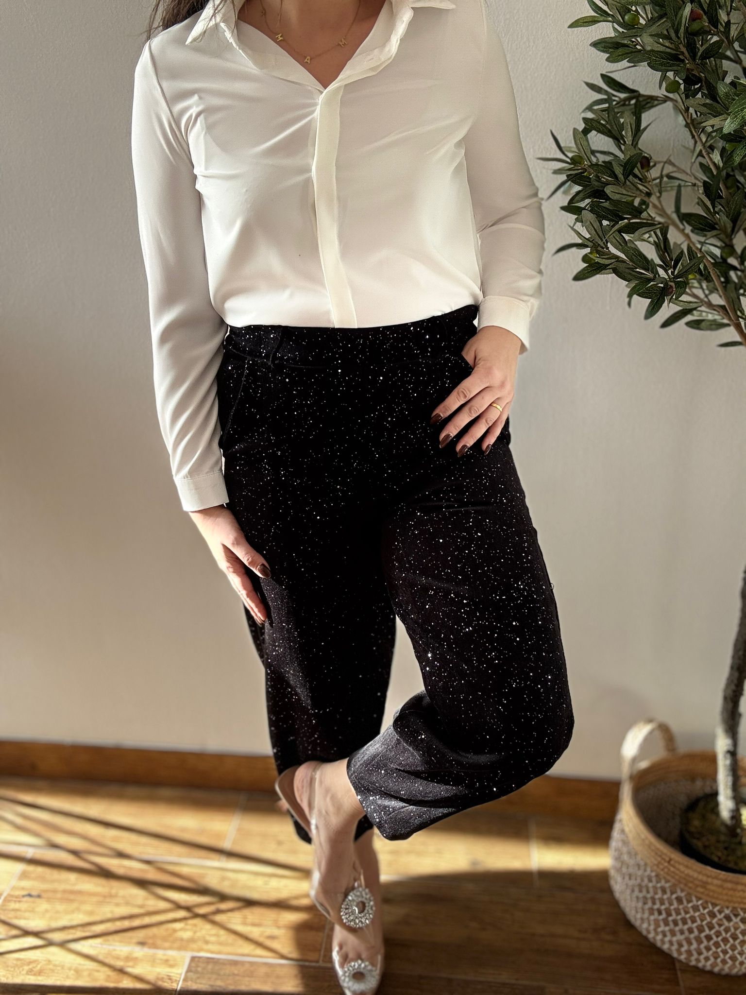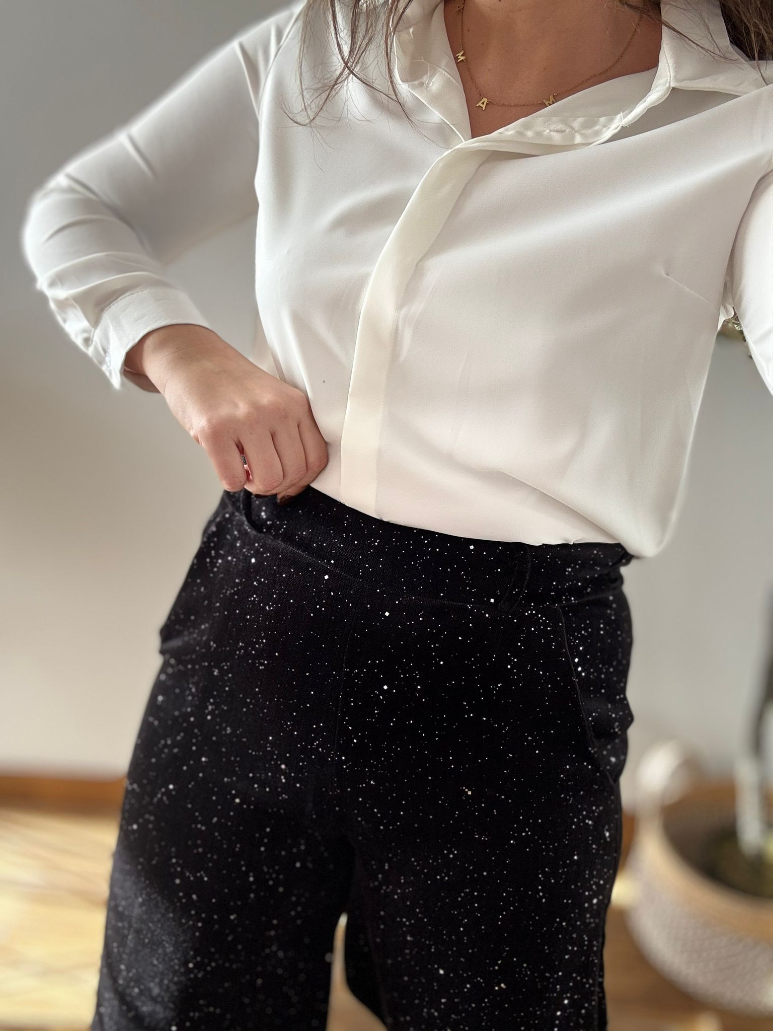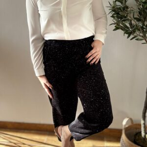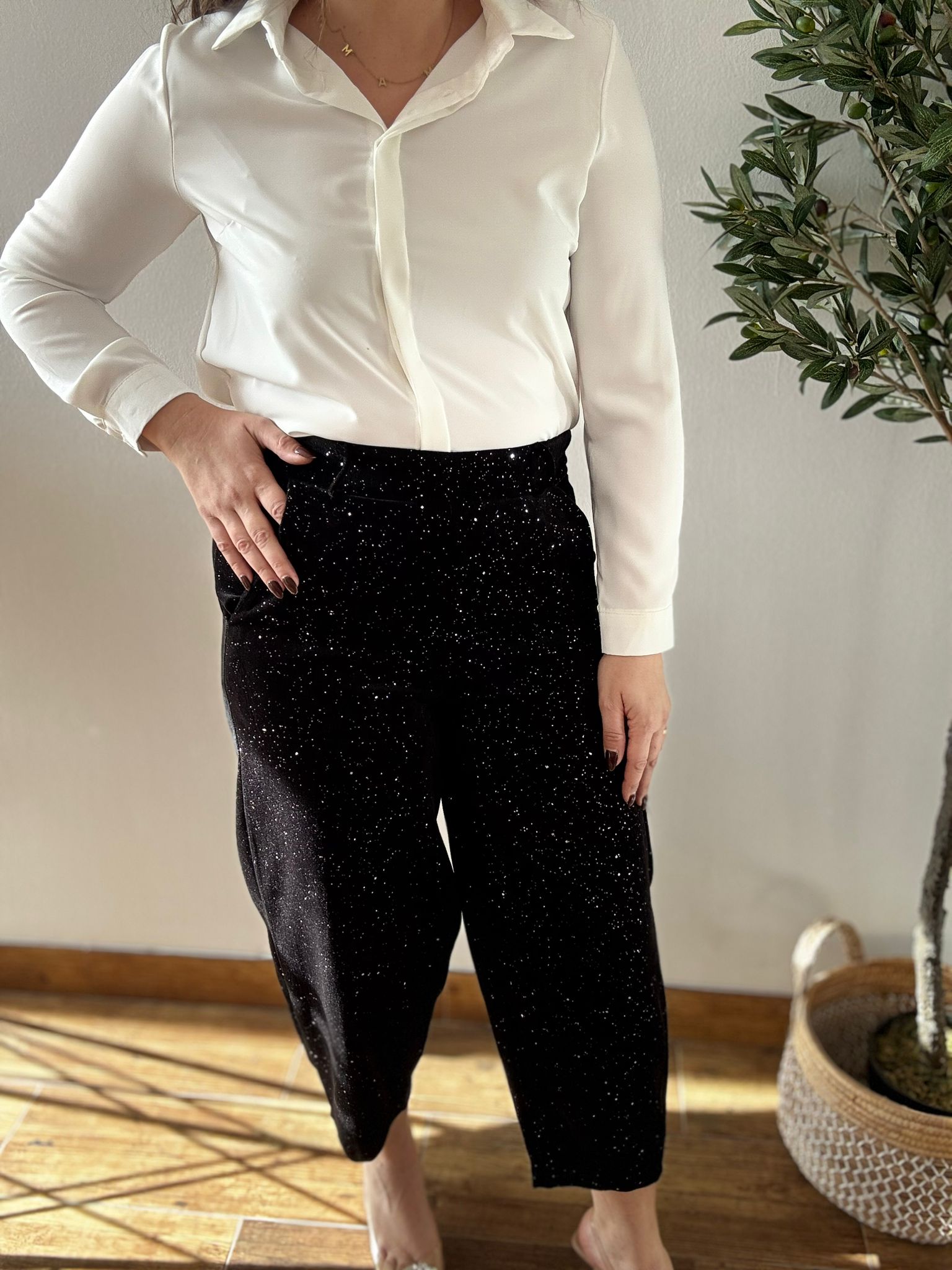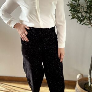 pantalones de tejido grueso tipo baggy con goma en la cintura y bolsillos. Llevan destellos de brillo en plateado. TU RECOMENDADA 36/40. Ana lleva habitualmente talla 40/42 y mide 1.71m Medidas del pantalón: cintura estirada 100, cadera 120, largo 89cm