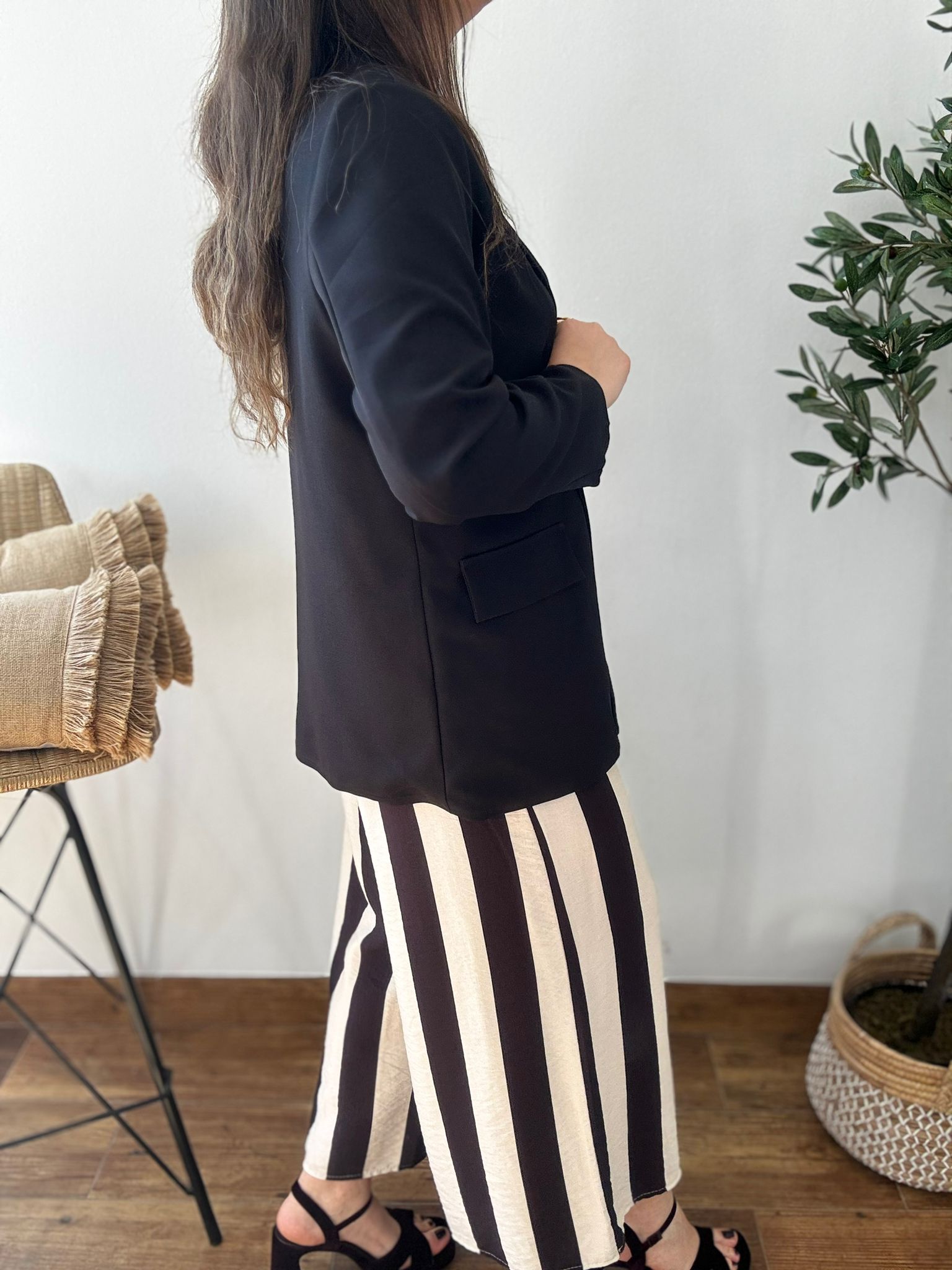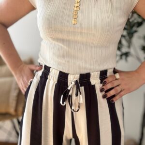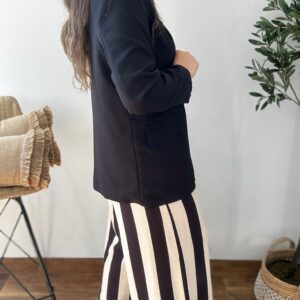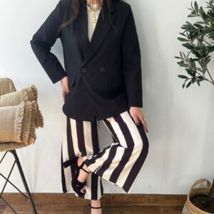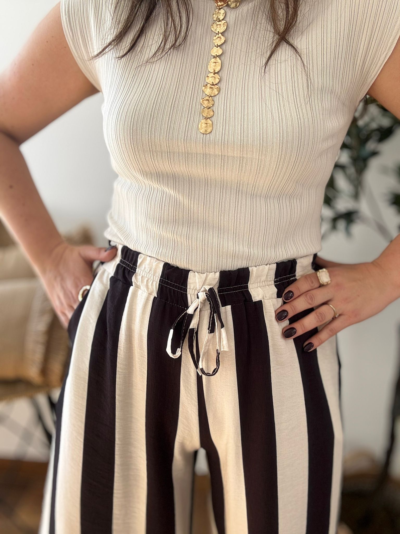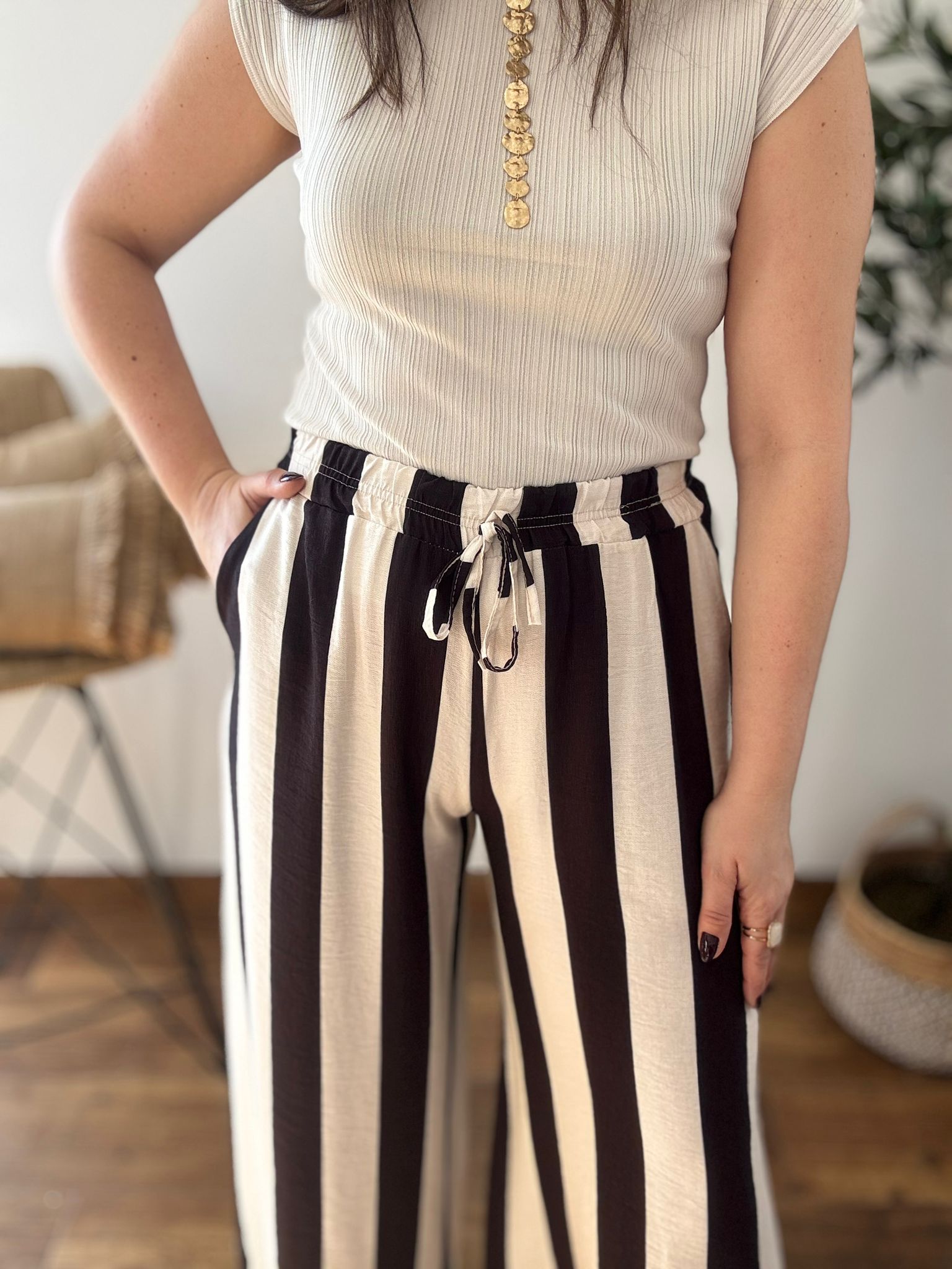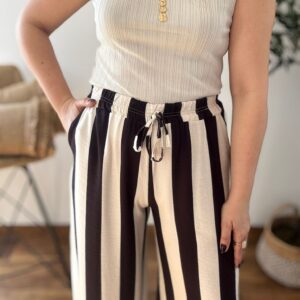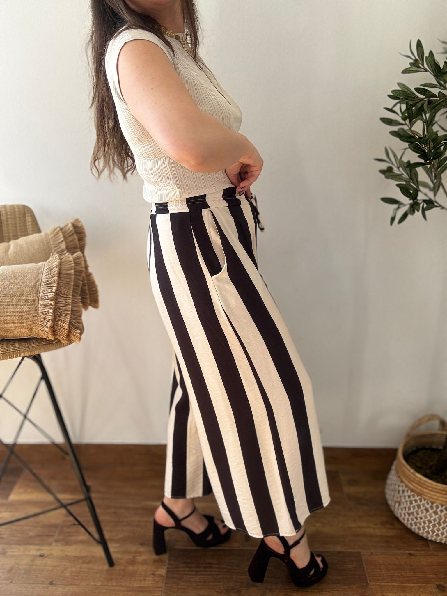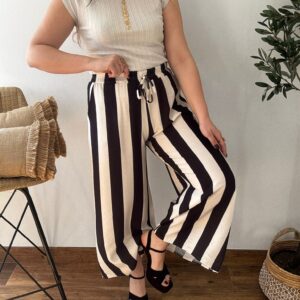 Pantalones fluidos estampados a rayas con pierna ancha. TU RECOMENDADA 36/42. Tiene cintura elástica y bolsillos. Ana lleva habitualmente talla L/40 y mide 1.71m