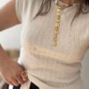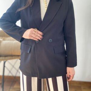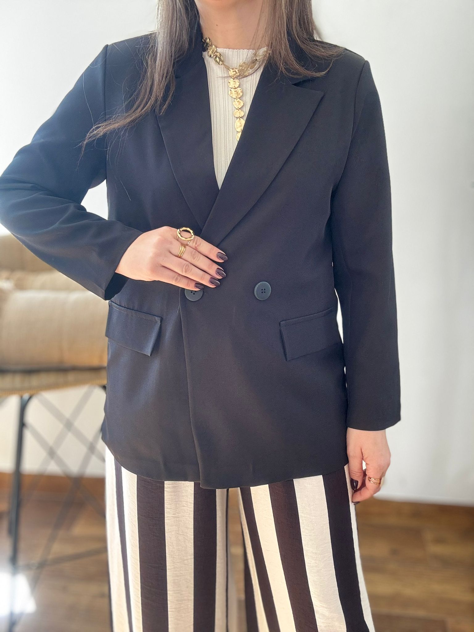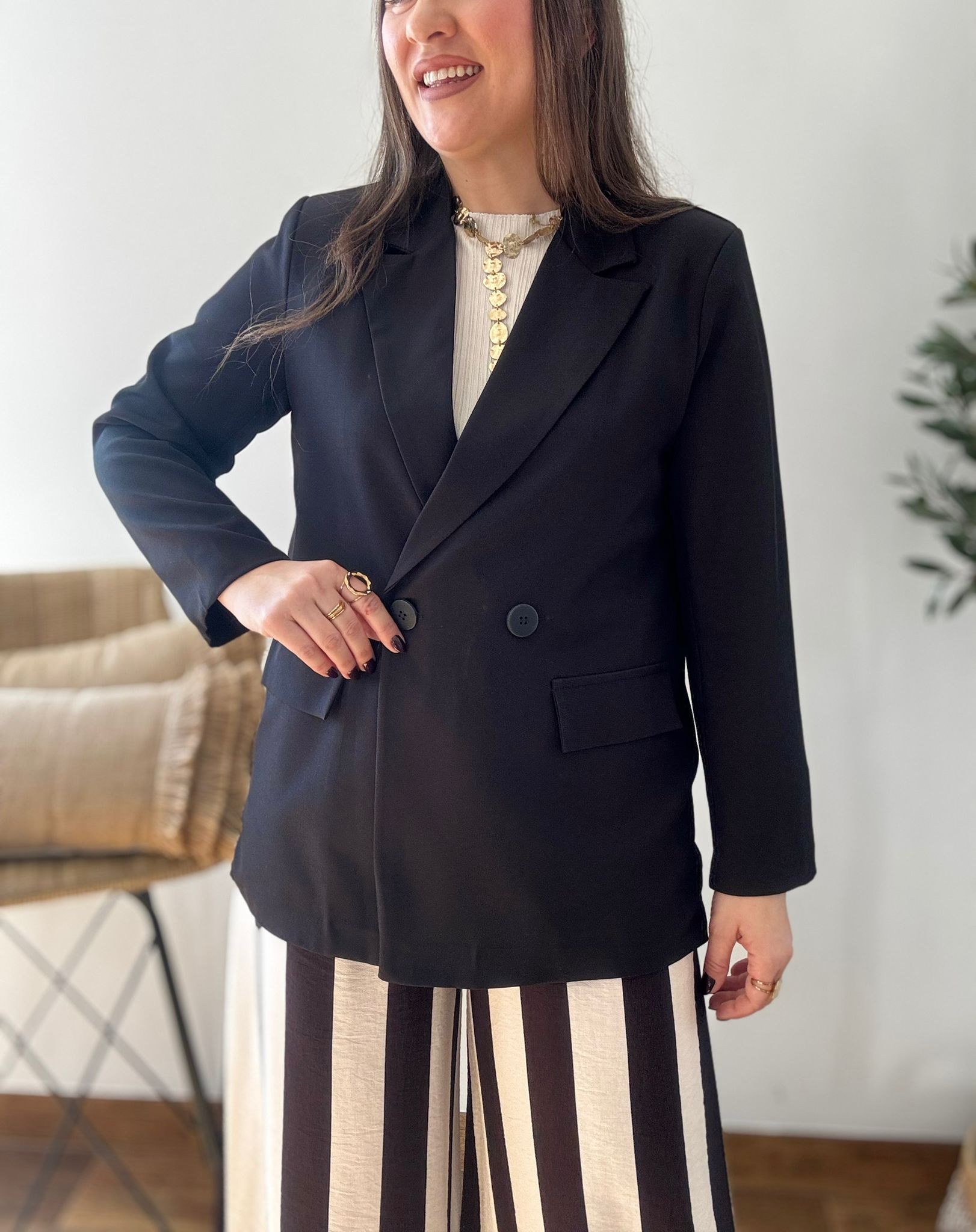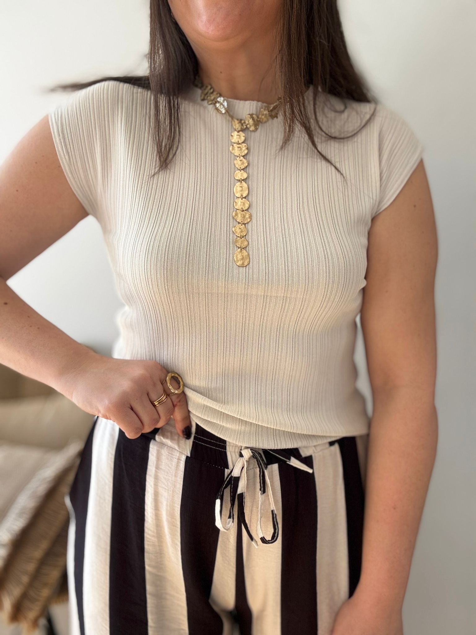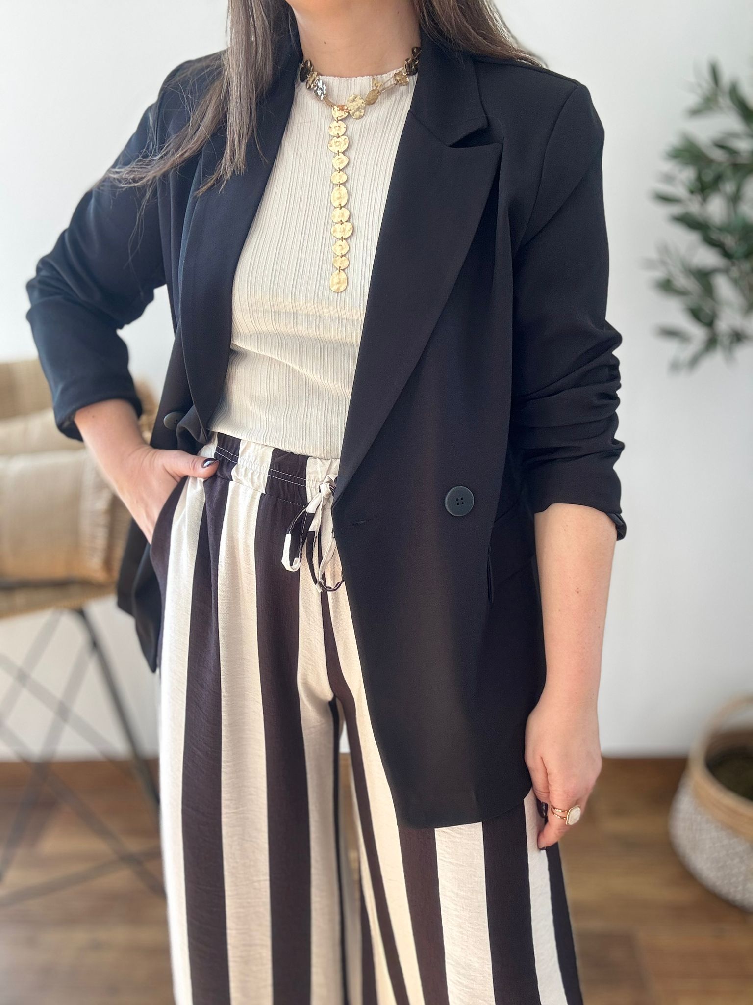 Pantalones fluidos estampados a rayas con pierna ancha. TU RECOMENDADA 36/42. Tiene cintura elástica y bolsillos. Ana lleva habitualmente talla L/40 y mide 1.71m
