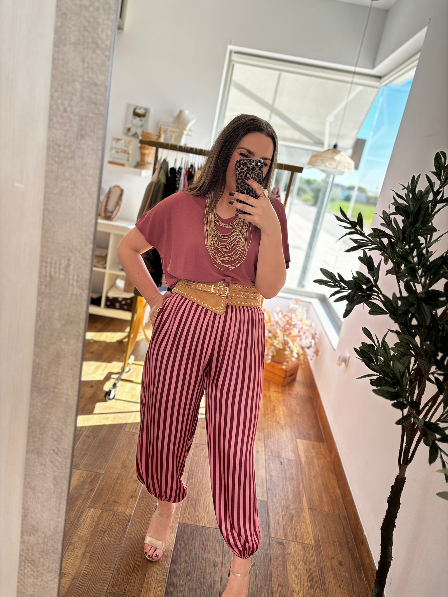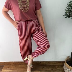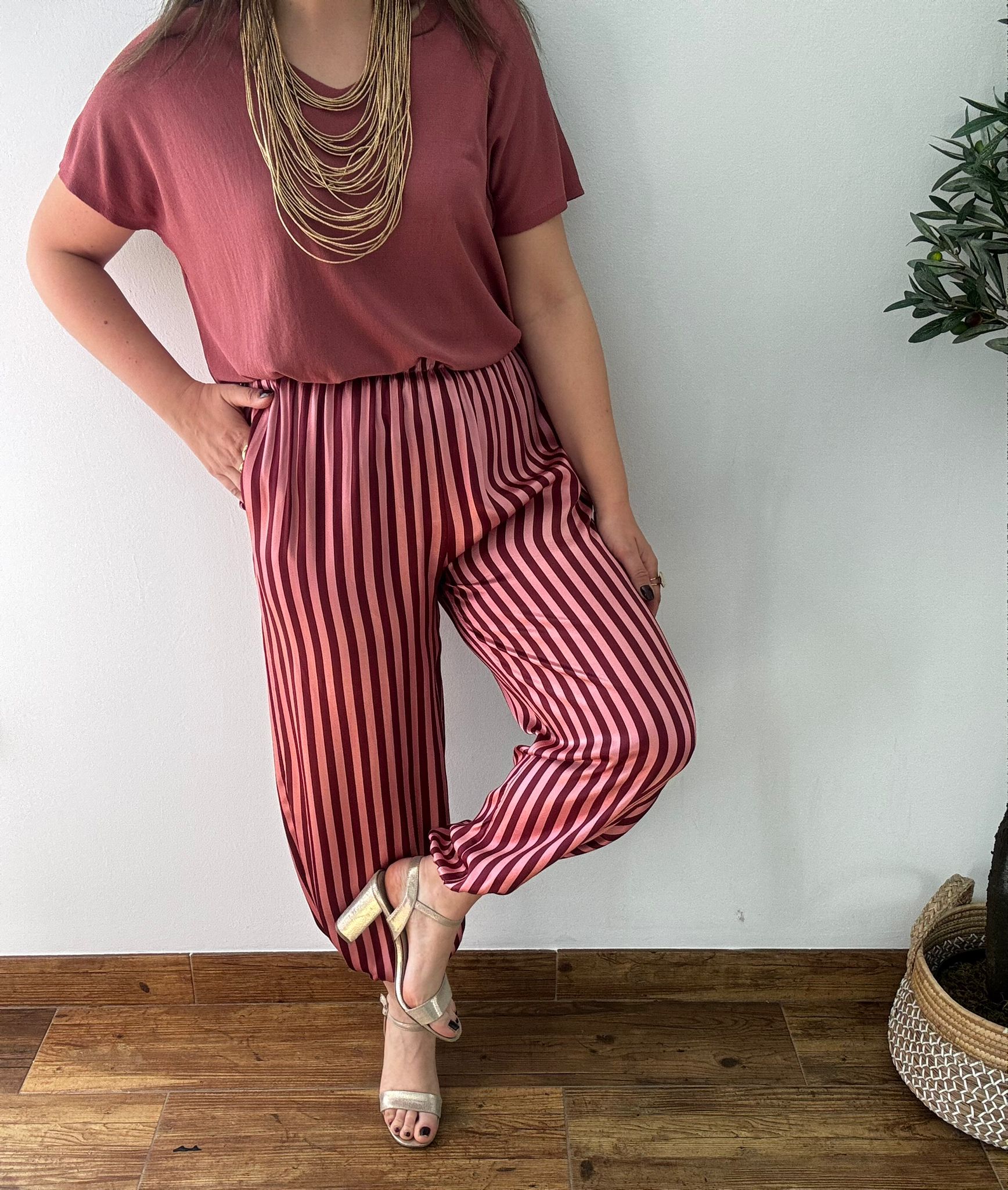 Pantalones satinados en tallas súper tendencia tipo bombacho. Lleva bolsillos y goma en la cintura y el tobillo.