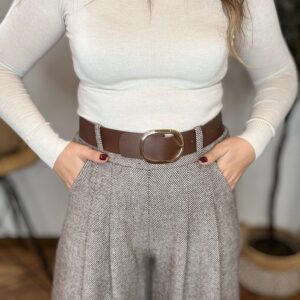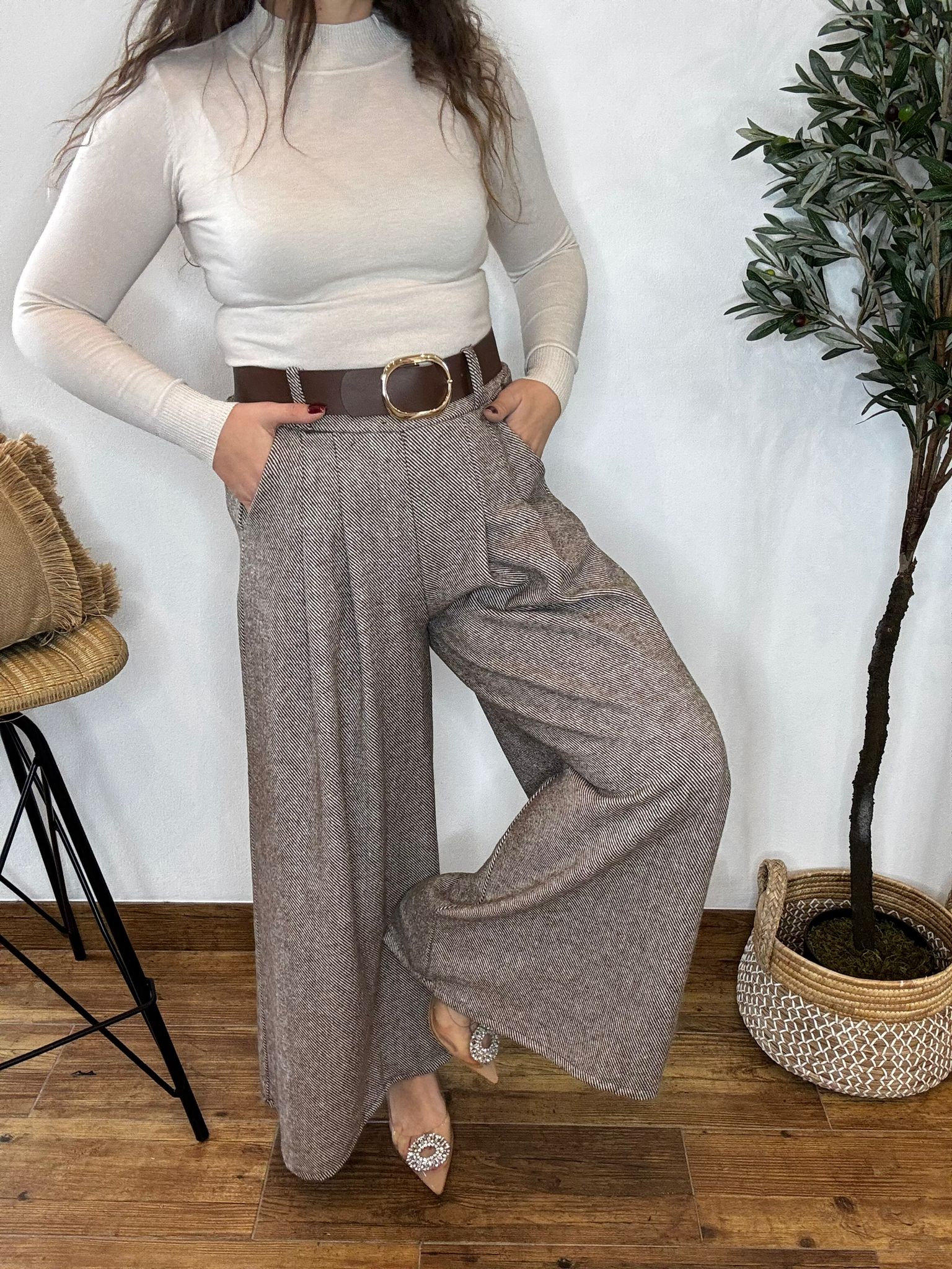 Pantalones con pinzas y bolsillos de pierna ancha en tejido gordito calentito. TU RECOMENDADA 36/42. Medidas del pantalón: cintura estirada 100, cadera 120 y largo 105. Cinturón incluido