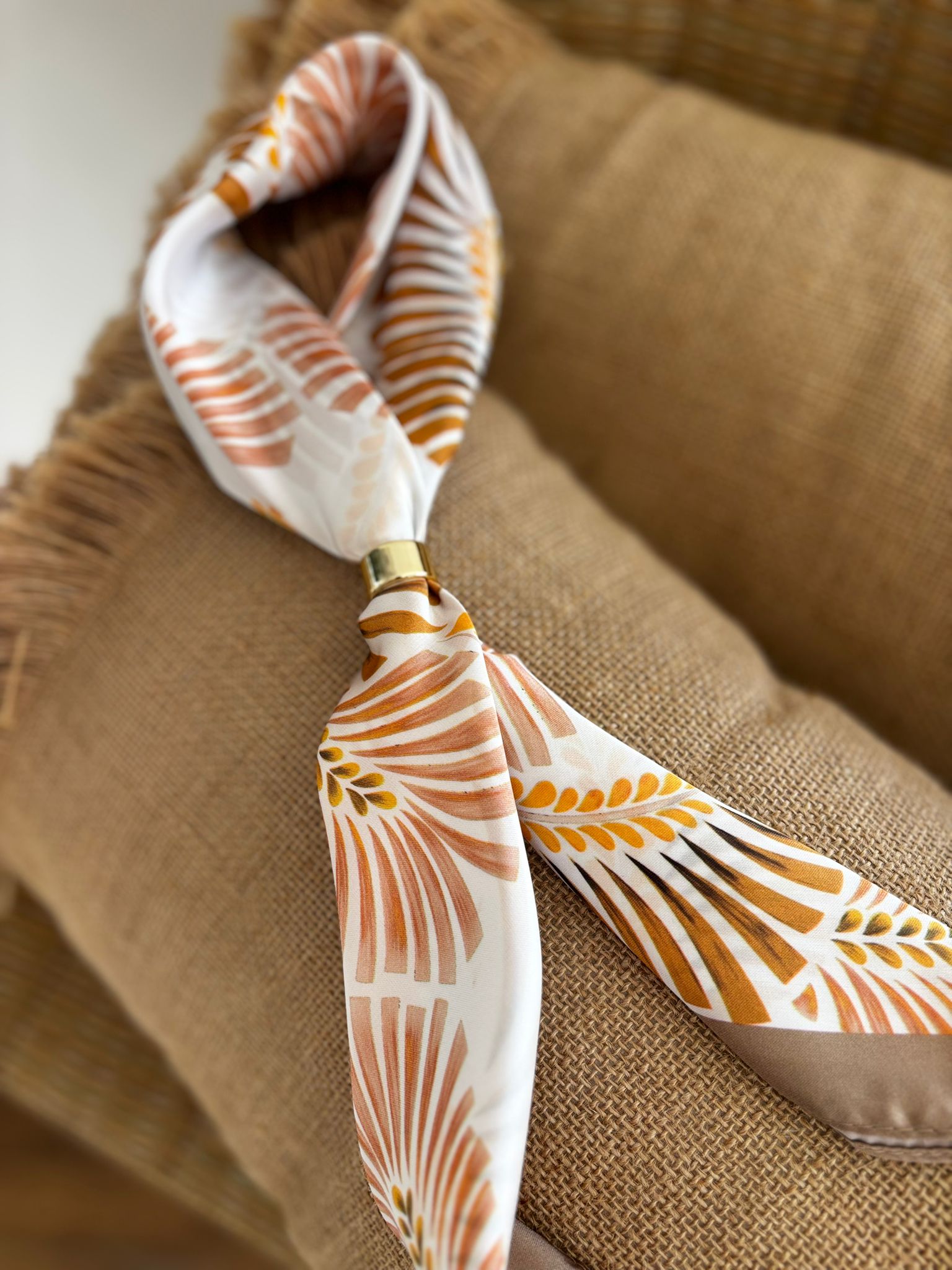 Pañuelo para cuello con detalle de anillo dorado.