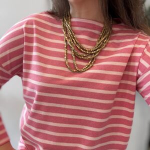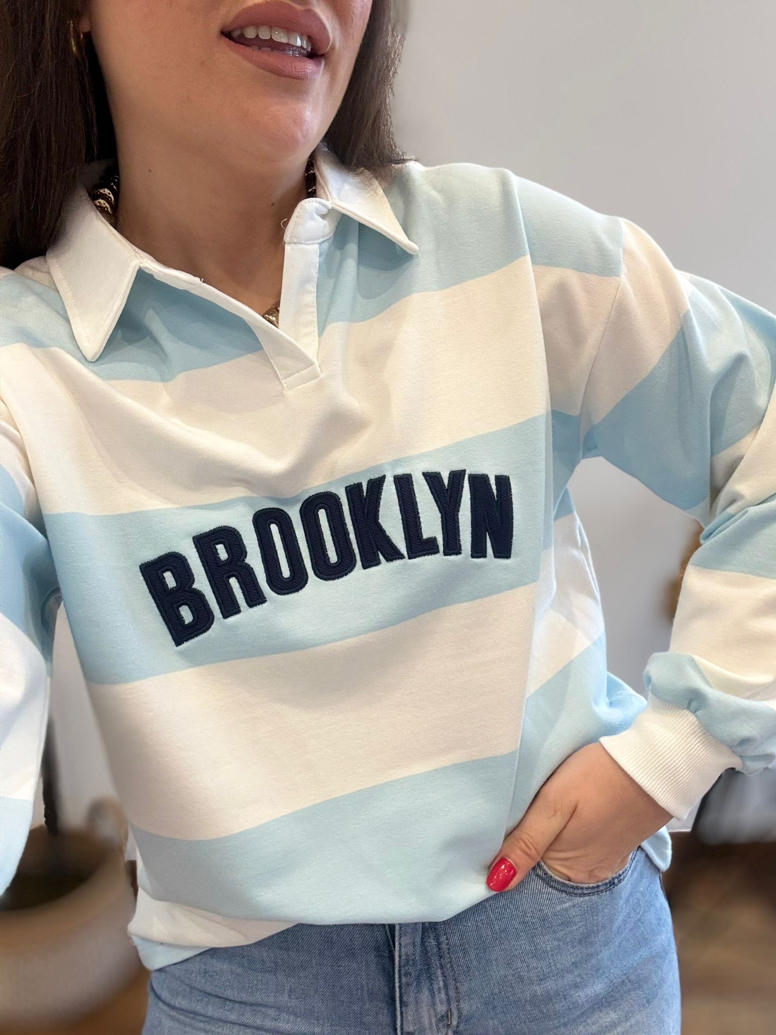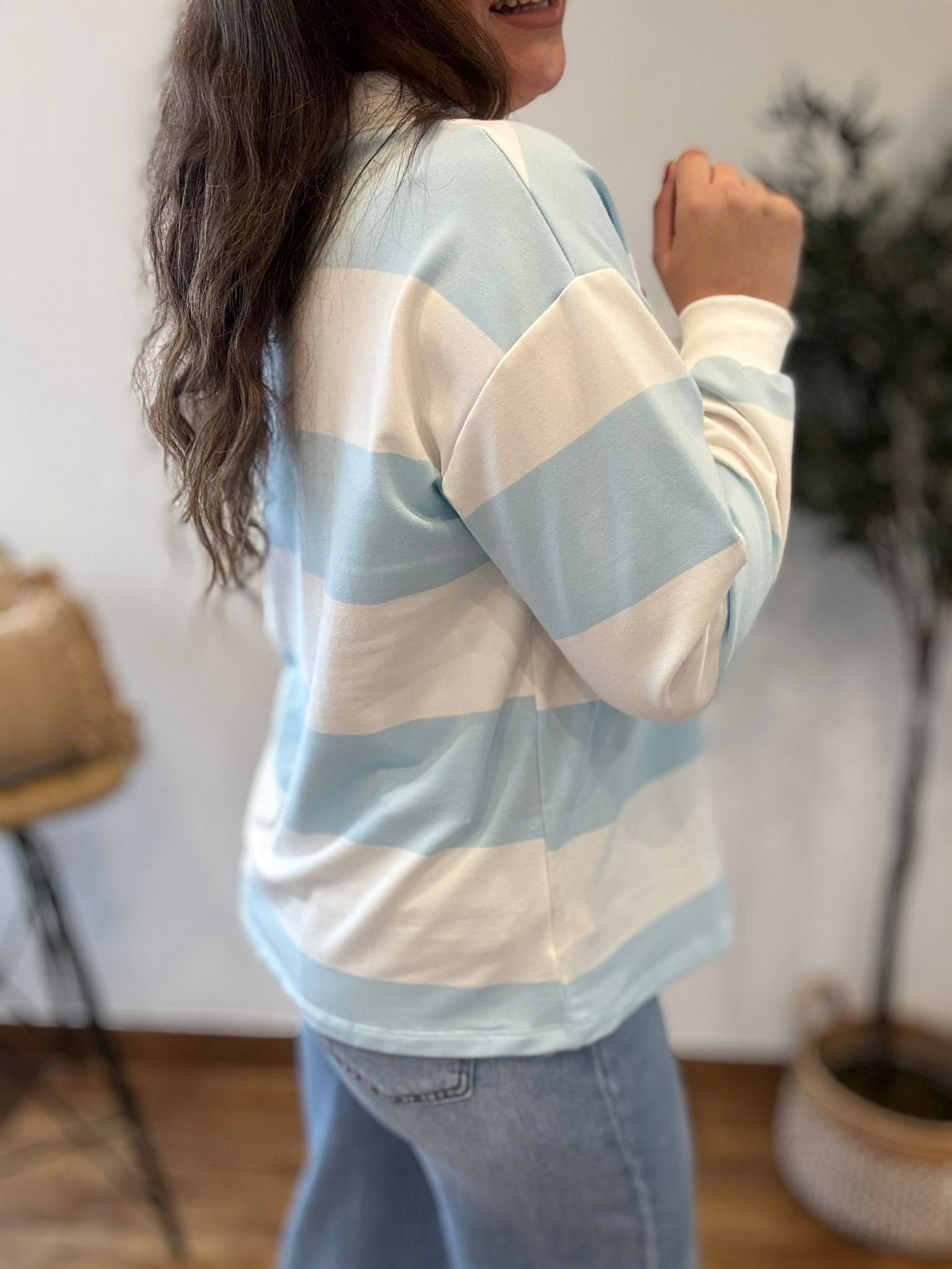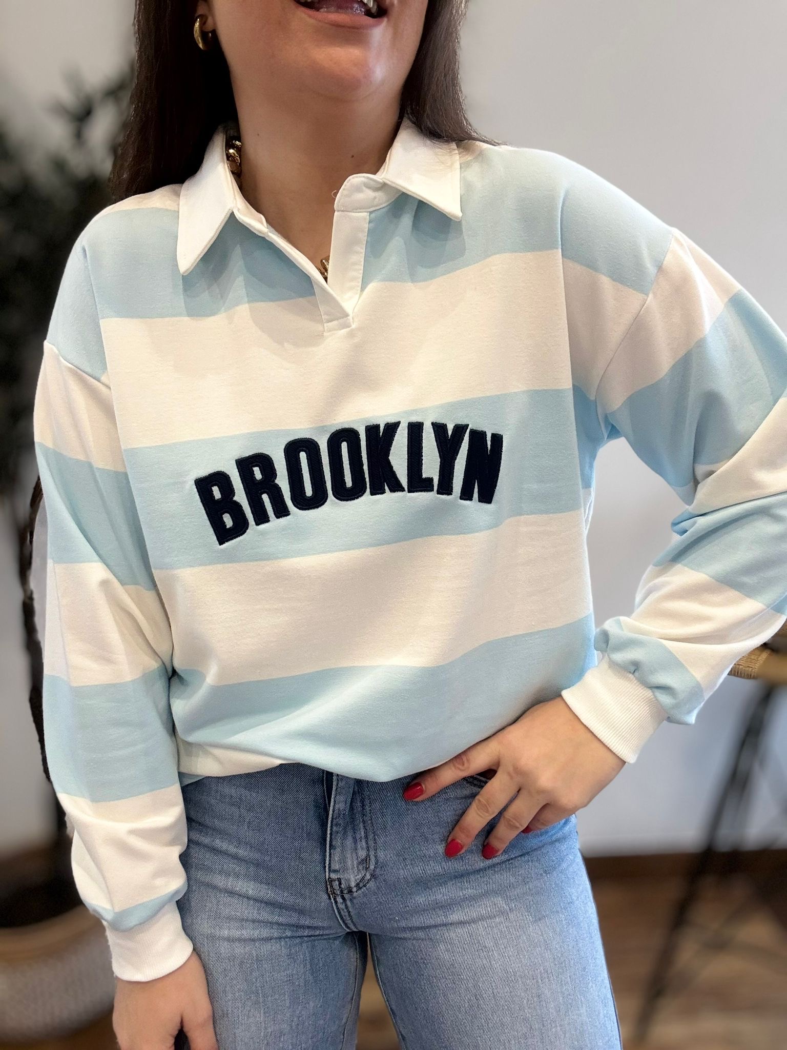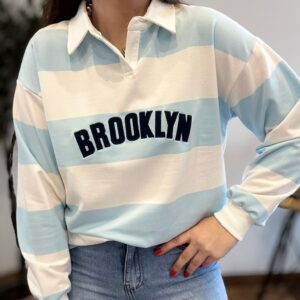 Polo tipo sudadera con detalle de letras bordadas. Ana lleva habitualmente talla L/40 y de este modelo utiliza talla M. Vienen oversize. Medidas de contorno de pecho por talla: S 110, M 120 y L 130cm