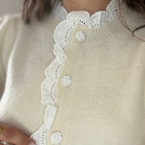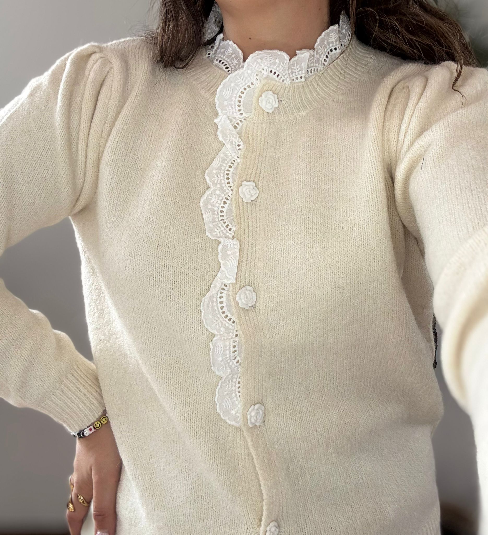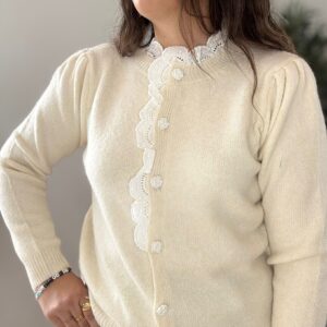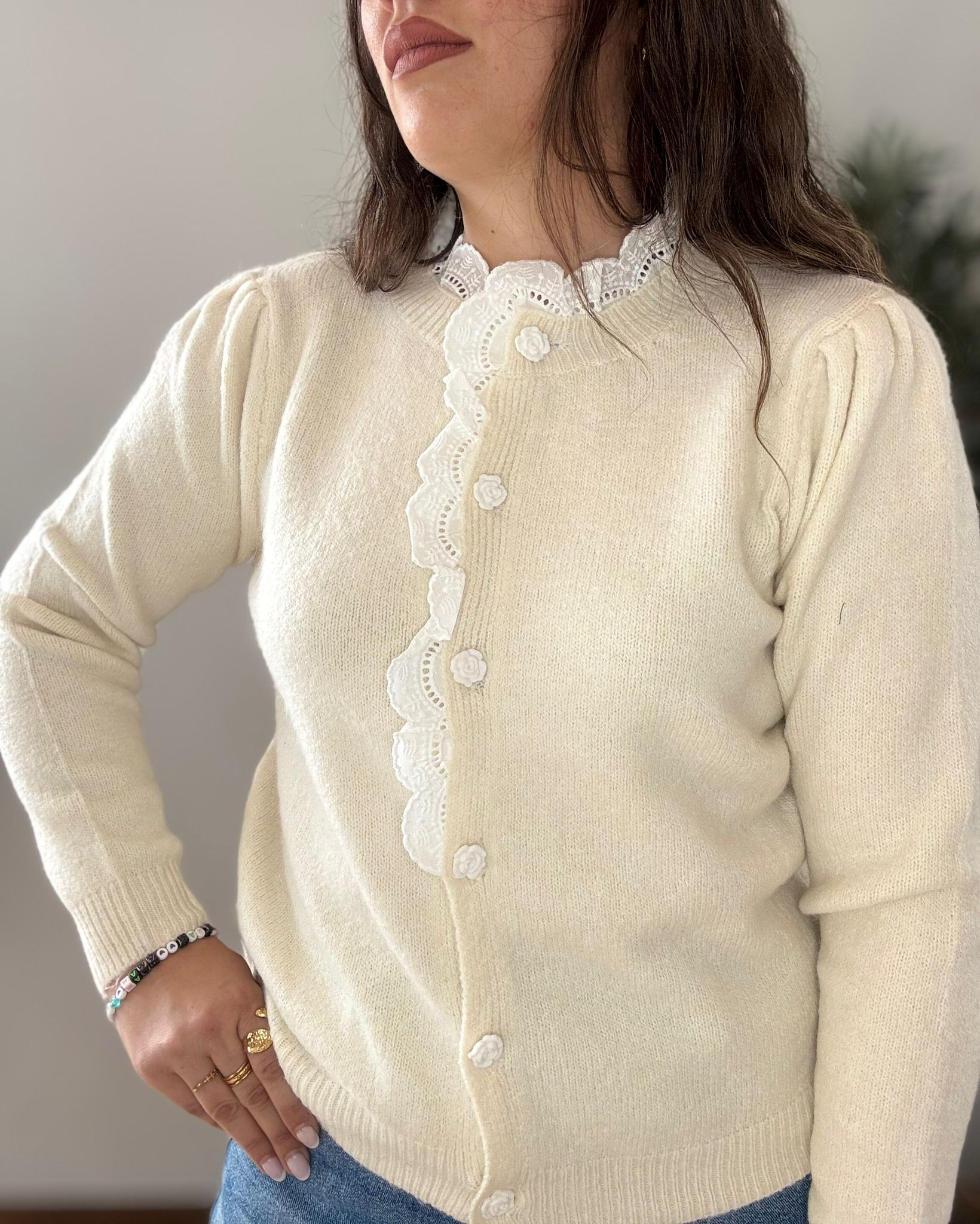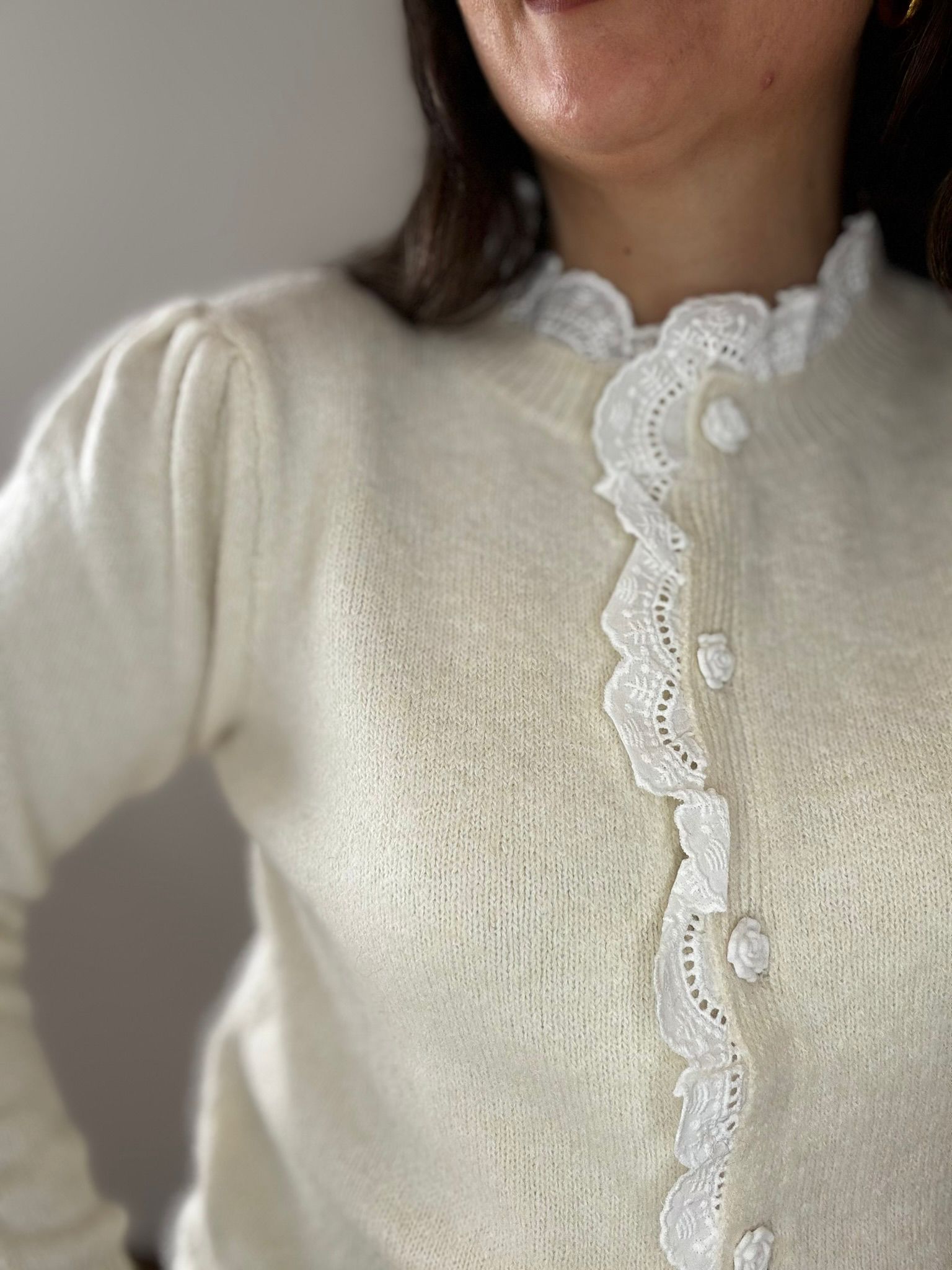 Rebeca de lana suave con detalle de puntillita blanca de encajes y botones de flor. TU RECOMENDADA 36-42. Ana lleva habitualmente talla L 40/42