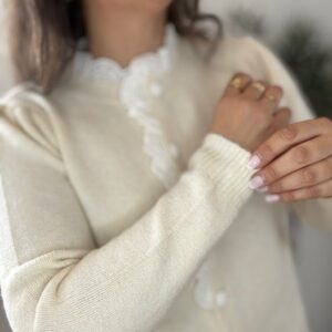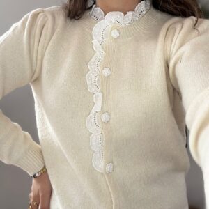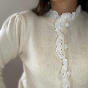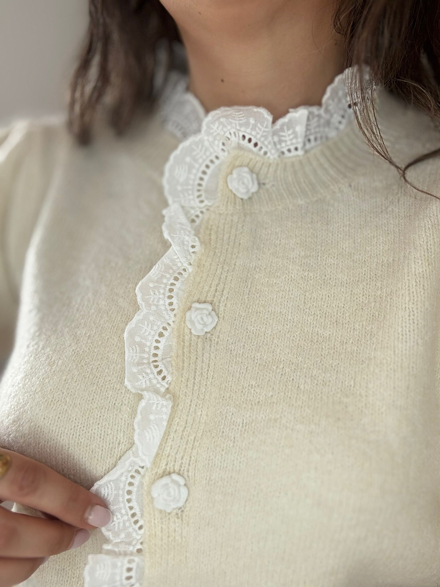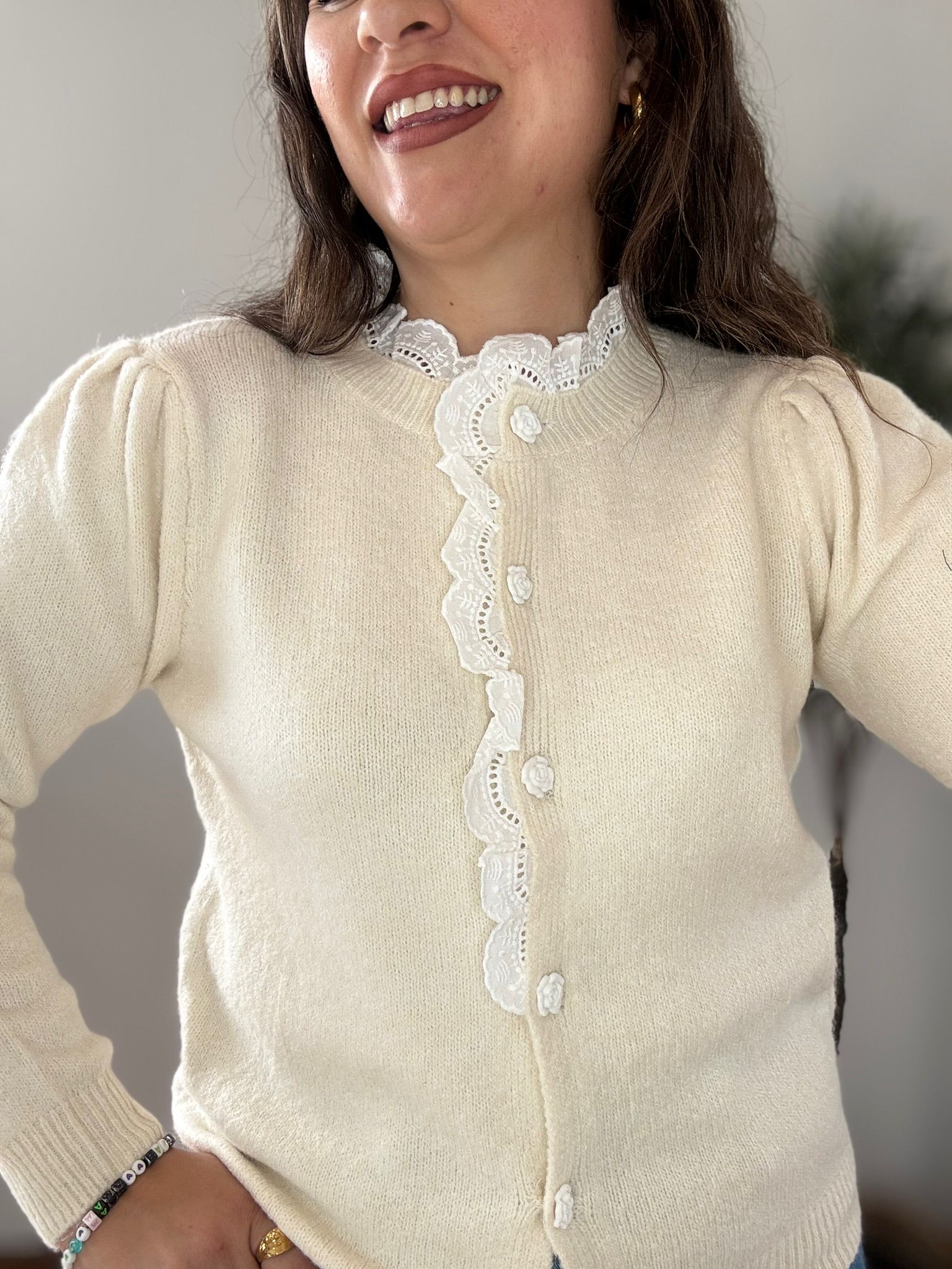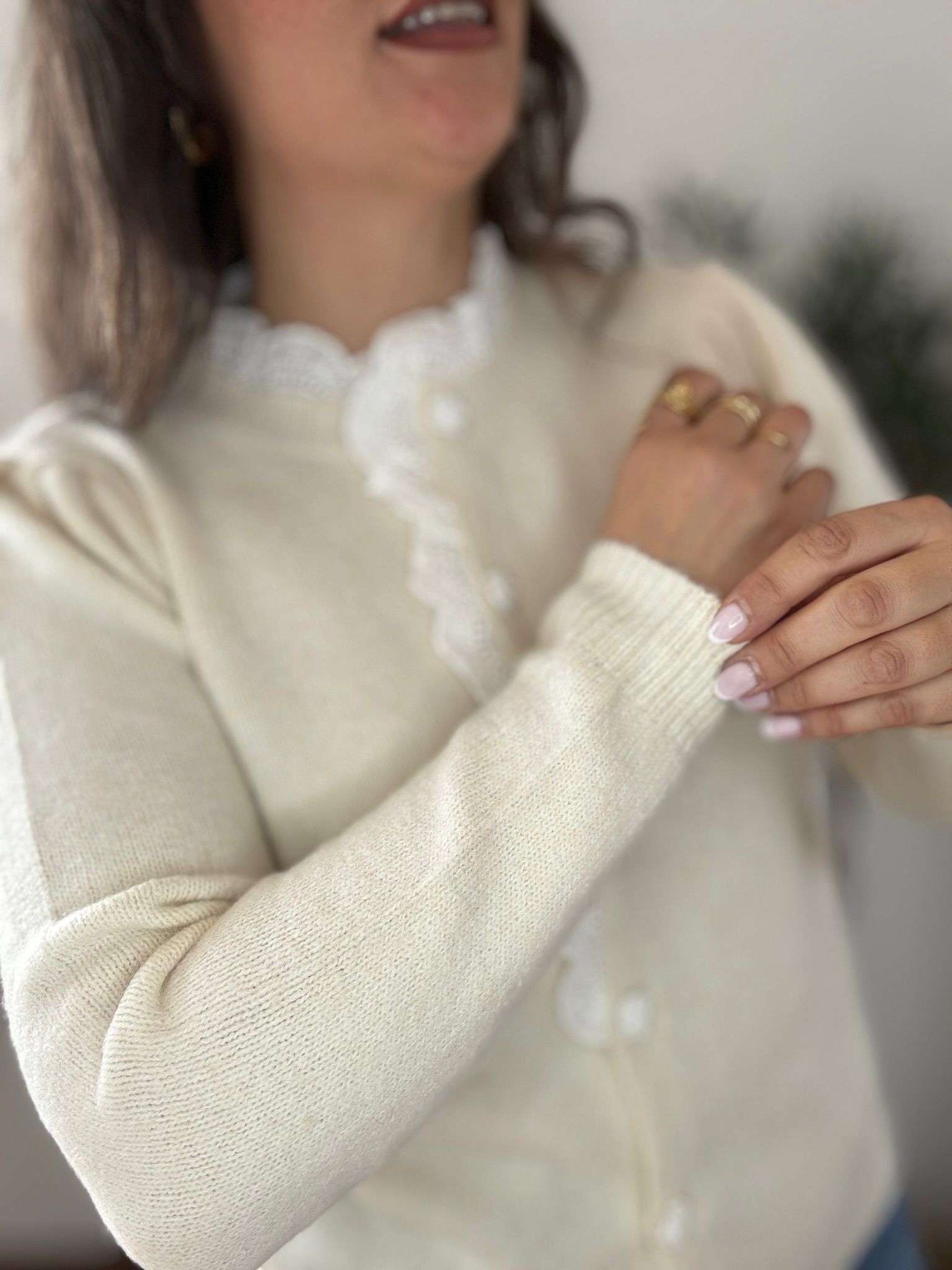 Rebeca de lana suave con detalle de puntillita blanca de encajes y botones de flor. TU RECOMENDADA 36-42. Ana lleva habitualmente talla L 40/42
