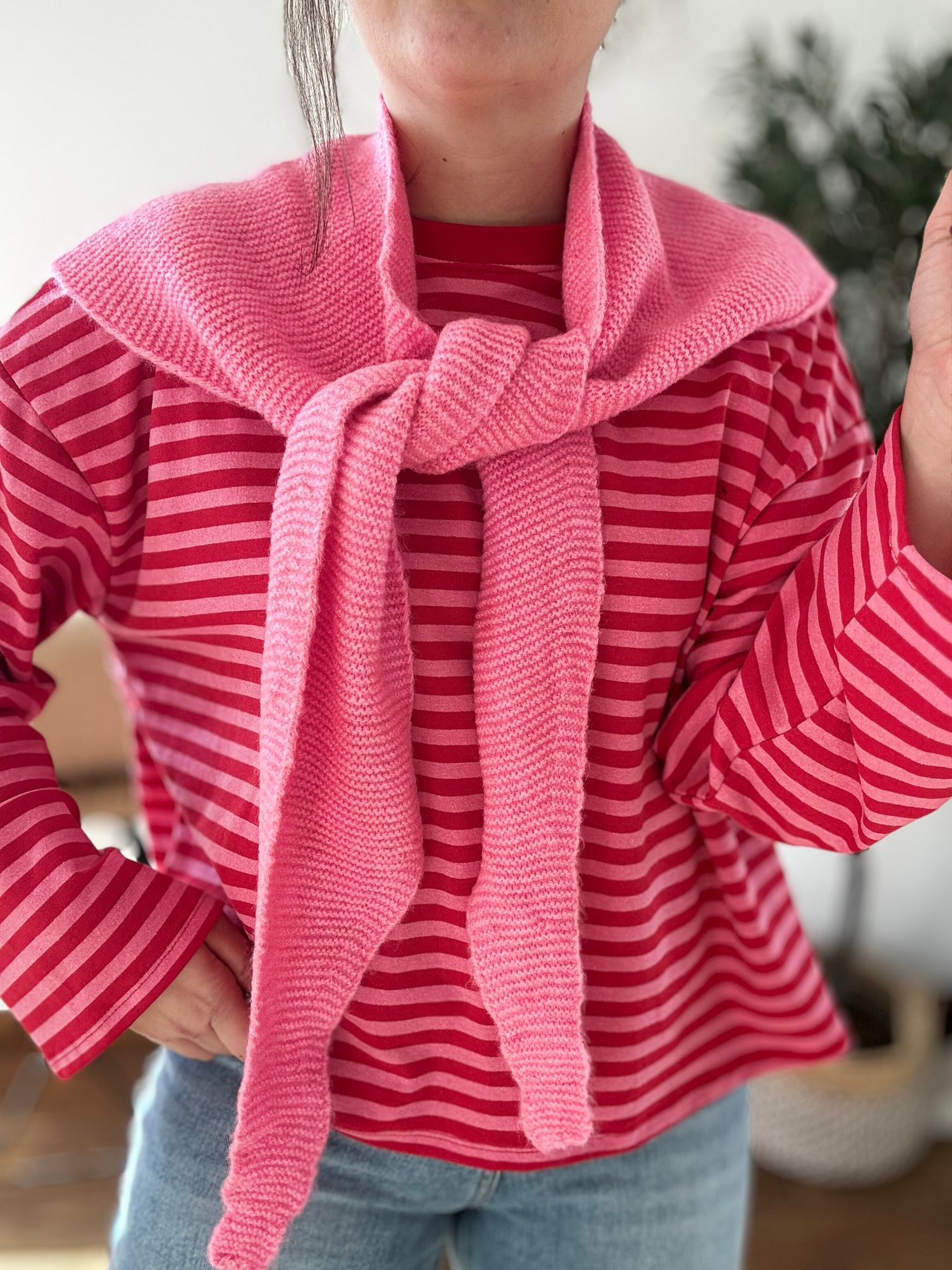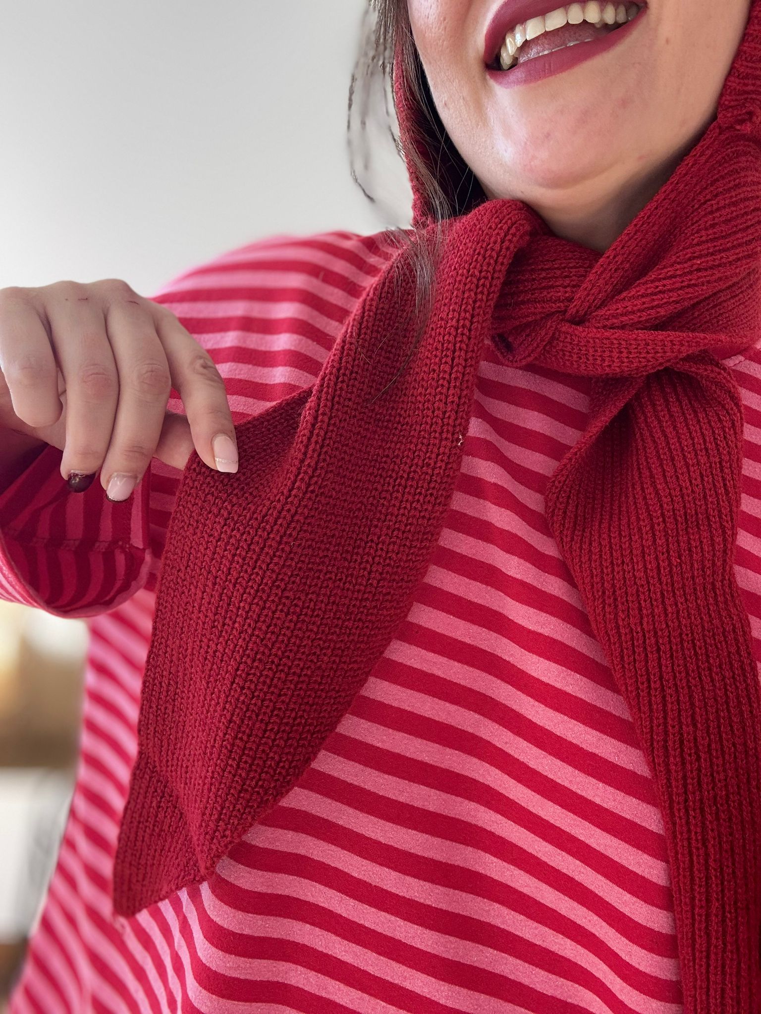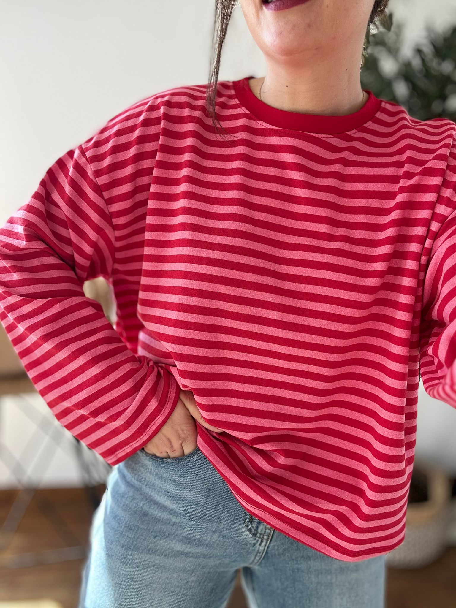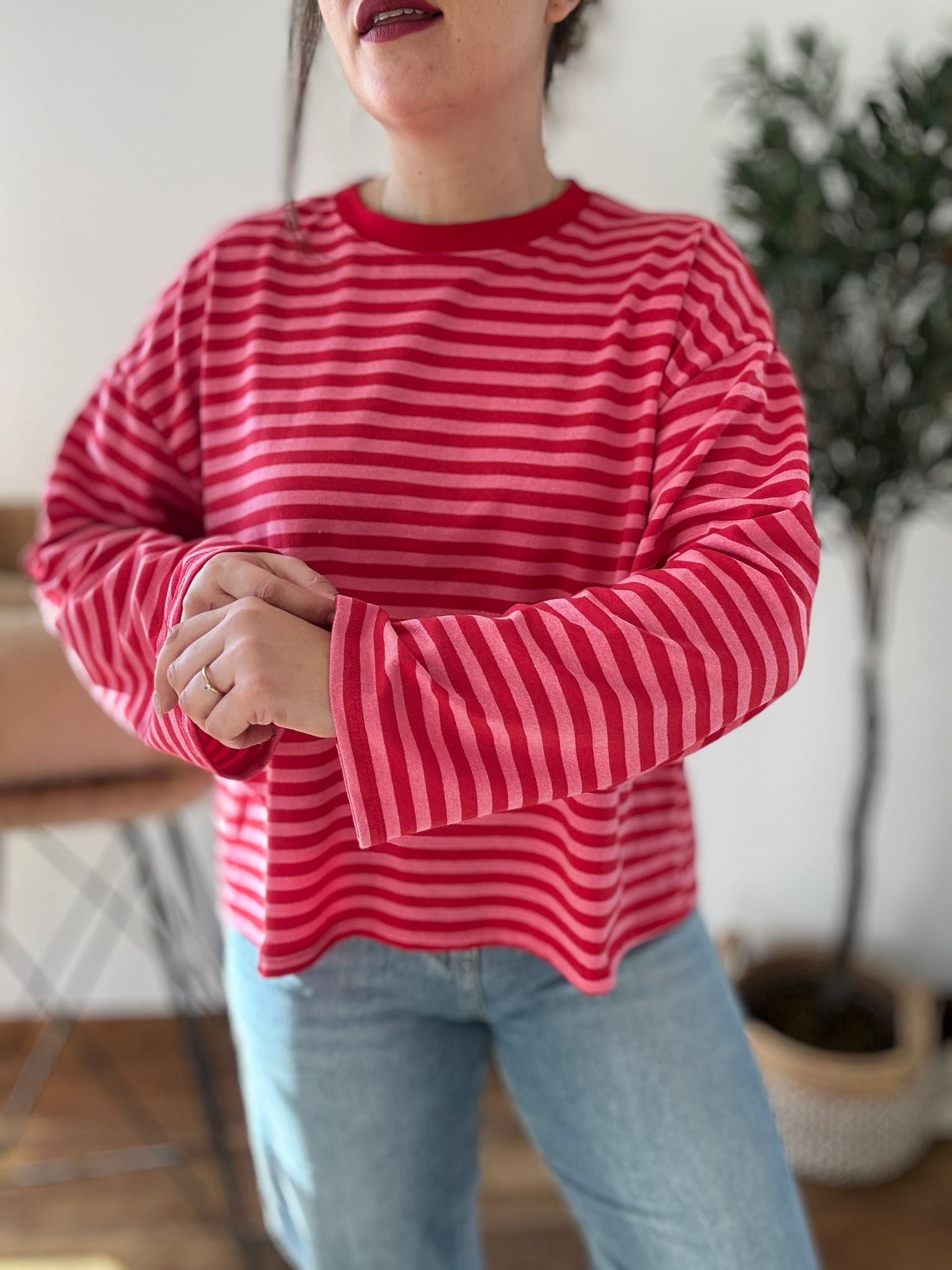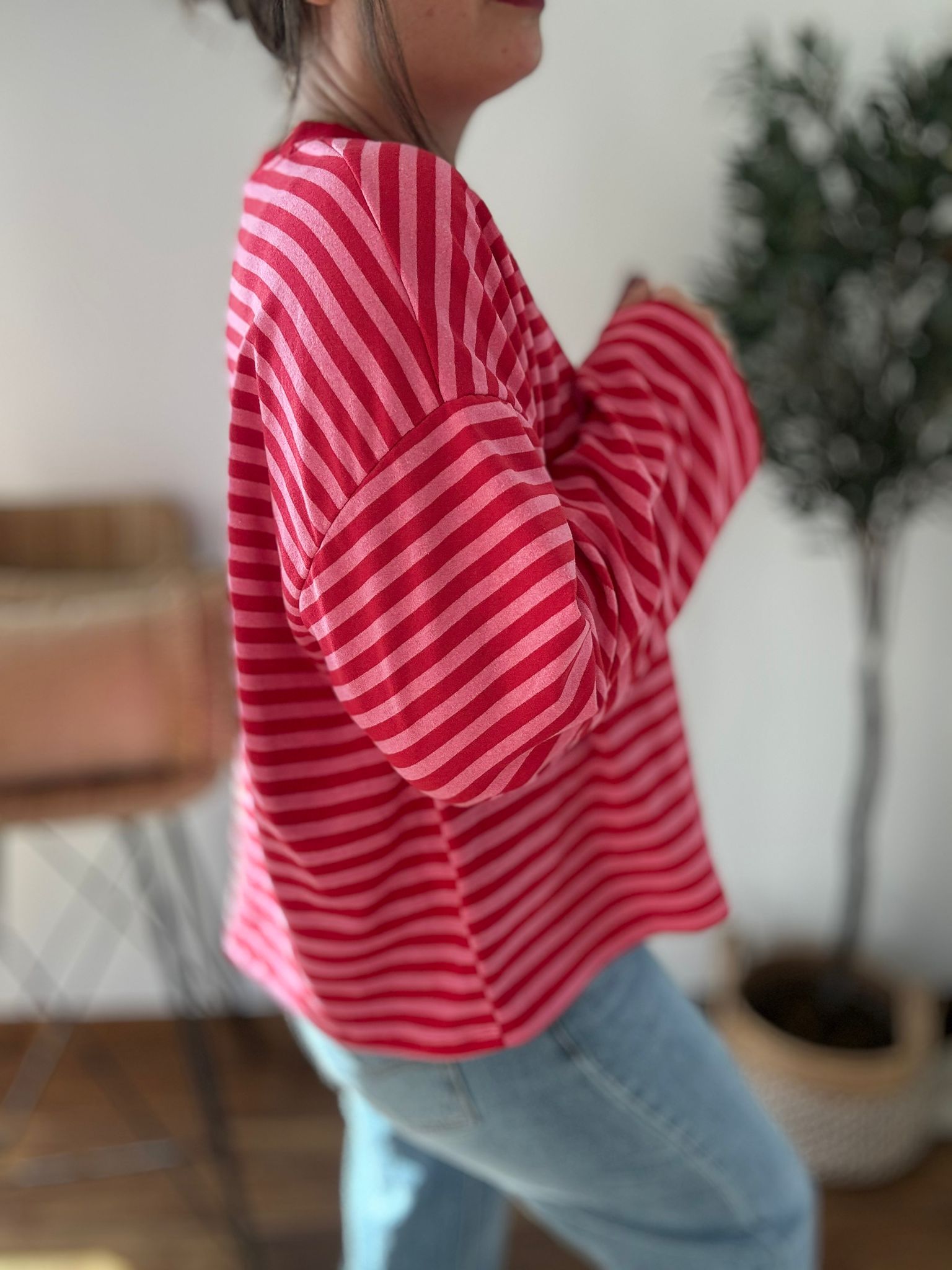 Sudadera de rayas sin pelito con corte oversize y mangas anchas. TU RECOMENDADA 38/46. Ana lleva habitualmente talla 40/42 y mide 1.71m Medidas de la sudadera: contorno de pecho 140 y largo 59cm