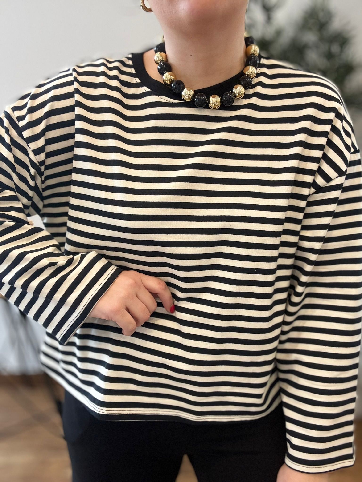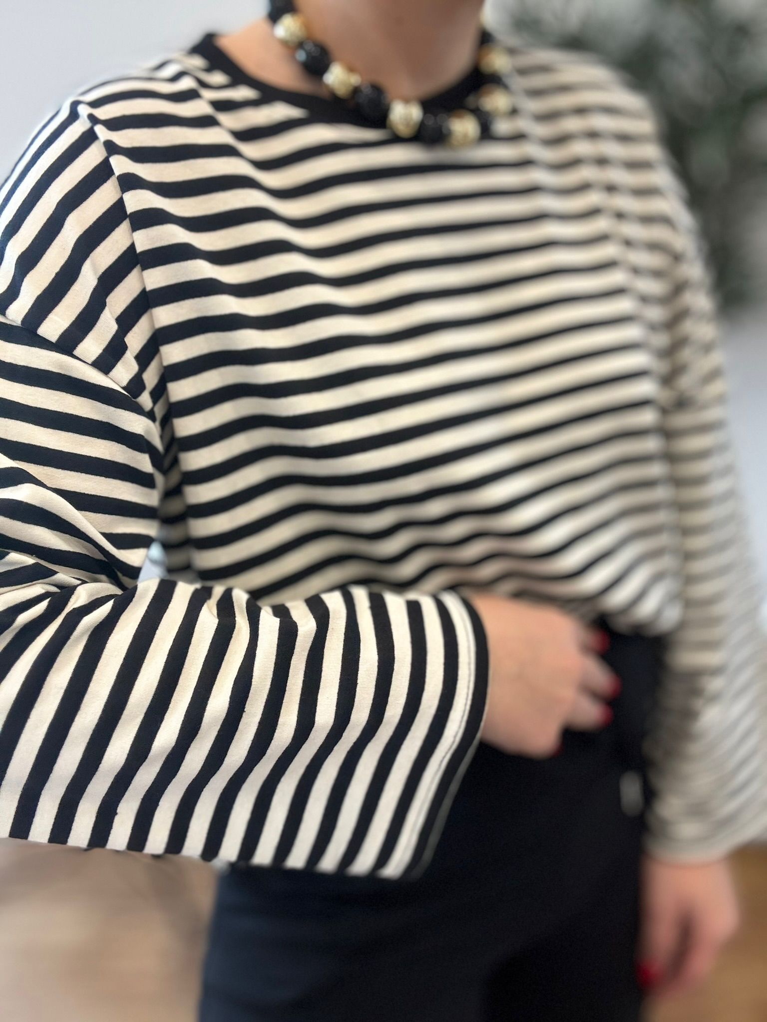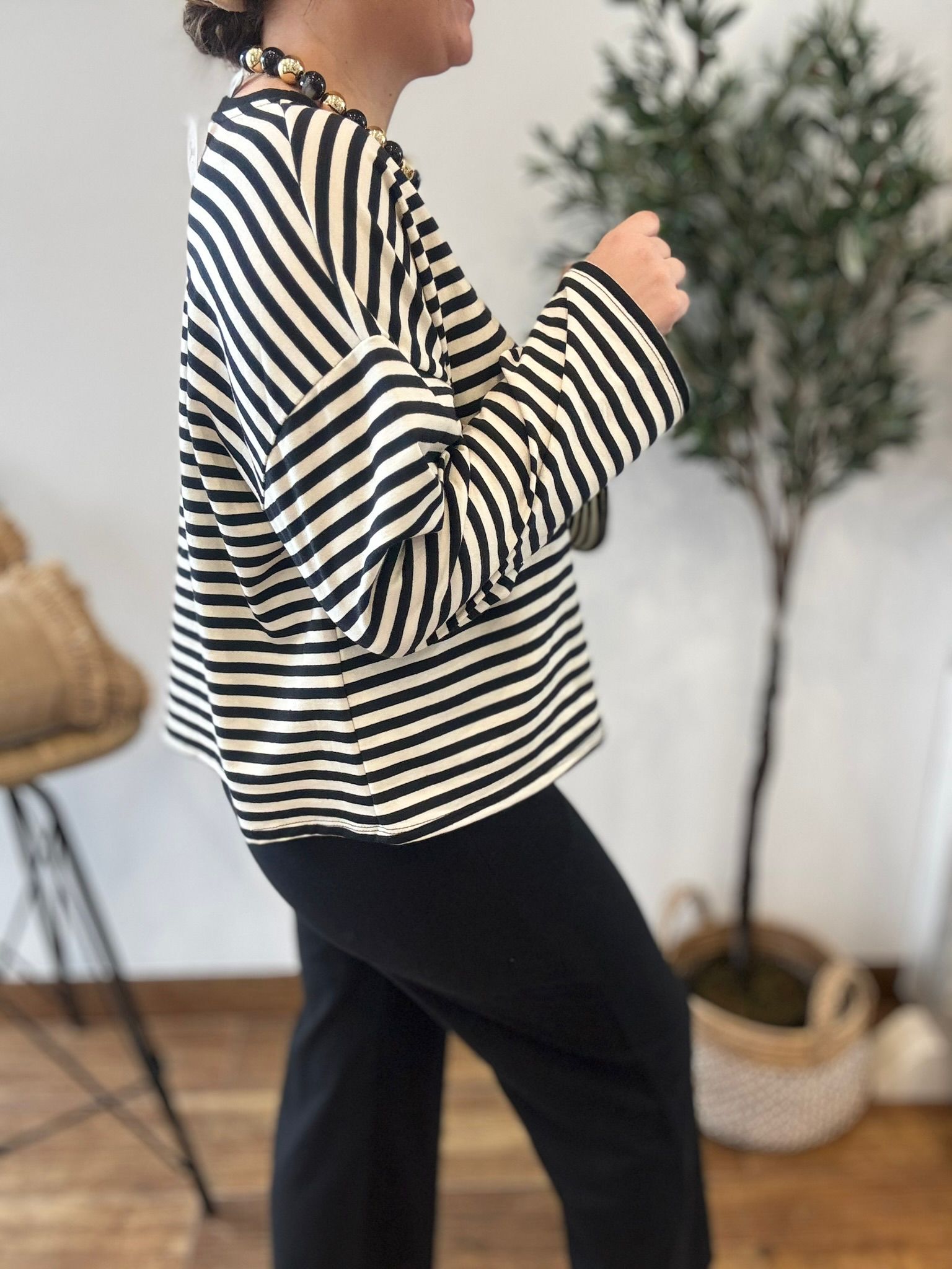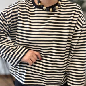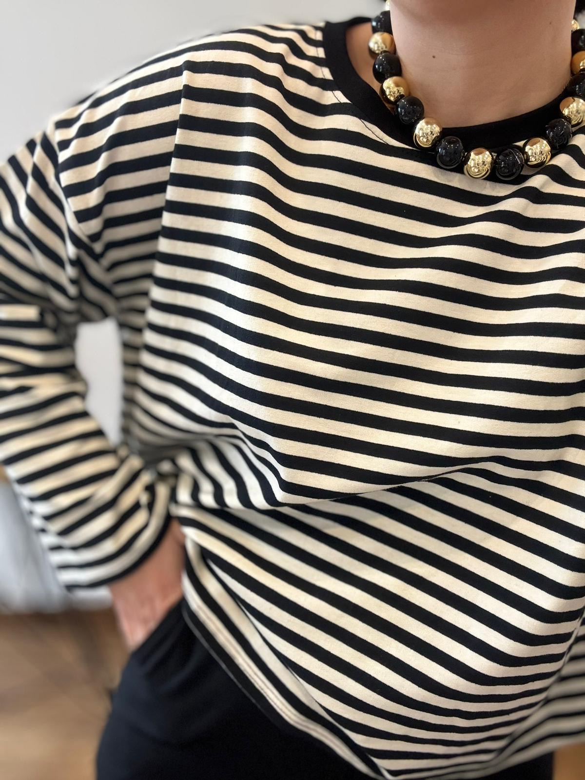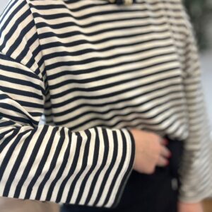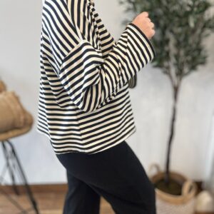 Sudadera de rayas oversize con mangas anchas. TU RECOMENDADA 36-44. Ana lleva habitualmente talla L/40. Medidas de la sudadera: contorno de pecho 130 y largo 57cm