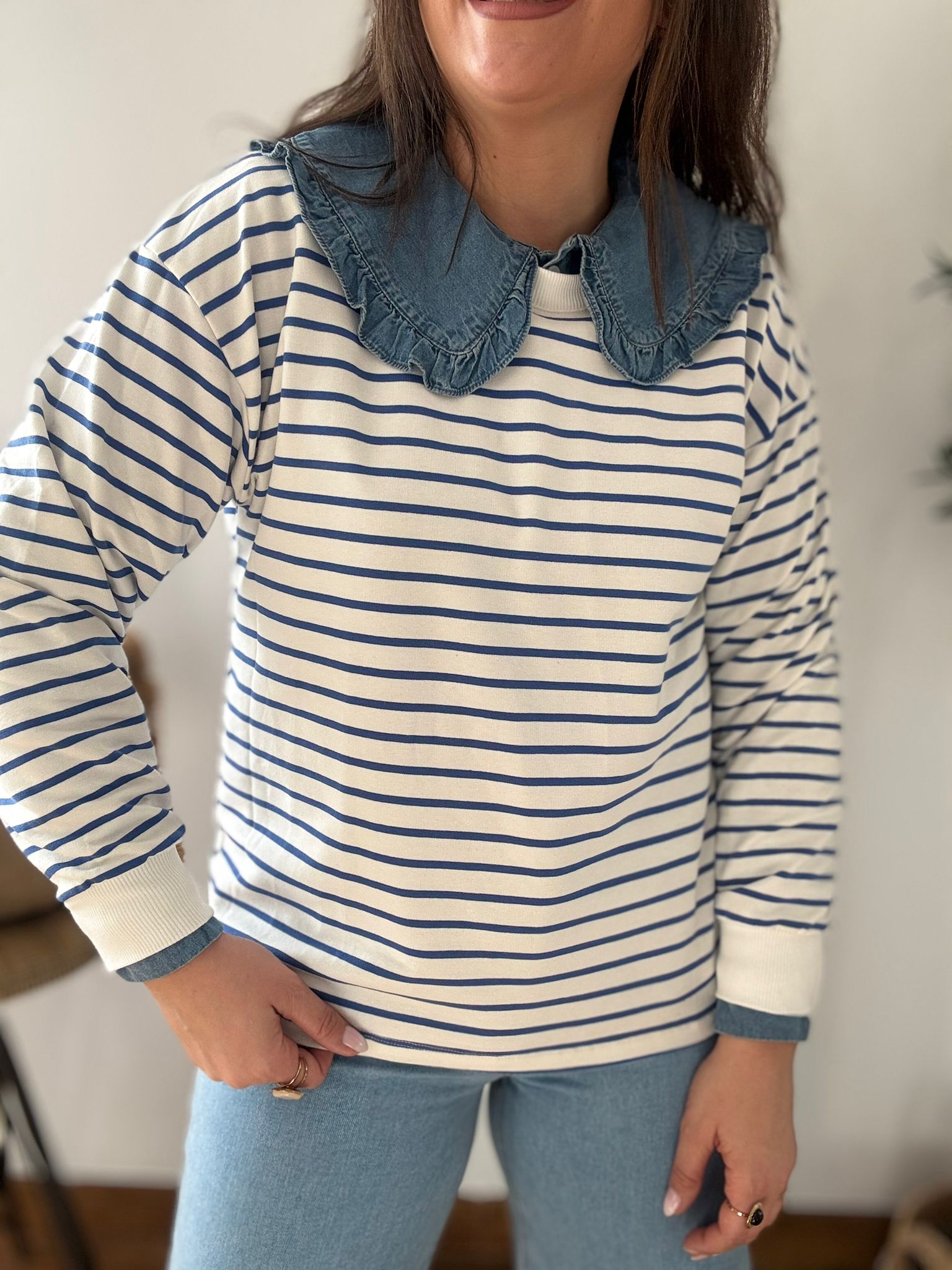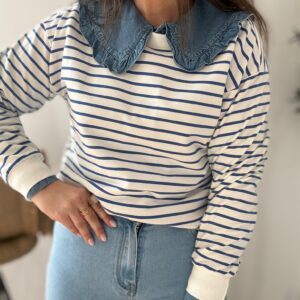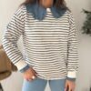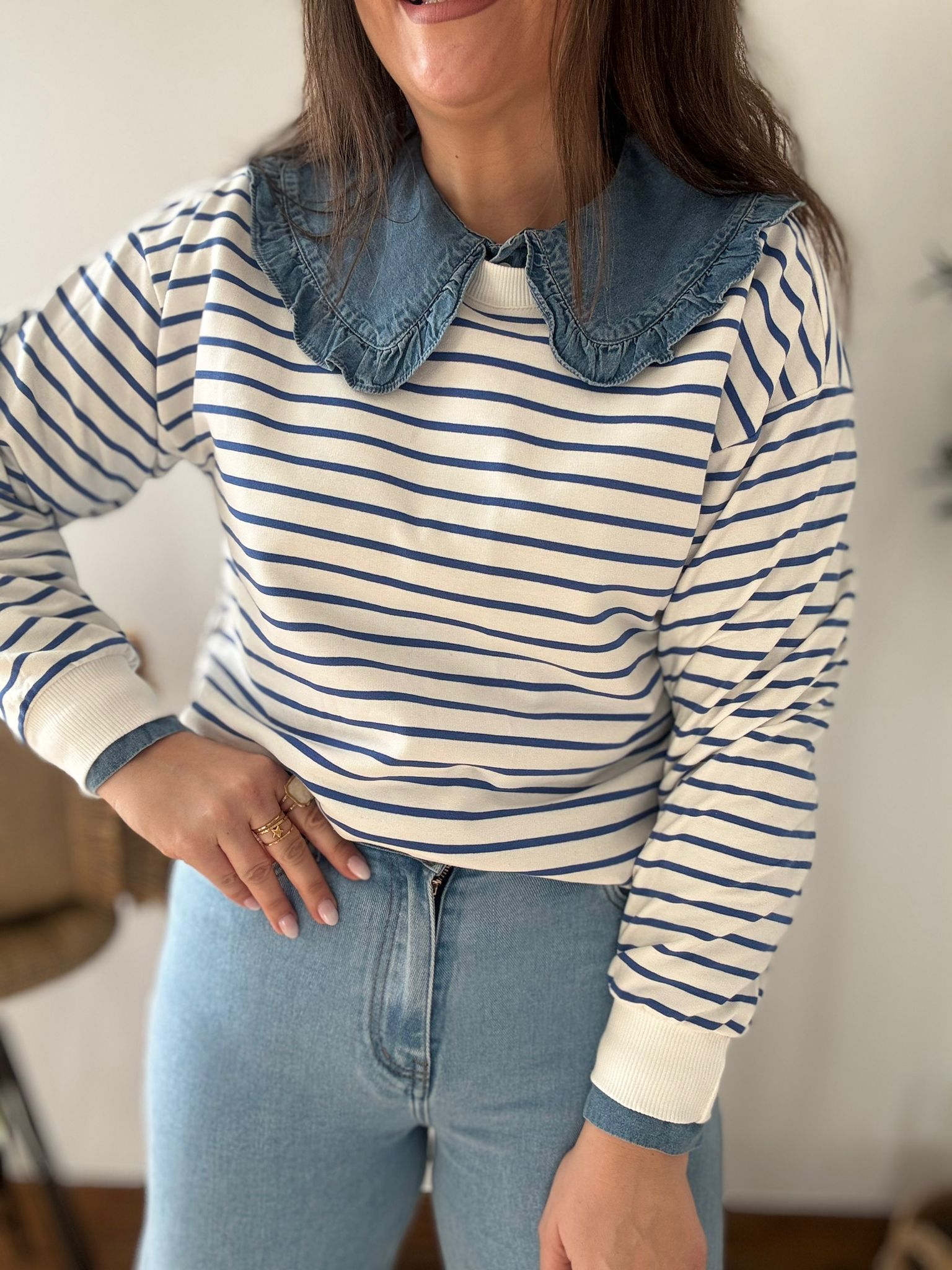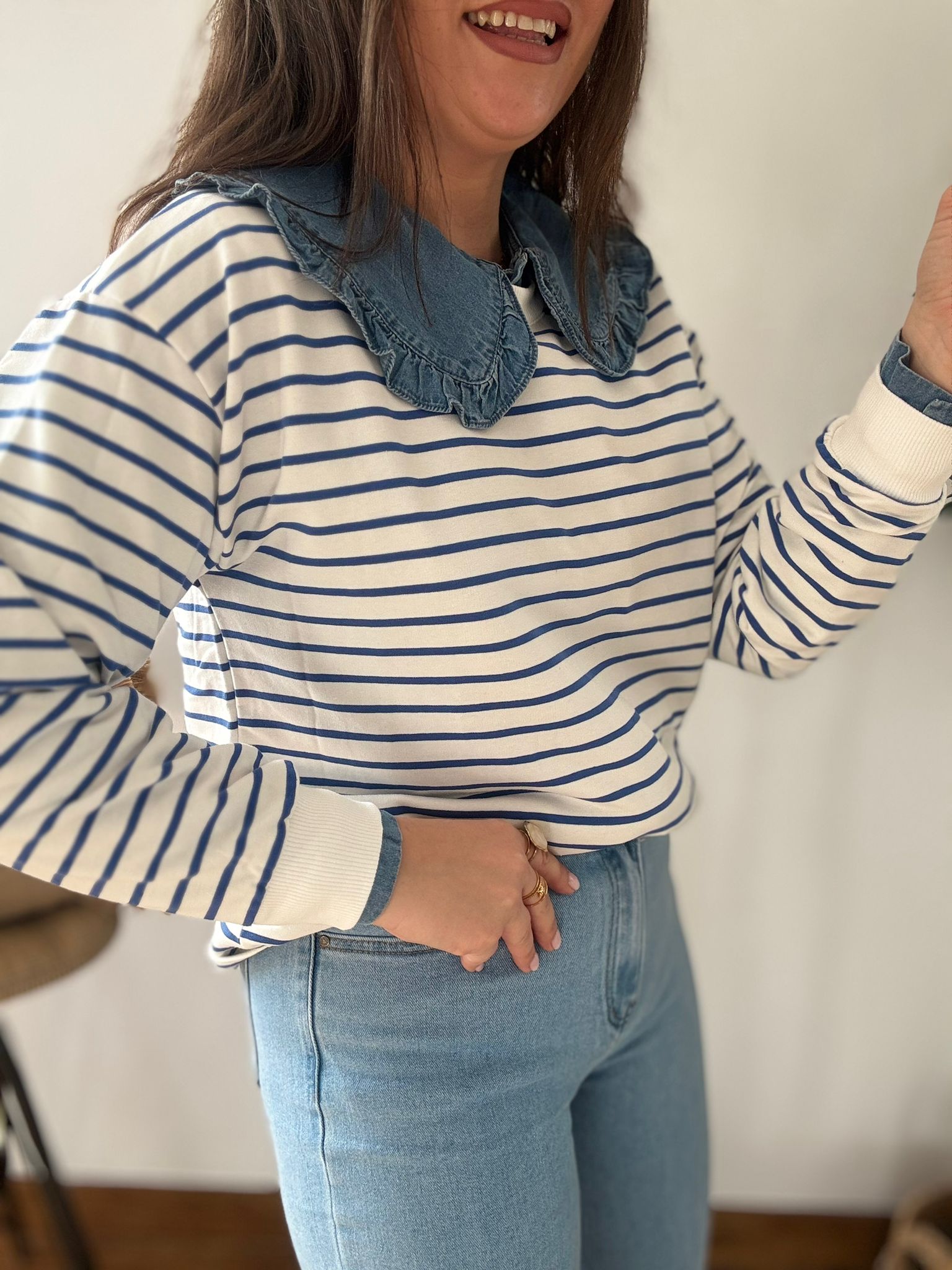 Sudadera estilo Navy. Ana lleva habitualmente talla L/40 y de este modelo lleva talla L. Medidas de contorno de pecho por tallas: S 114, M118 y L 122cm