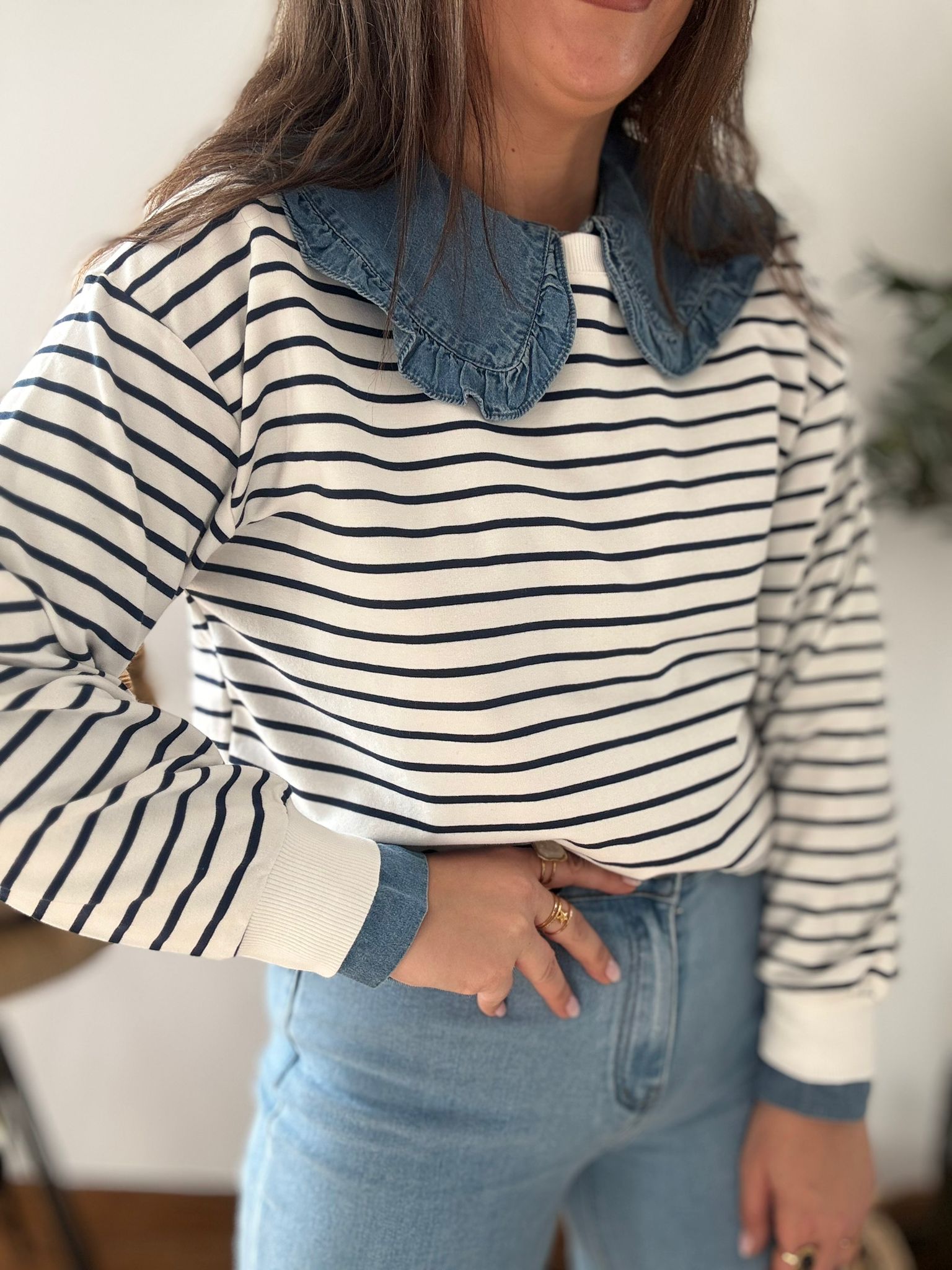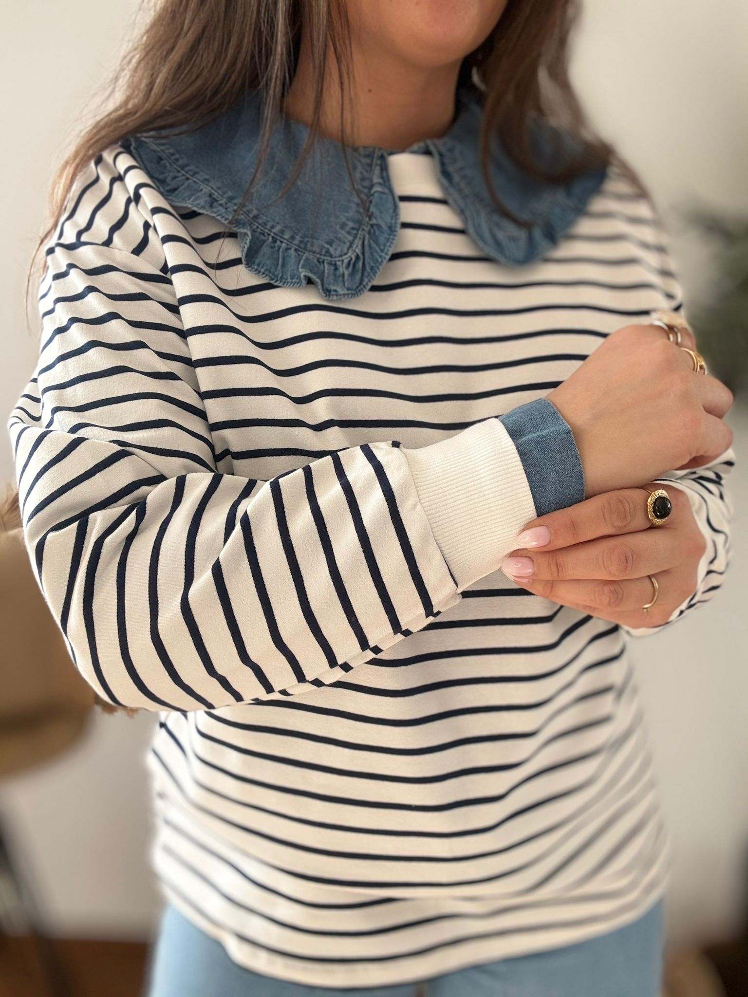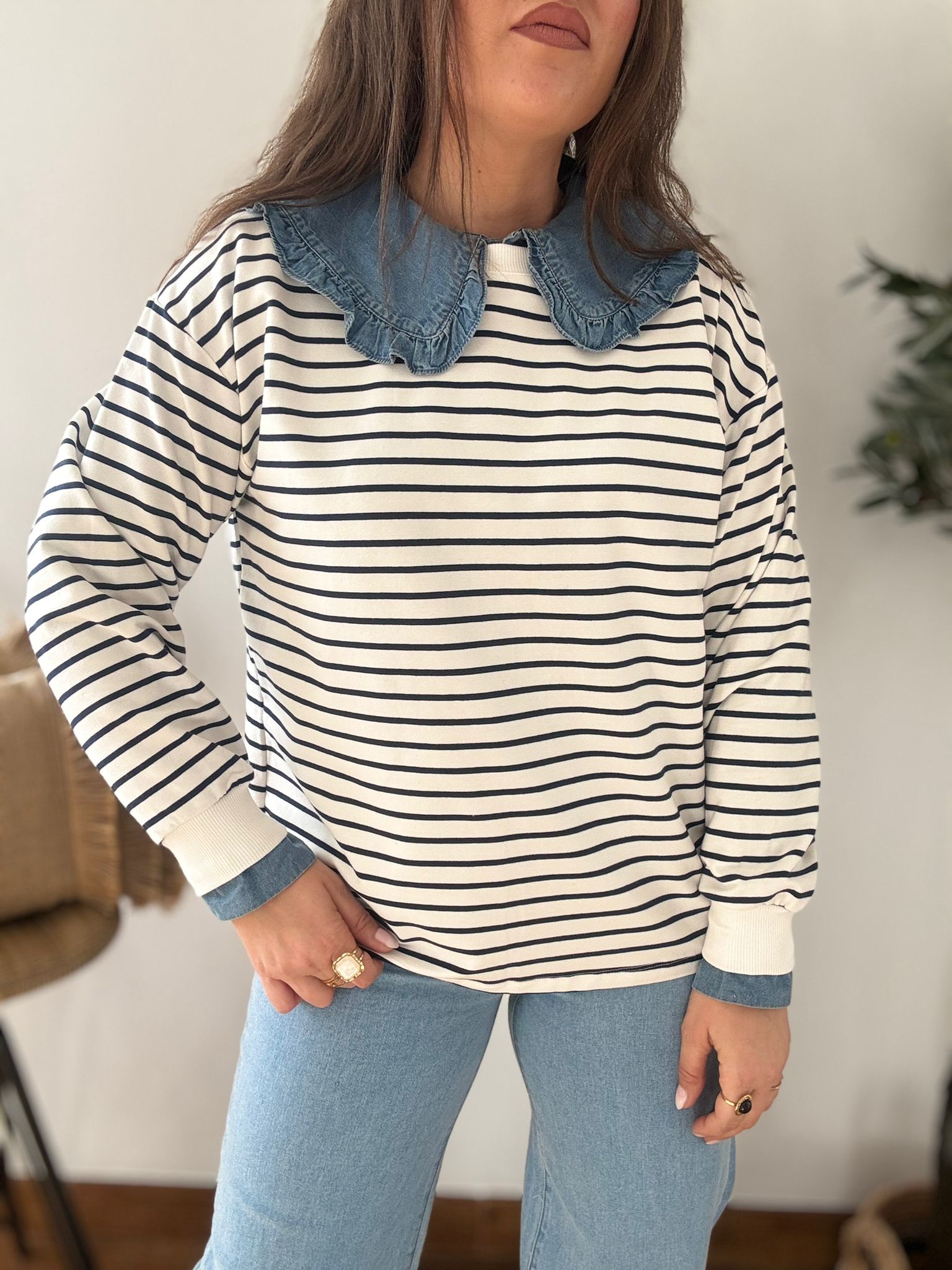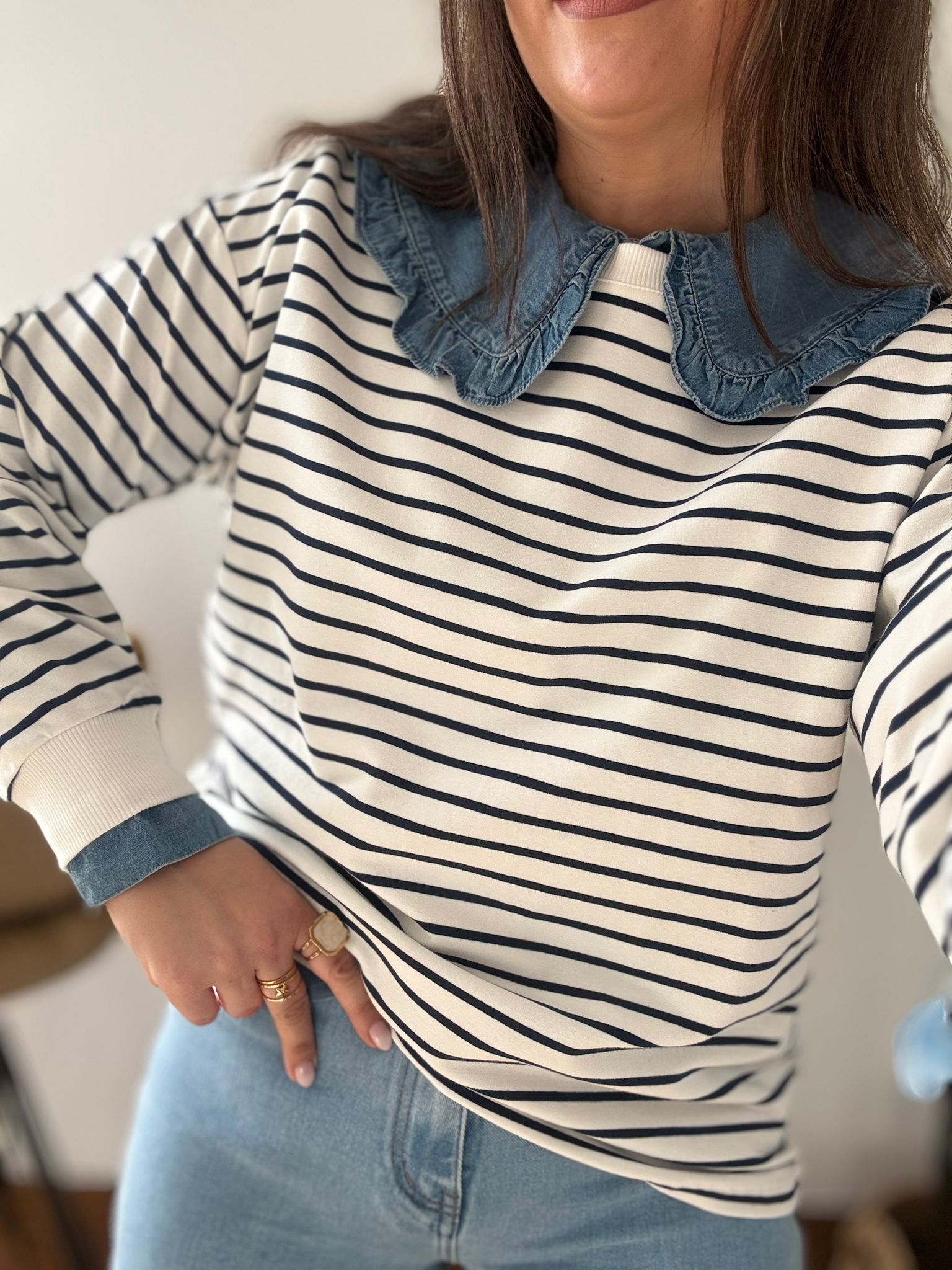 Sudadera estilo Navy. Ana lleva habitualmente talla L/40 y de este modelo lleva talla L. Medidas de contorno de pecho por tallas: S 114, M118 y L 122cm