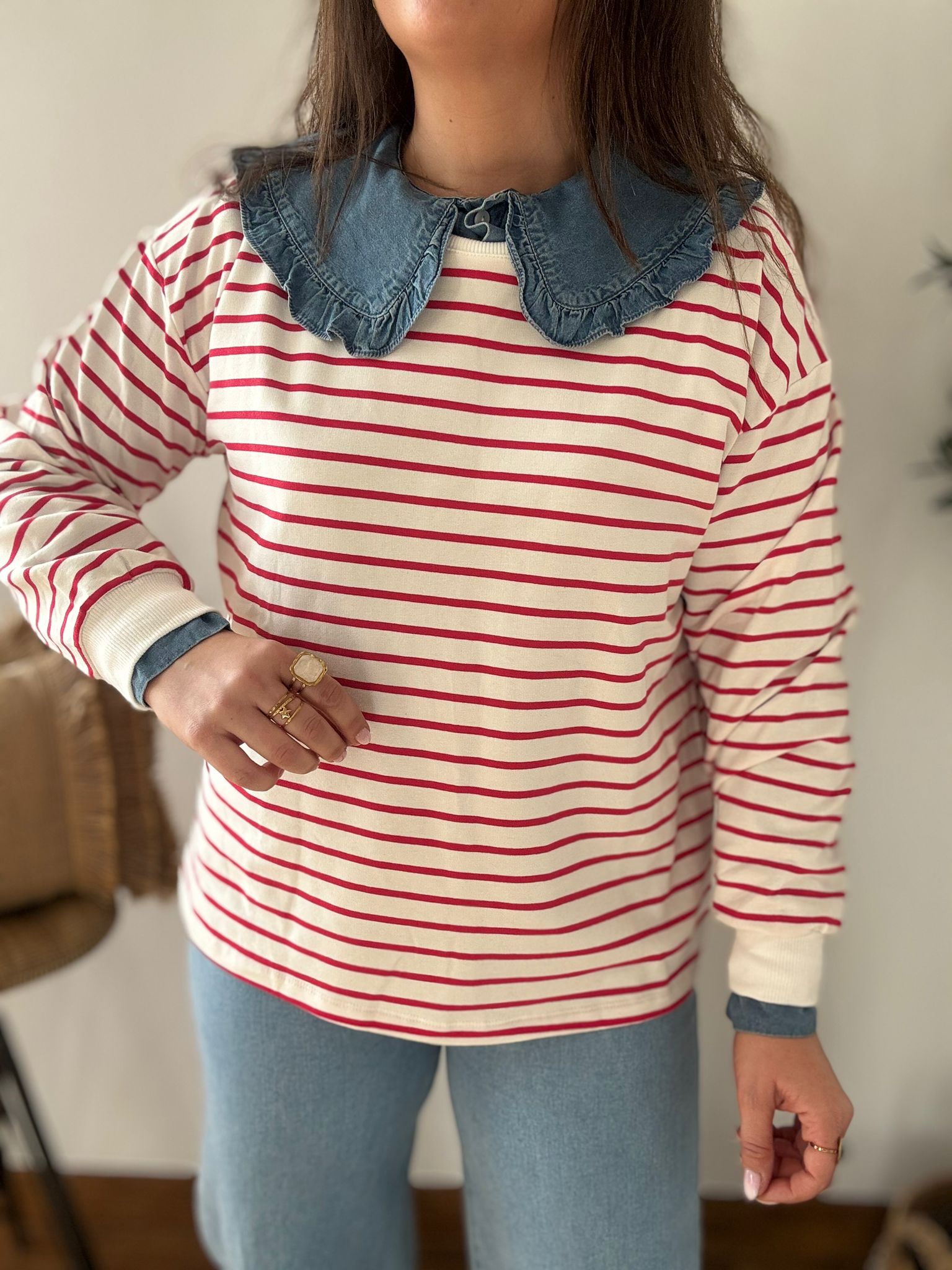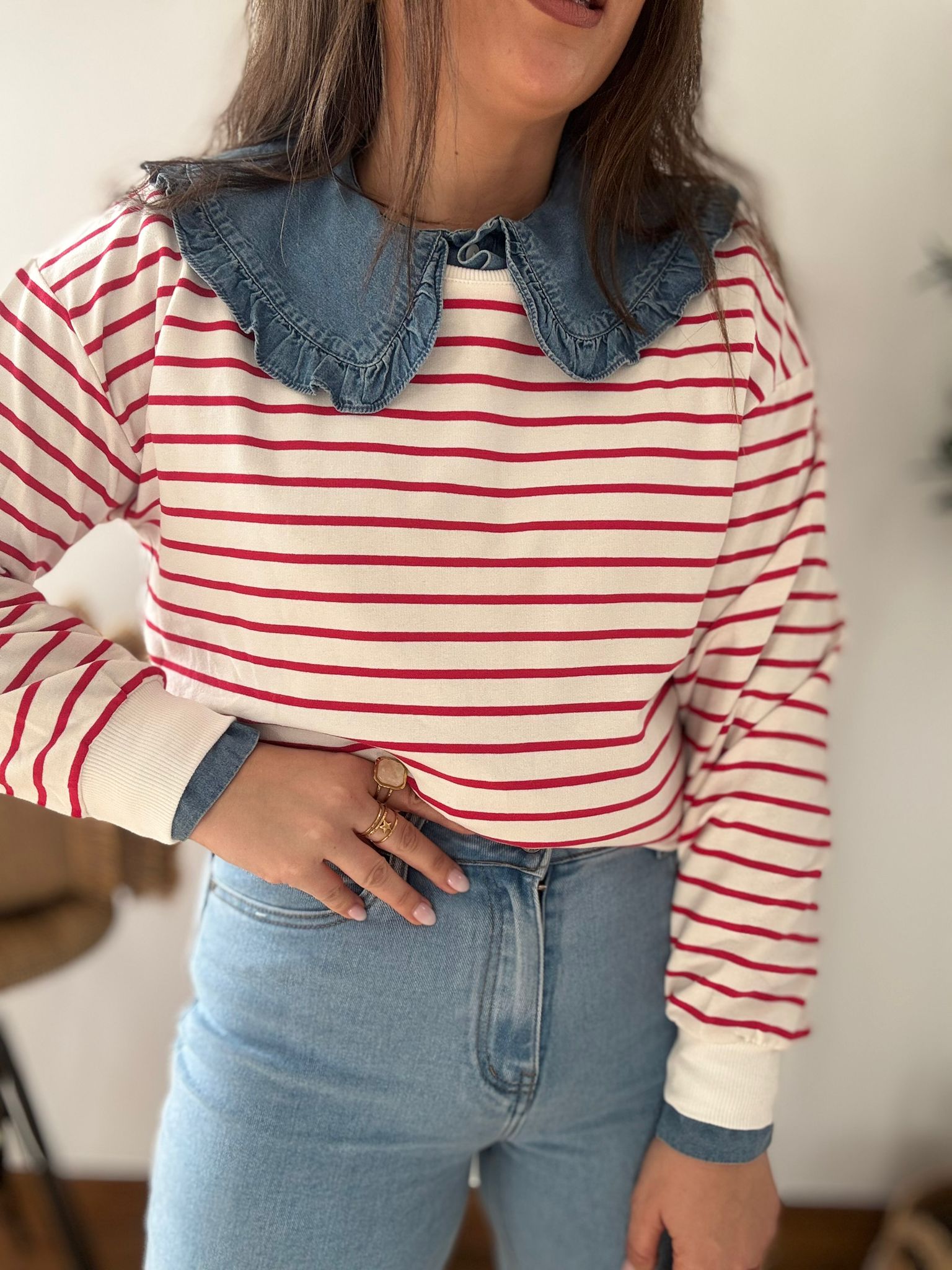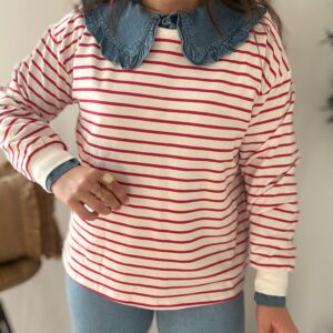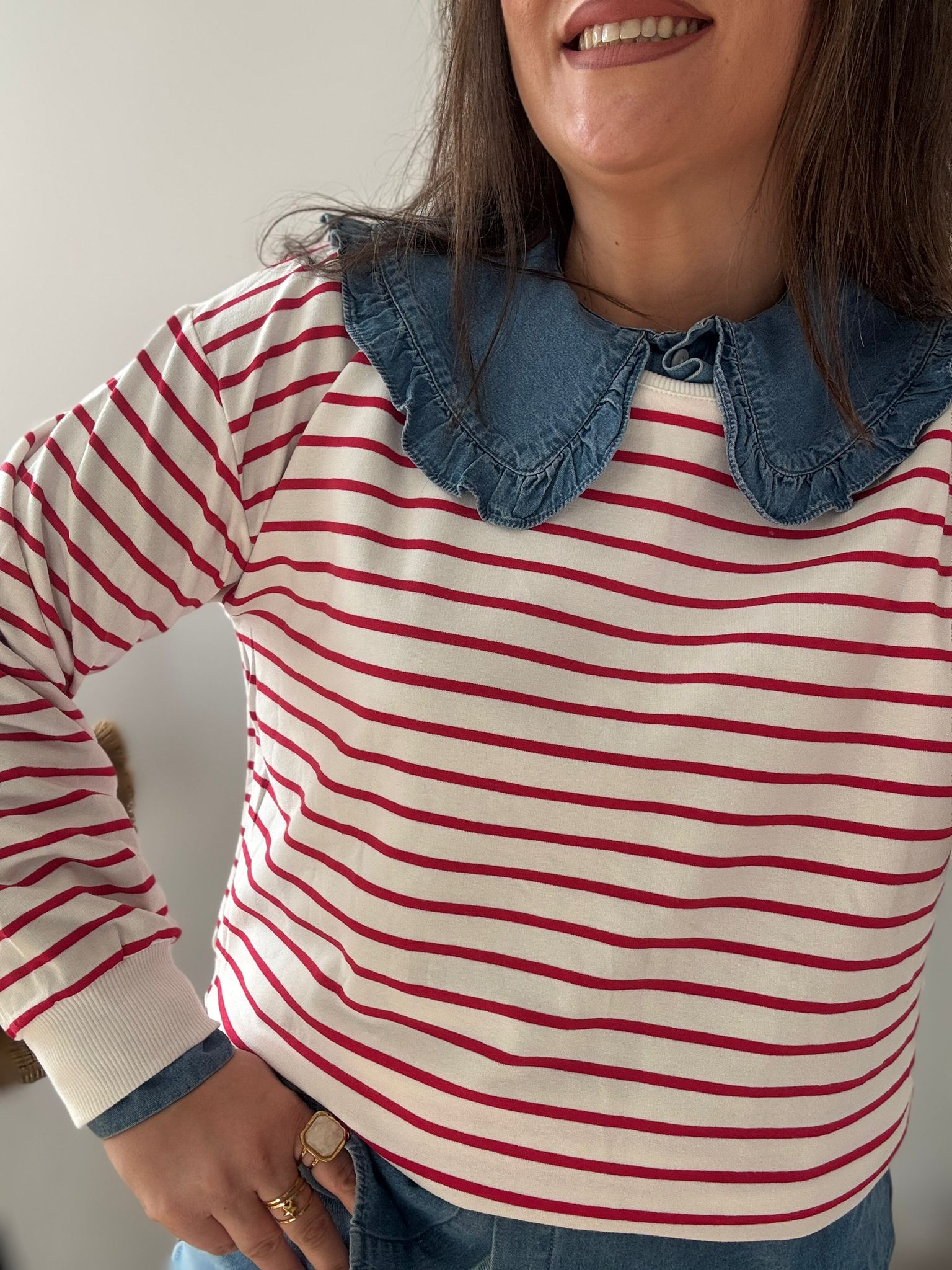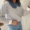 Sudadera estilo Navy. Ana lleva habitualmente talla L/40 y de este modelo lleva talla L. Medidas de contorno de pecho por tallas: S 114, M118 y L 122cm