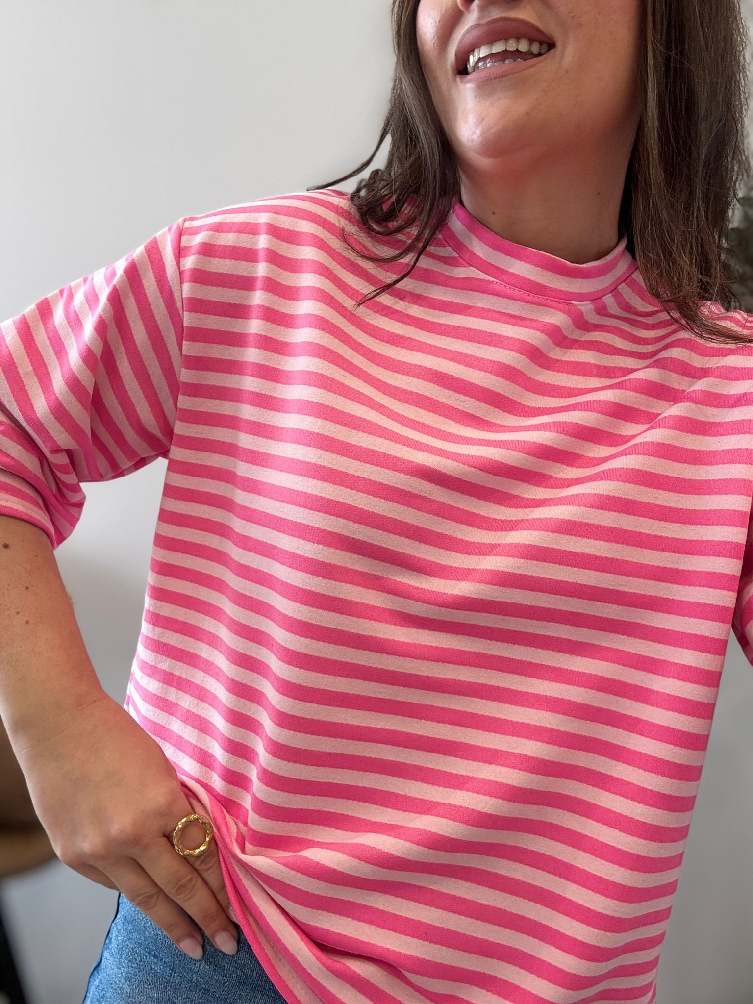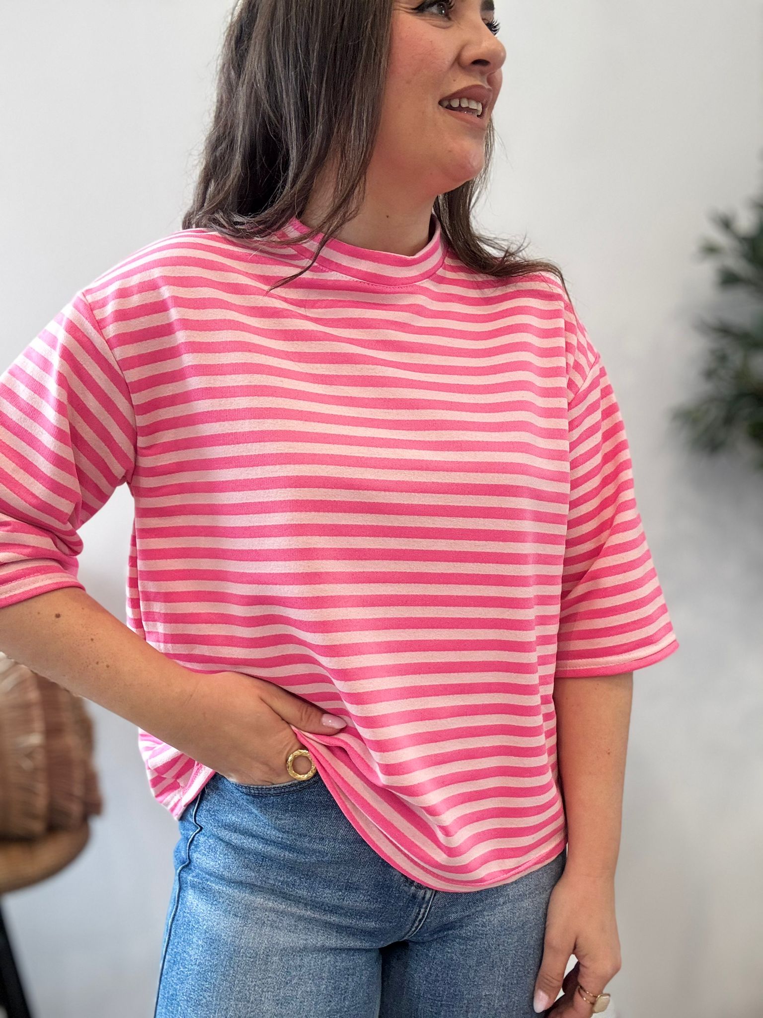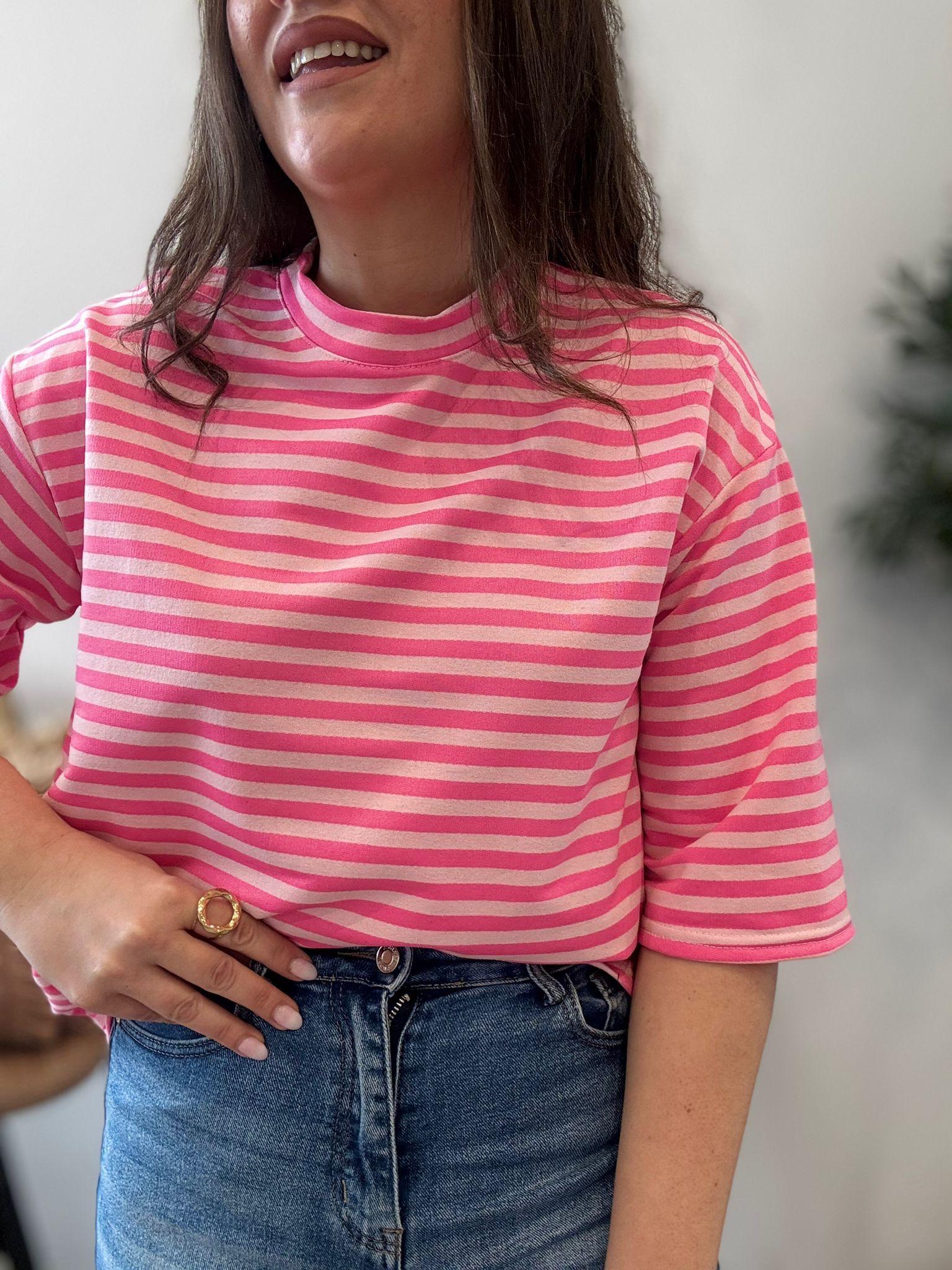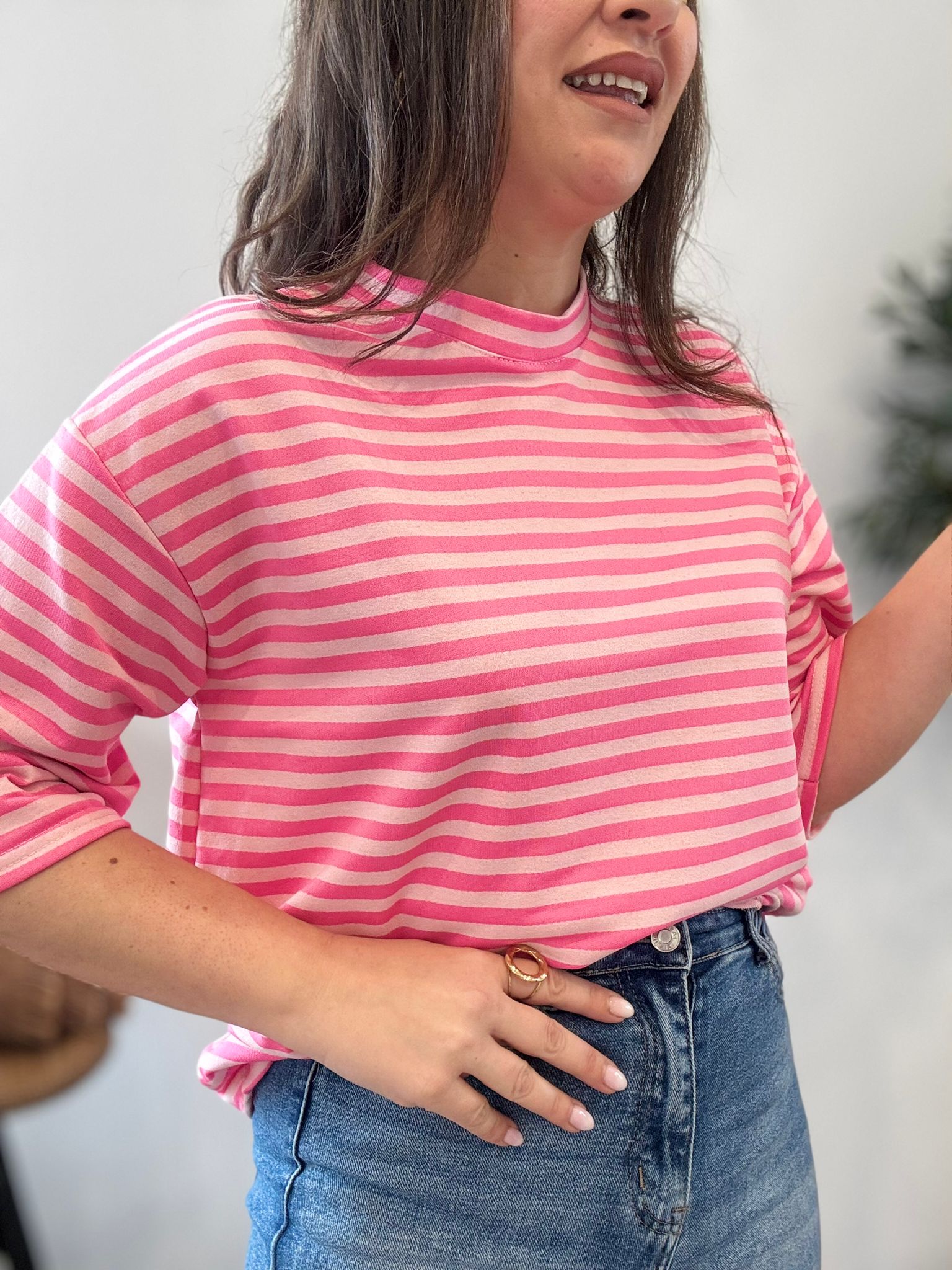 Sudadera a rayas con media manga. TU RECOMENDADA 36/44. Ana lleva habitualmente talla L/40. Medidas de la sudadera: contorno de pecho 118 y largo 62cm