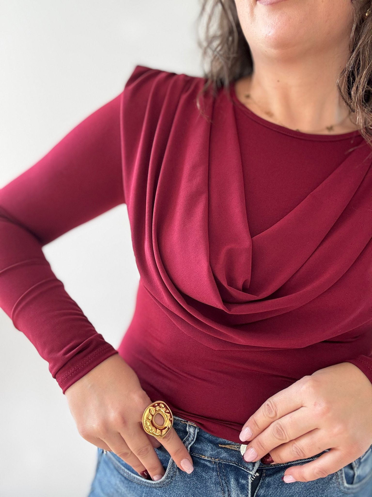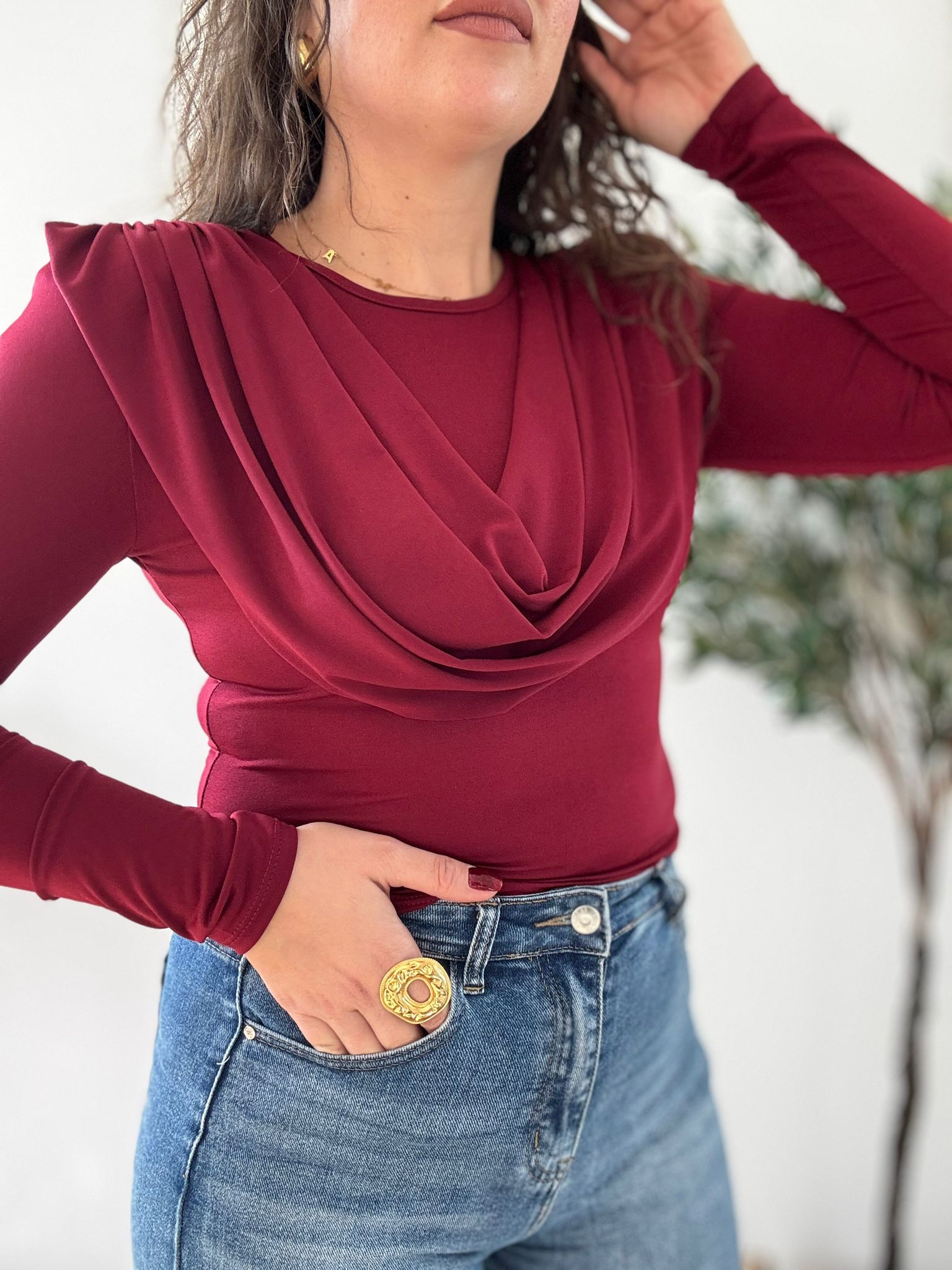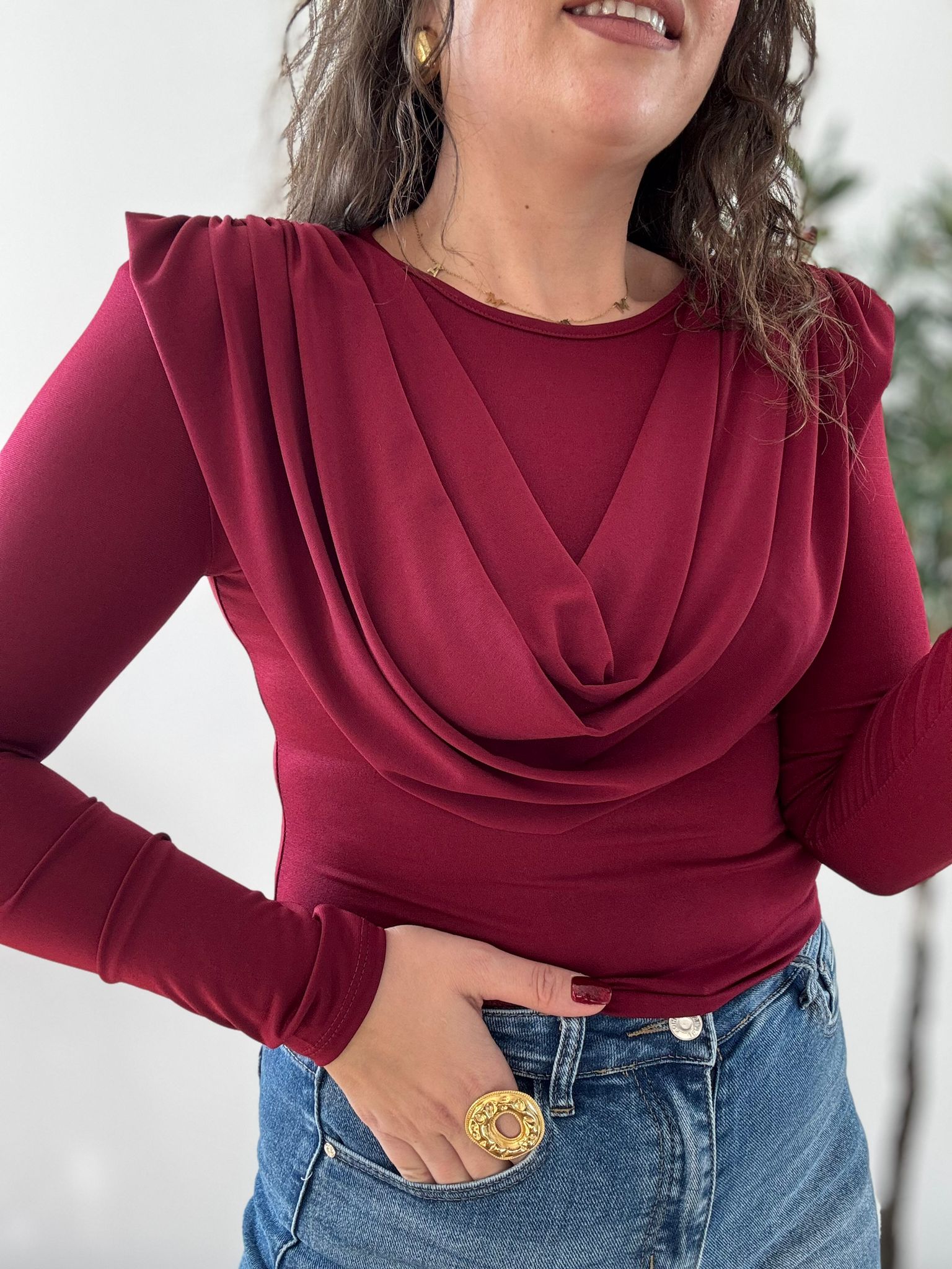 Top de licra elástico con detalle de tela caída sobre el escote. Lleva hombreras. TU RECOMENDADA 34/40. Ana lleva habitualmente talla 40/42