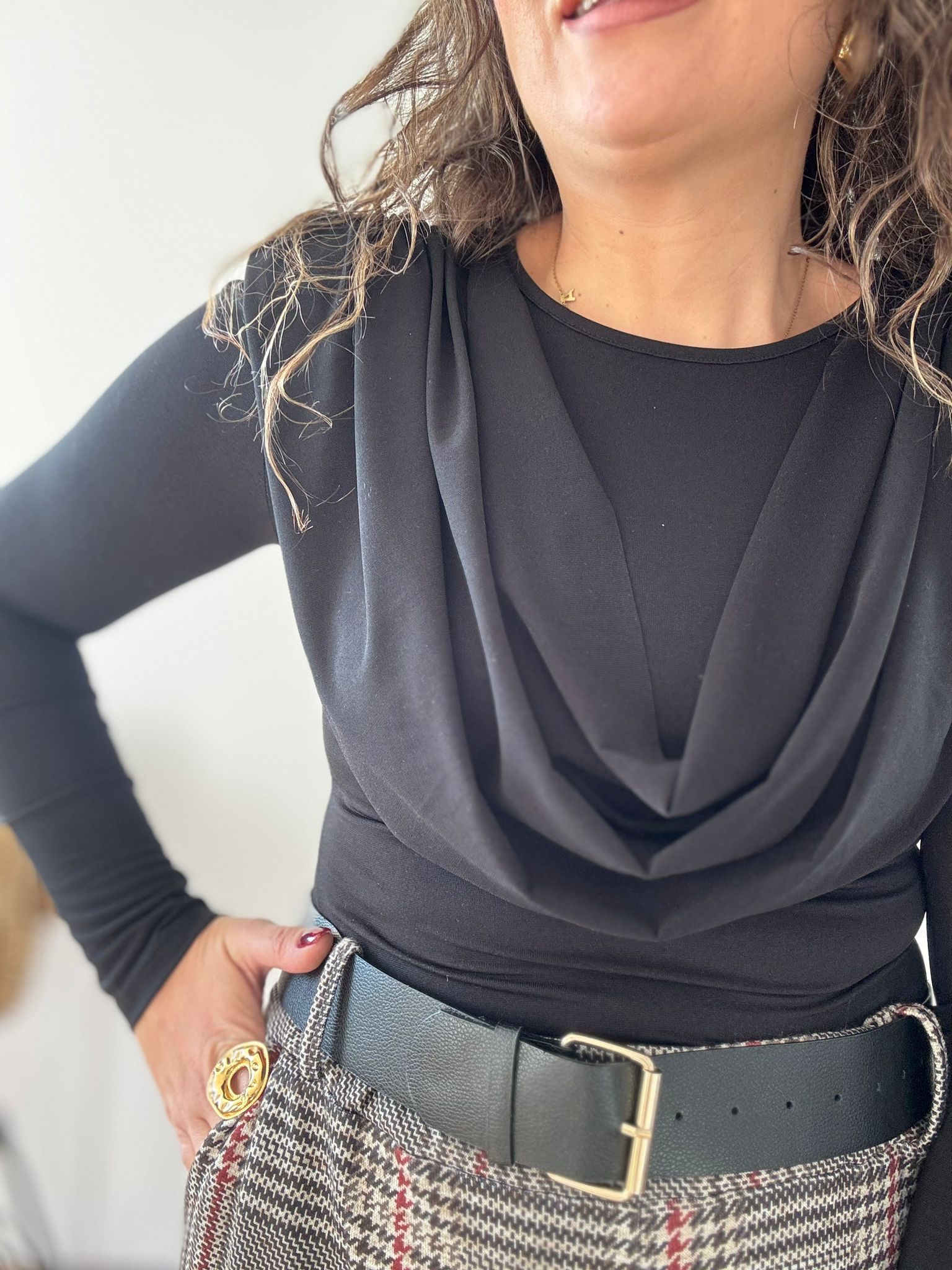 Top de licra elástico con detalle de tela caída sobre el escote. Lleva hombreras. TU RECOMENDADA 34/40. Ana lleva habitualmente talla 40/42