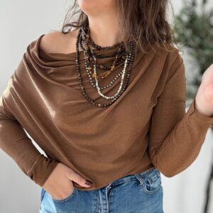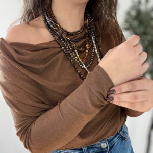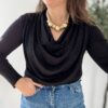 Top de lurex con un sutil brillo. Tiene cuello cascada multiposicion. No pica. TU RECOMENDADA 36/44. Ana lleva habitualmente talla 40/42. Es elástico