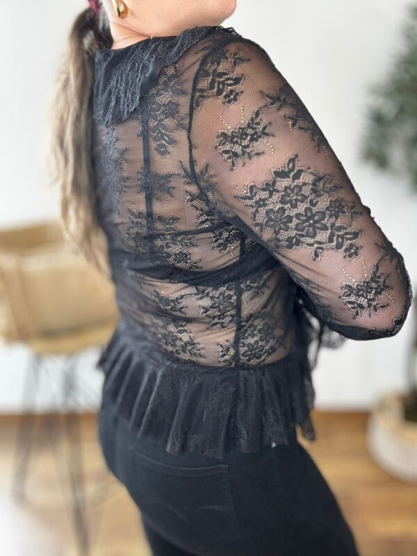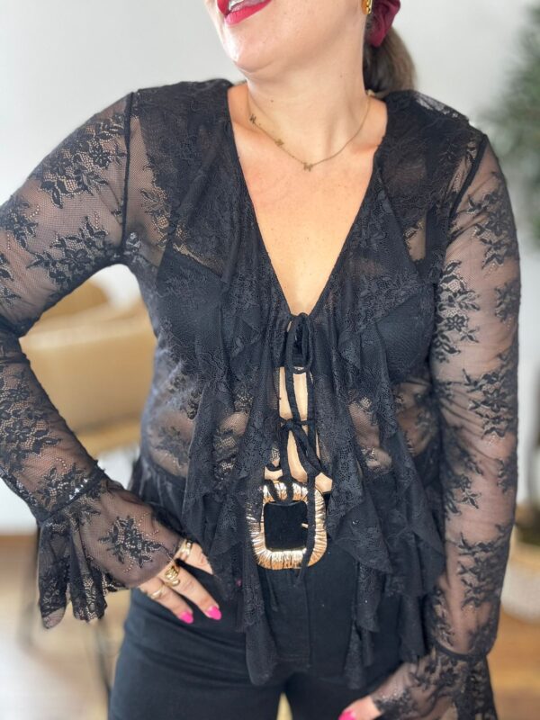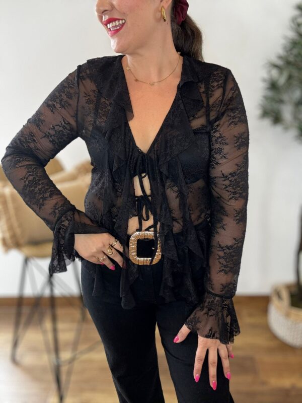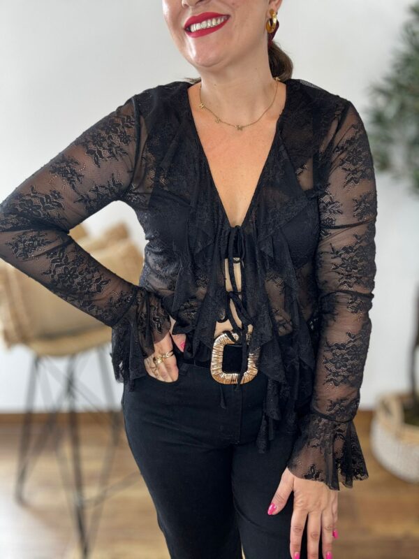 Top de encaje y transparencias con volantes y lazadas al pecho. TU RECOMENDADA 34/42. Ana lleva habitualmente talla L 40/42. Tiene un poquito de elástico. Puedes llevarlo solo (como en la foto) o con algún top básico debajo.