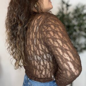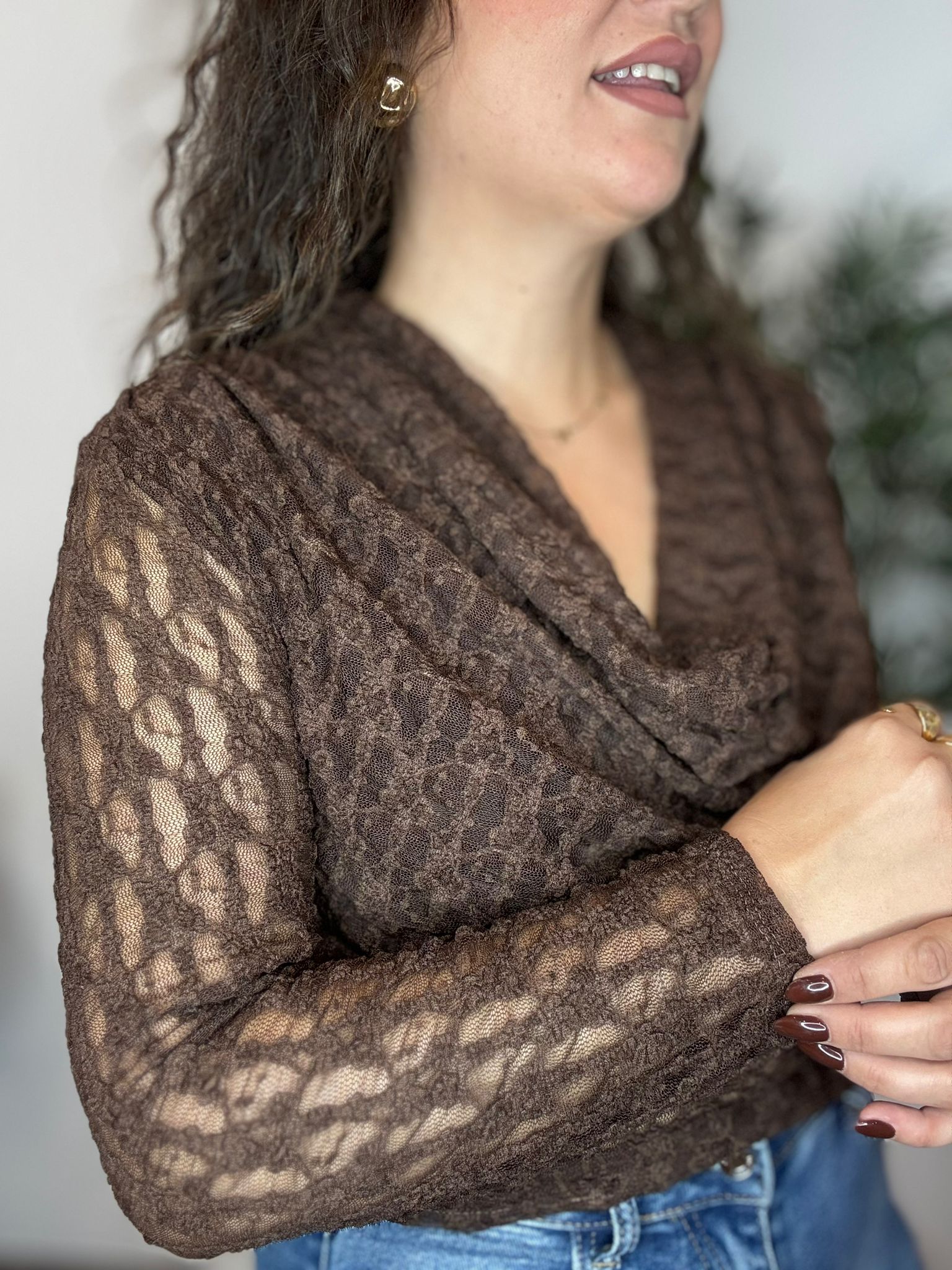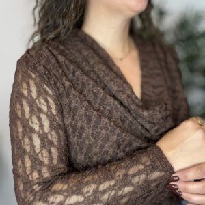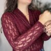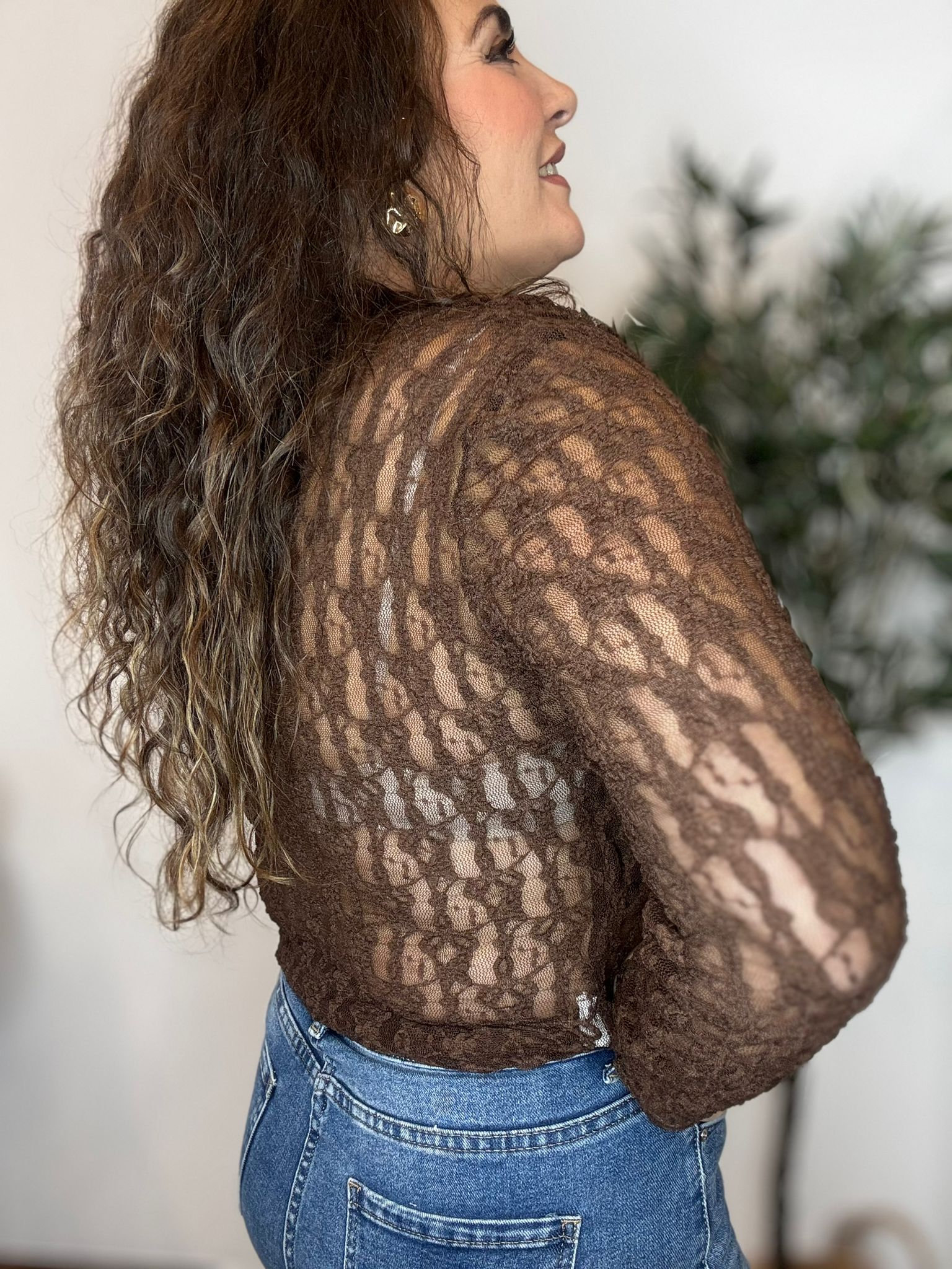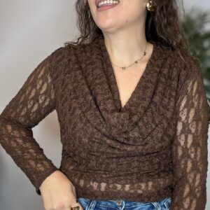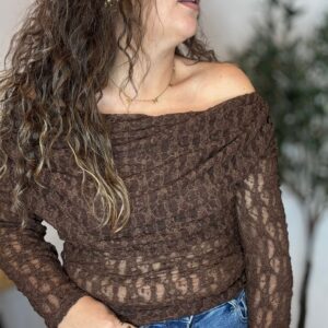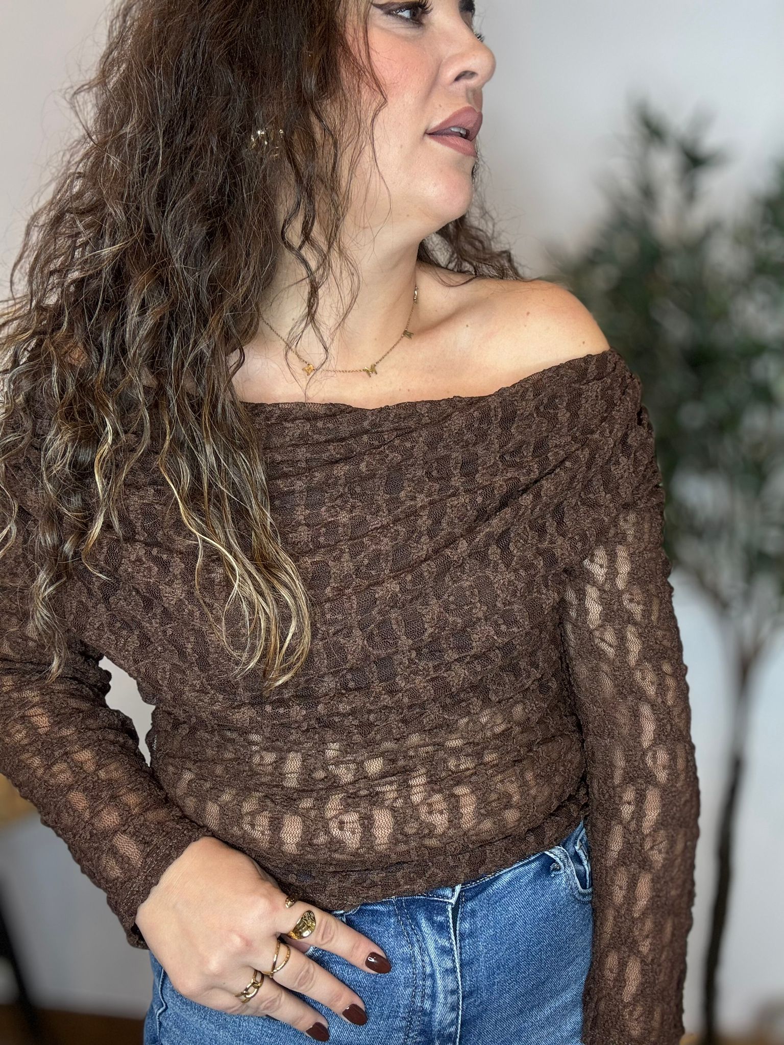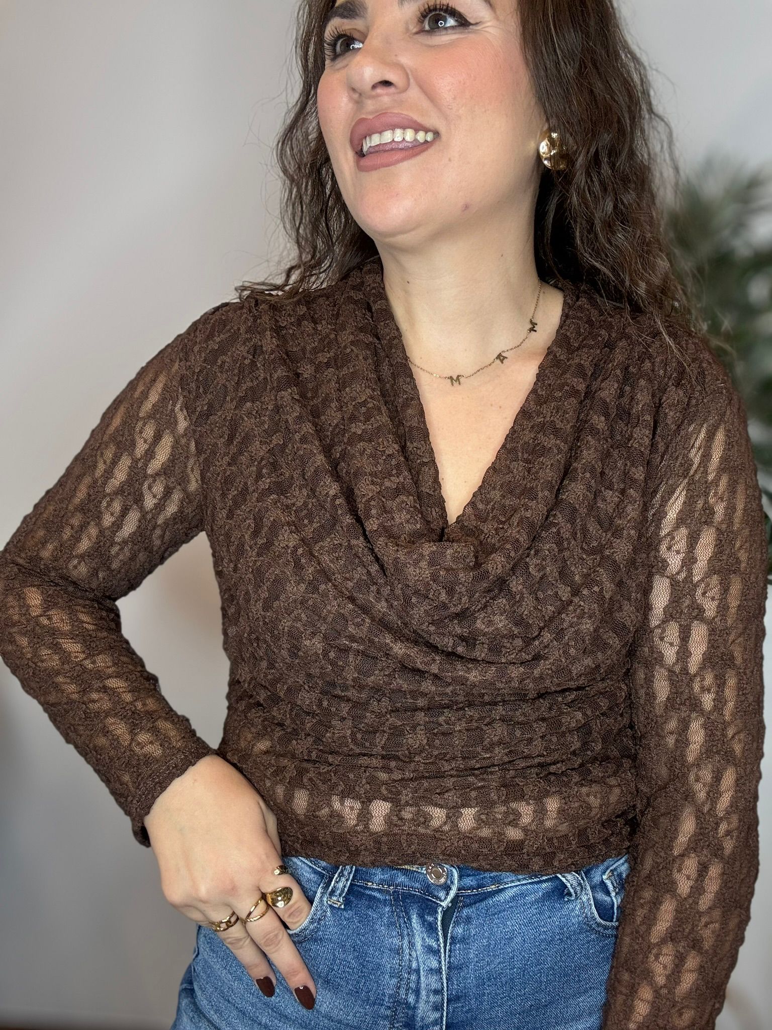 Top de encajes con forro en la parte delantera y escote caído multiposicion. Es elástico. TU RECOMENDADA 34/42. Ana lleva habitualmente talla L 40.
