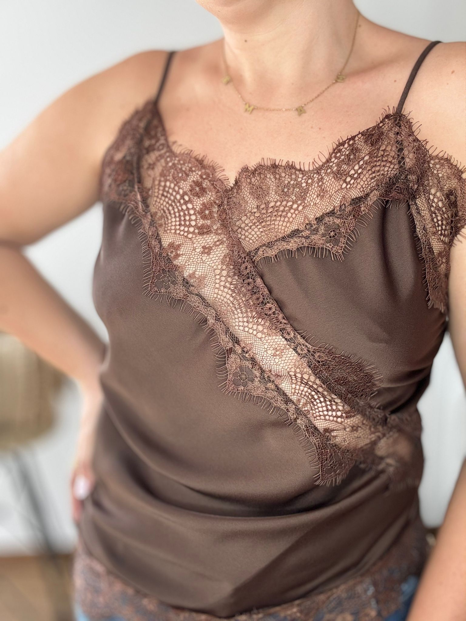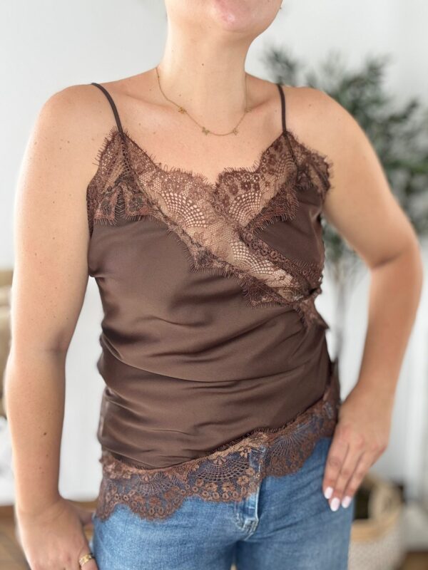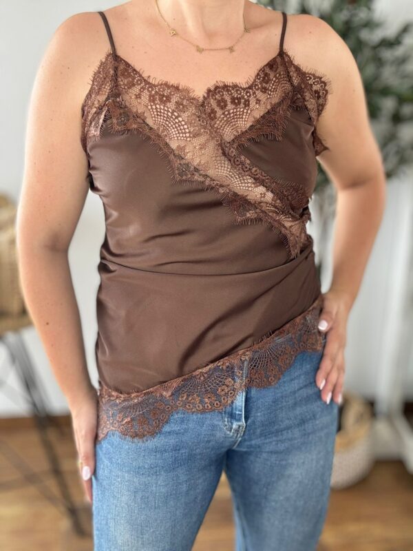 Top lencero con pico asimétrico en el bajo. Tiene tirantes elásticos. TU RECOMENDADA 34/40. Ana lleva habitualmente talla L 40/42. Medida de contorno 100cm