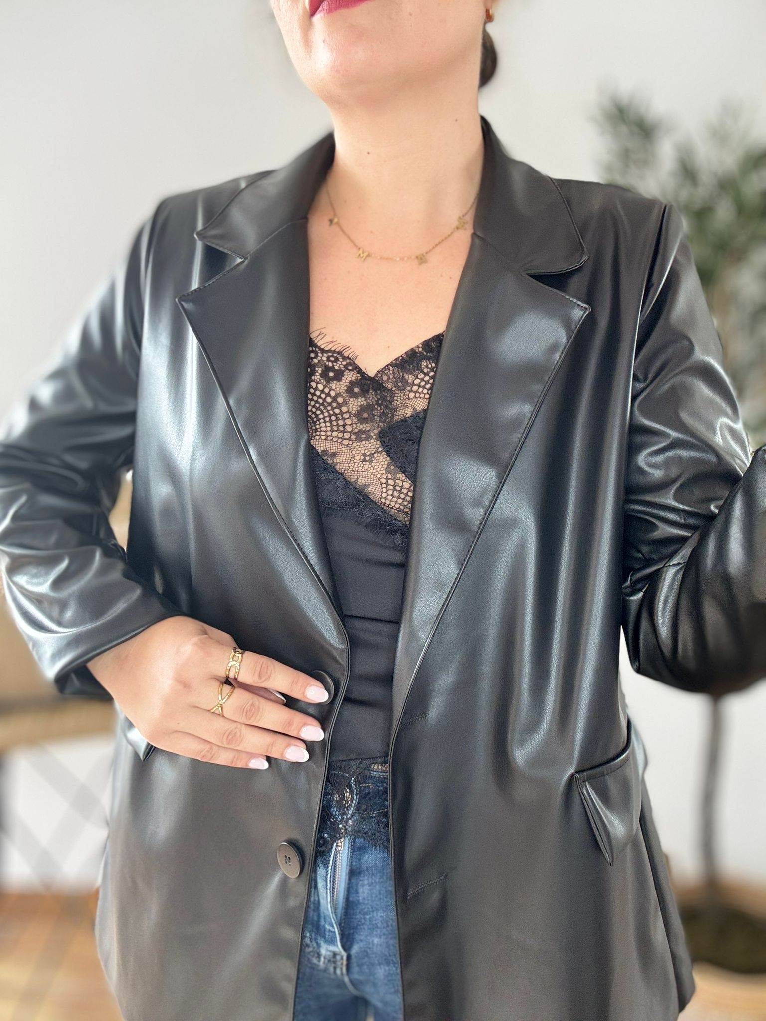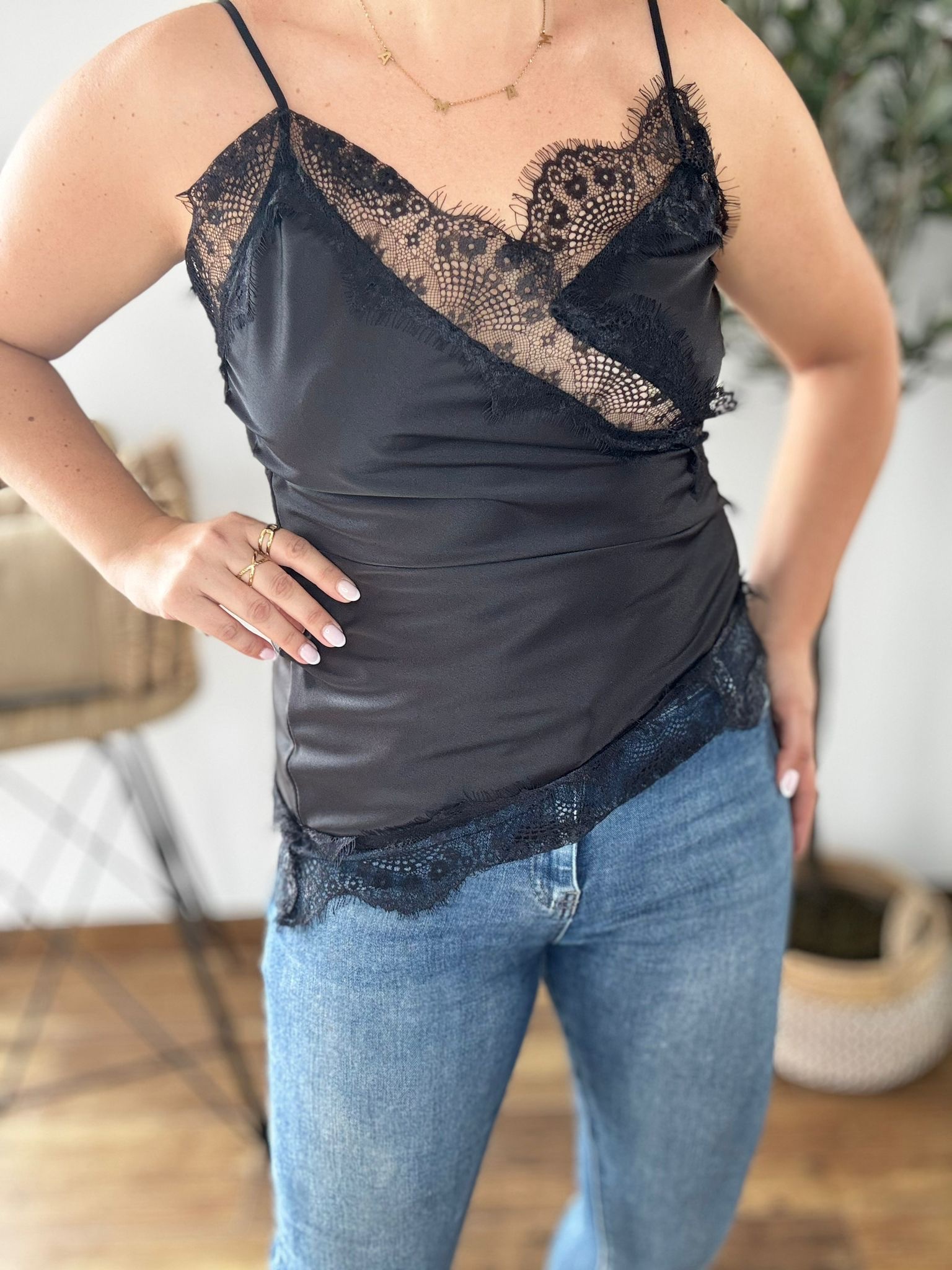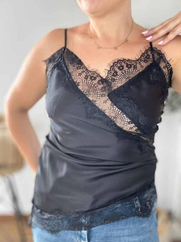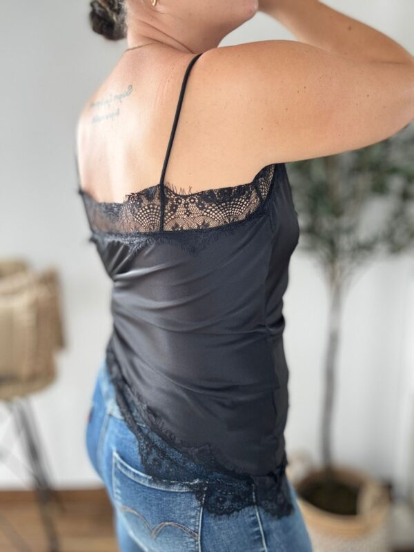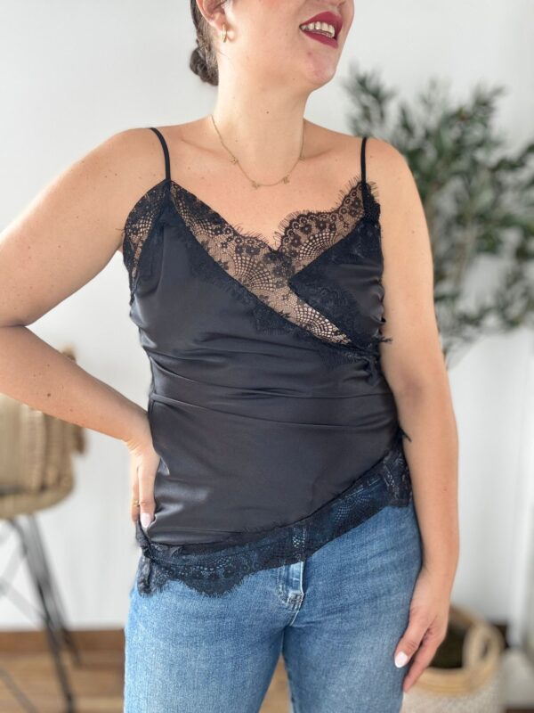 Top lencero con pico asimétrico en el bajo. Tiene tirantes elásticos. TU RECOMENDADA 34/40. Ana lleva habitualmente talla L 40/42. Medida de contorno 100cm