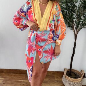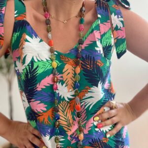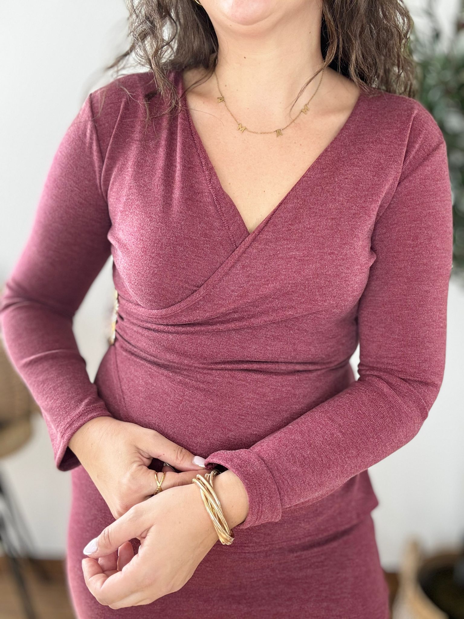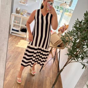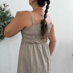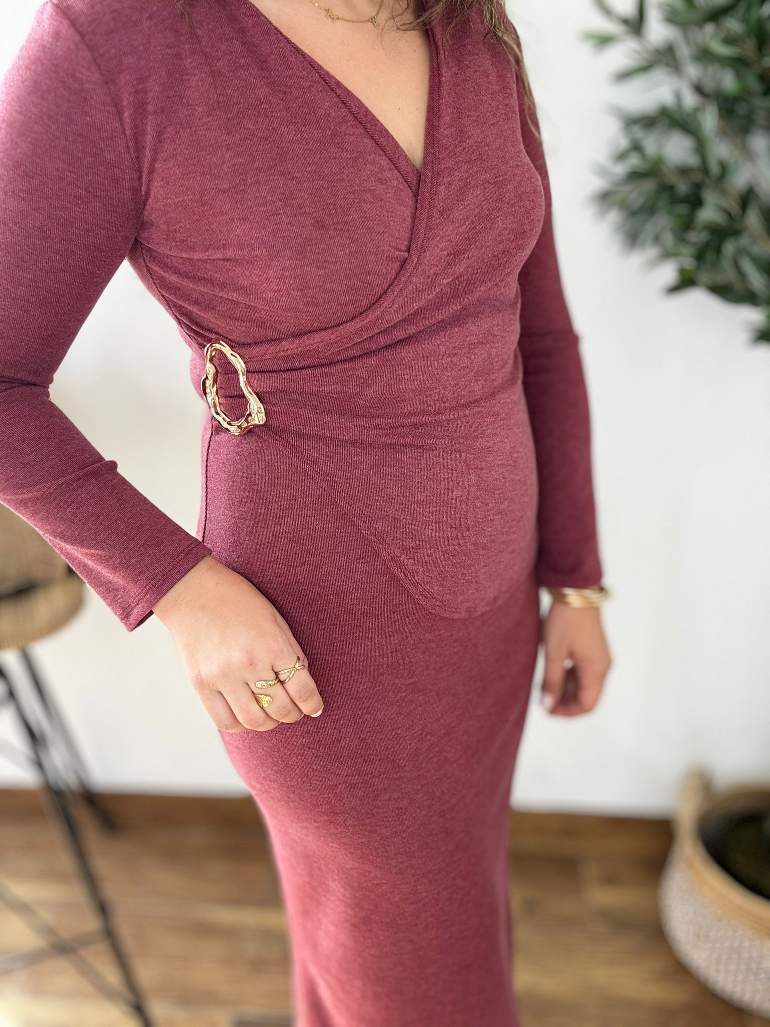 Vestido de punto suave con detalle de hebilla en dorado y fruncido en la parte delantera. TU RECOMENDADA 36-42. Ana lleva habitualmente talla L 40/42 y mide 1.71m Es elástico. Medidas del vestido: contorno de pecho estirado 115, cadera 120 y largo 124cm