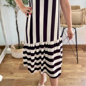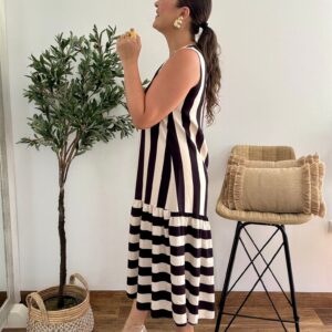 Vestido bicolor con rayas horizontales y verticales y volante bajo. TU RECOMENDADA 36/40. Ana lleva habitualmente talla L 40/42 y mide 1.71m