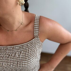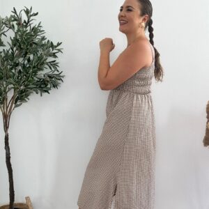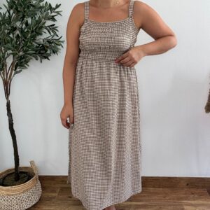 vestido estampado VICHY engomado en la parte superior. Abertura lateral. TU RECOMENDADA 34/42. Ana lleva habitualmente talla L 40/42 y mide 1.71m