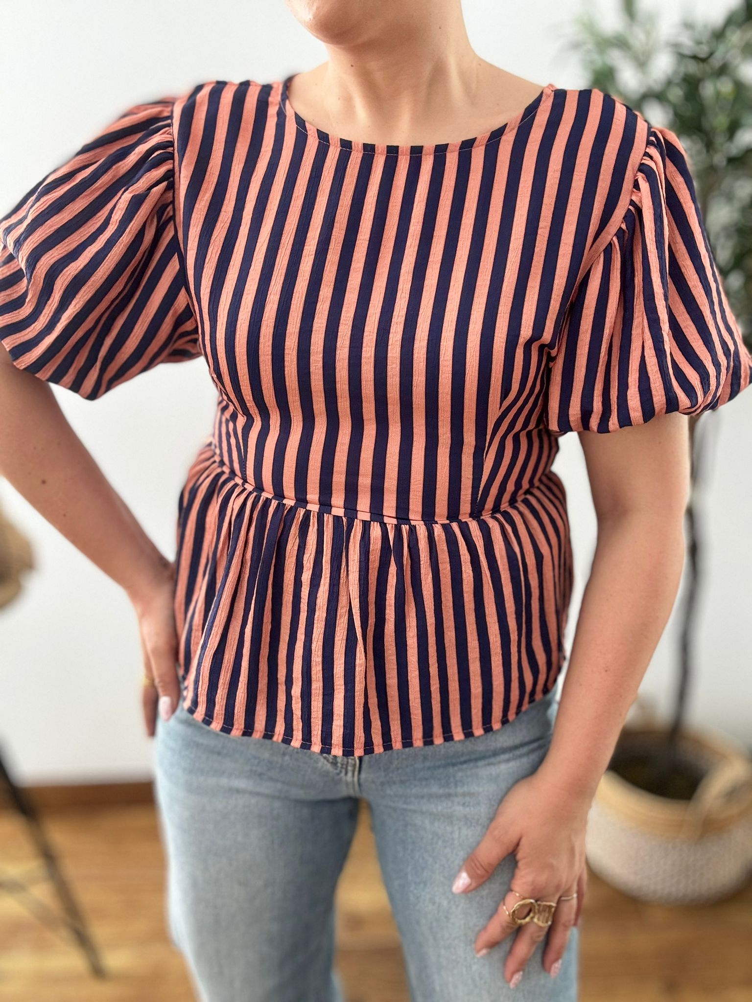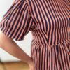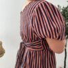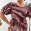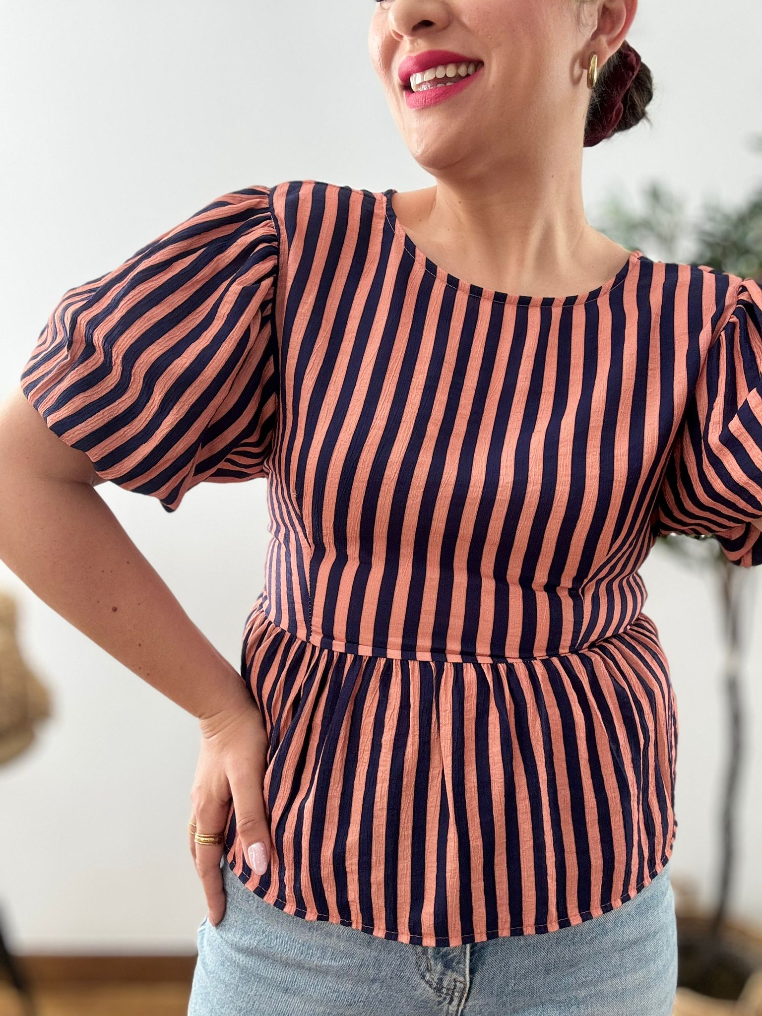 La combinación de rayas bicolor es ideal de bonita, además el toque de la cintura y la lazada trasera la hace una blusa muy especial.