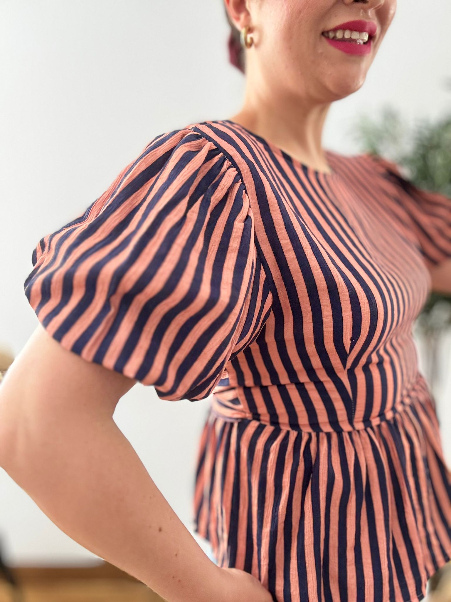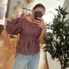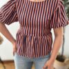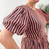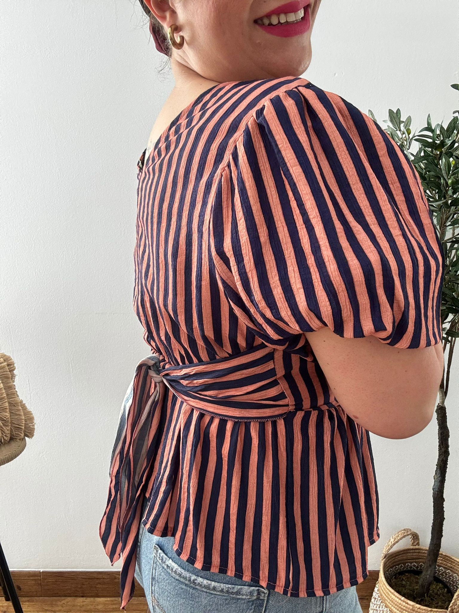 Blusa a rayas con escote V y lazada trasera. Lleva mangas abullonadas.