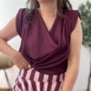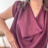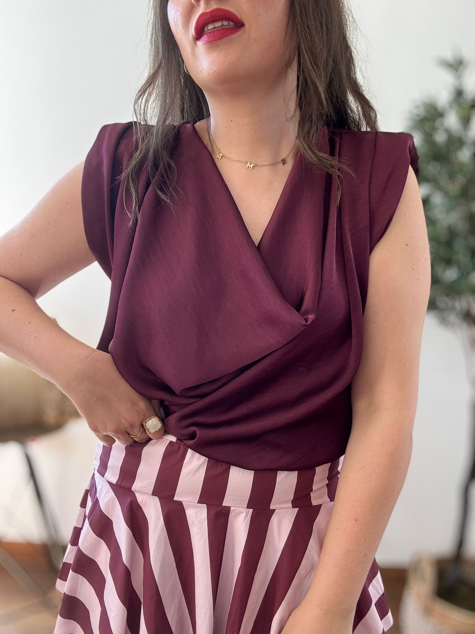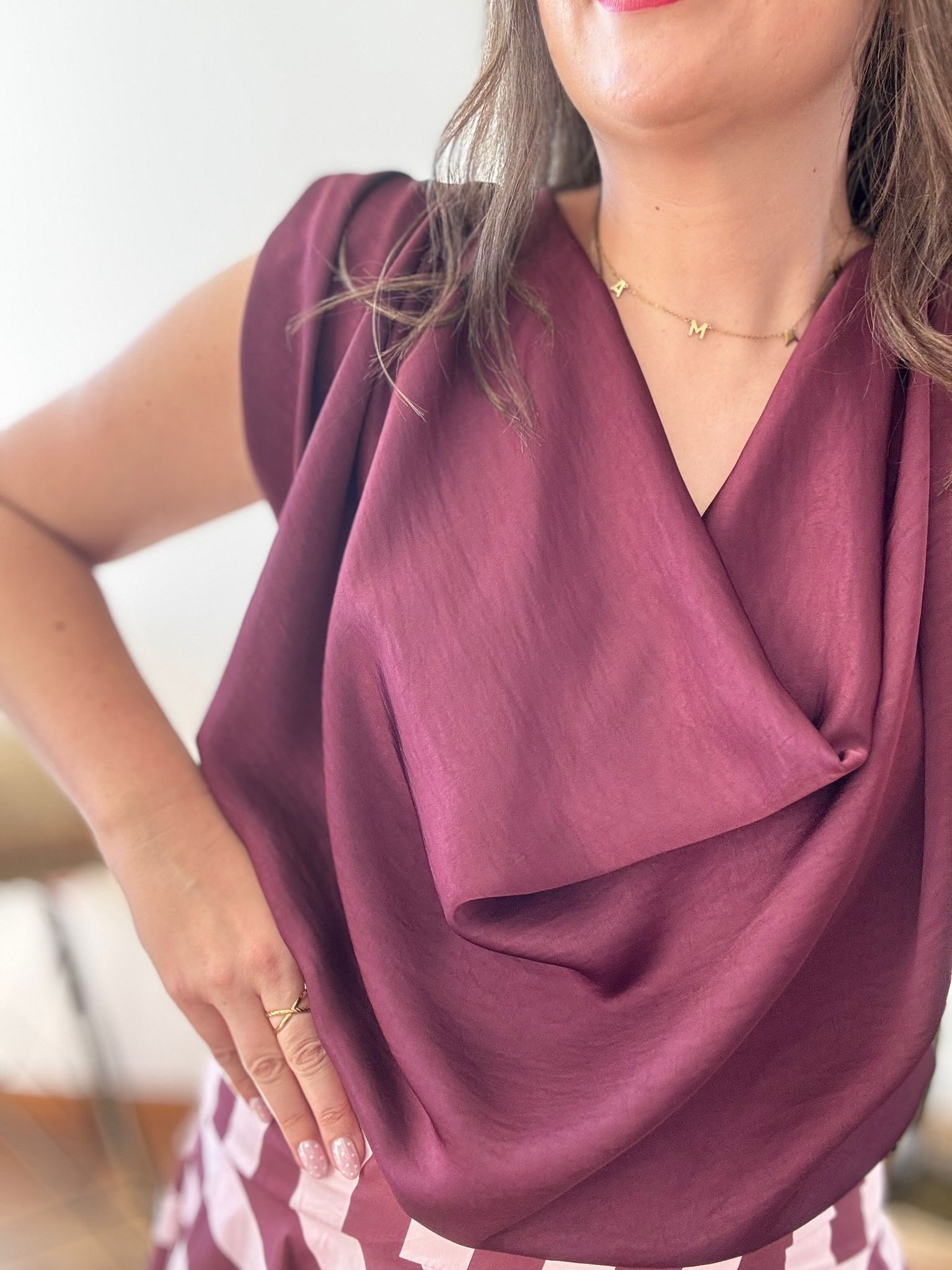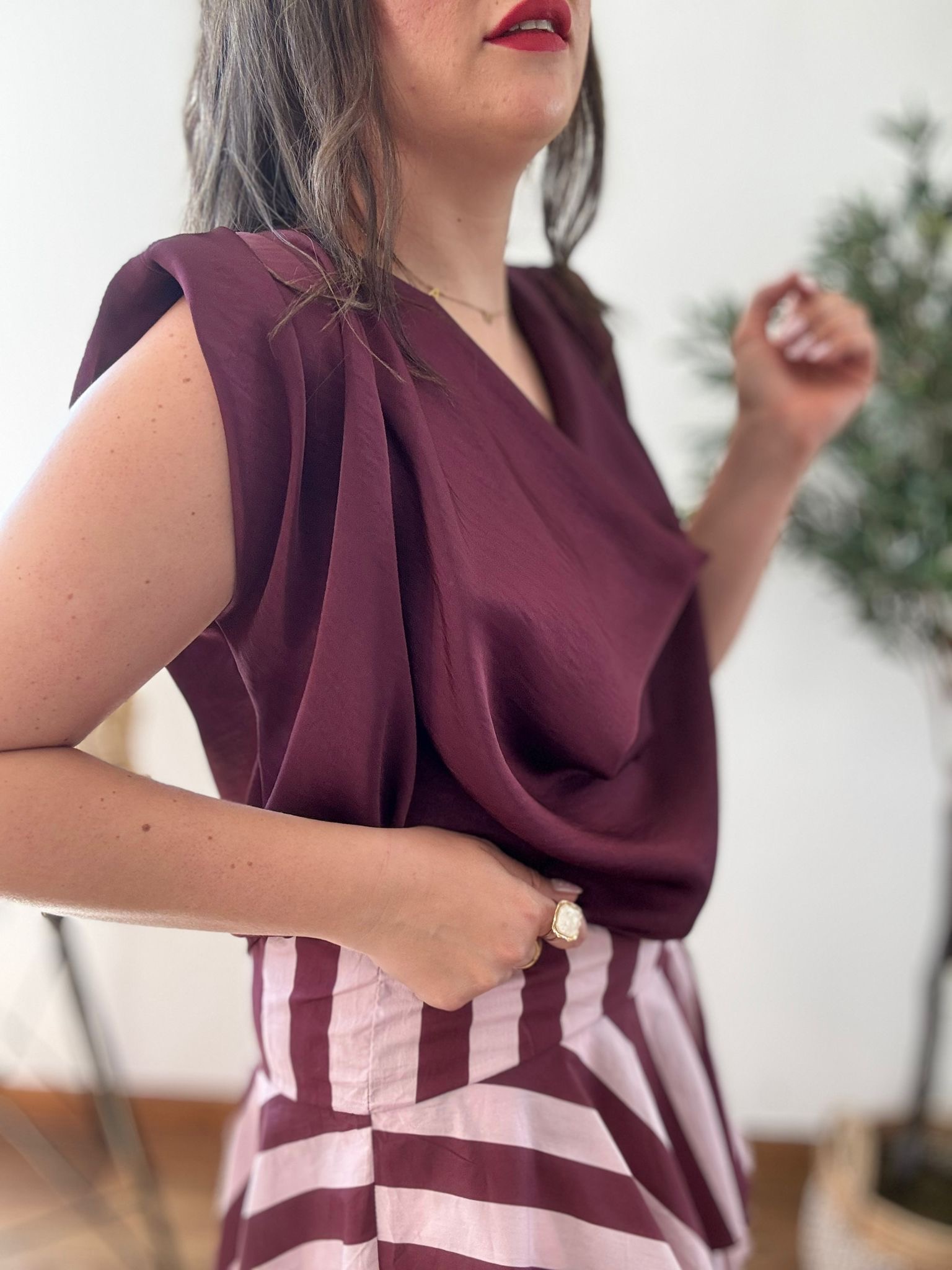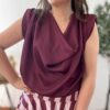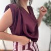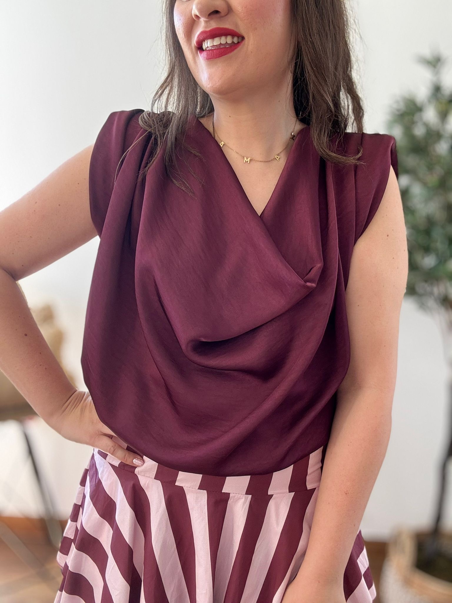 Añade un toque de lujo a tu armario con esta blusa de satén en color burdeos. Su cuello drapeado y diseño sin mangas crean una silueta sofisticada y femenina. Confeccionada en un tejido fluido de acabado brillante, es la prenda ideal para destacar en eventos nocturnos o citas especiales.