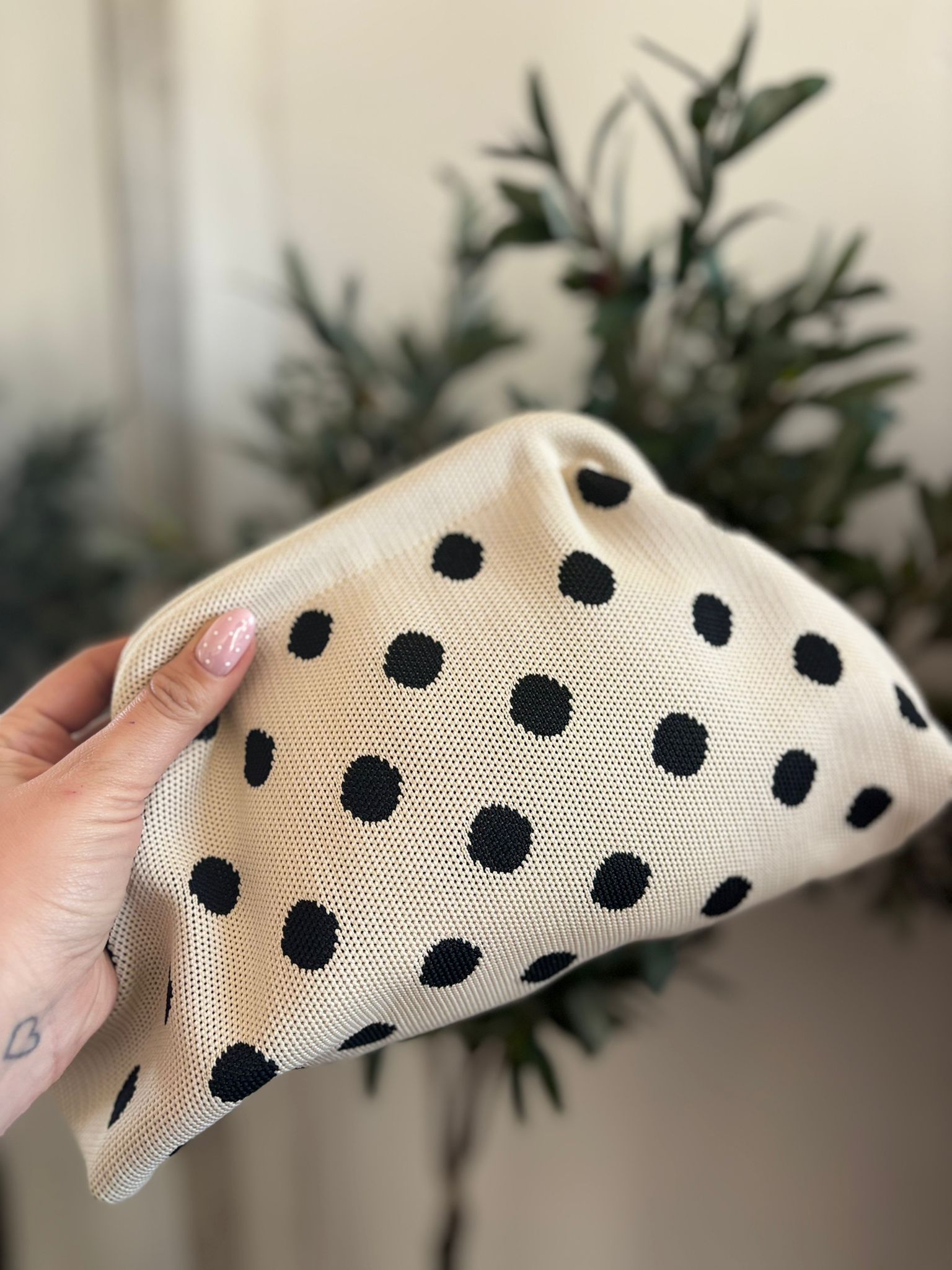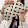 Este clutch no es solo un accesorio, es una declaración de estilo. Te encantará por su tejido suave de alta calidad y su estampado de lunares negros sobre fondo beige, una combinación clásica que nunca pasa de moda. Su formato flexible y ligero lo hace increíblemente cómodo de llevar, adaptándose perfectamente a tu mano mientras mantiene todos tus esenciales seguros. Es la pieza clave para transformar un conjunto básico en un look con personalidad y encanto