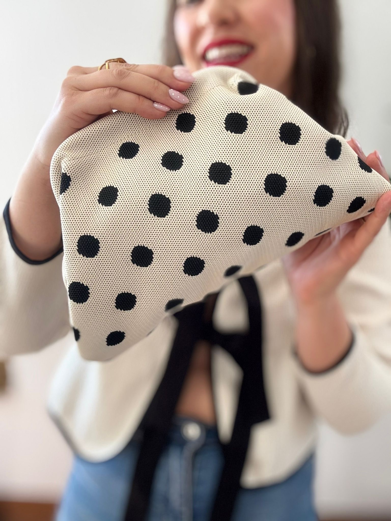Este bolso clutch de tejido con lunares es el accesorio perfecto para añadir un toque de sofisticación relajada a tu catálogo. Su diseño de inspiración parisina y textura suave lo convierten en una pieza atemporal y versátil para cualquier ocasión.