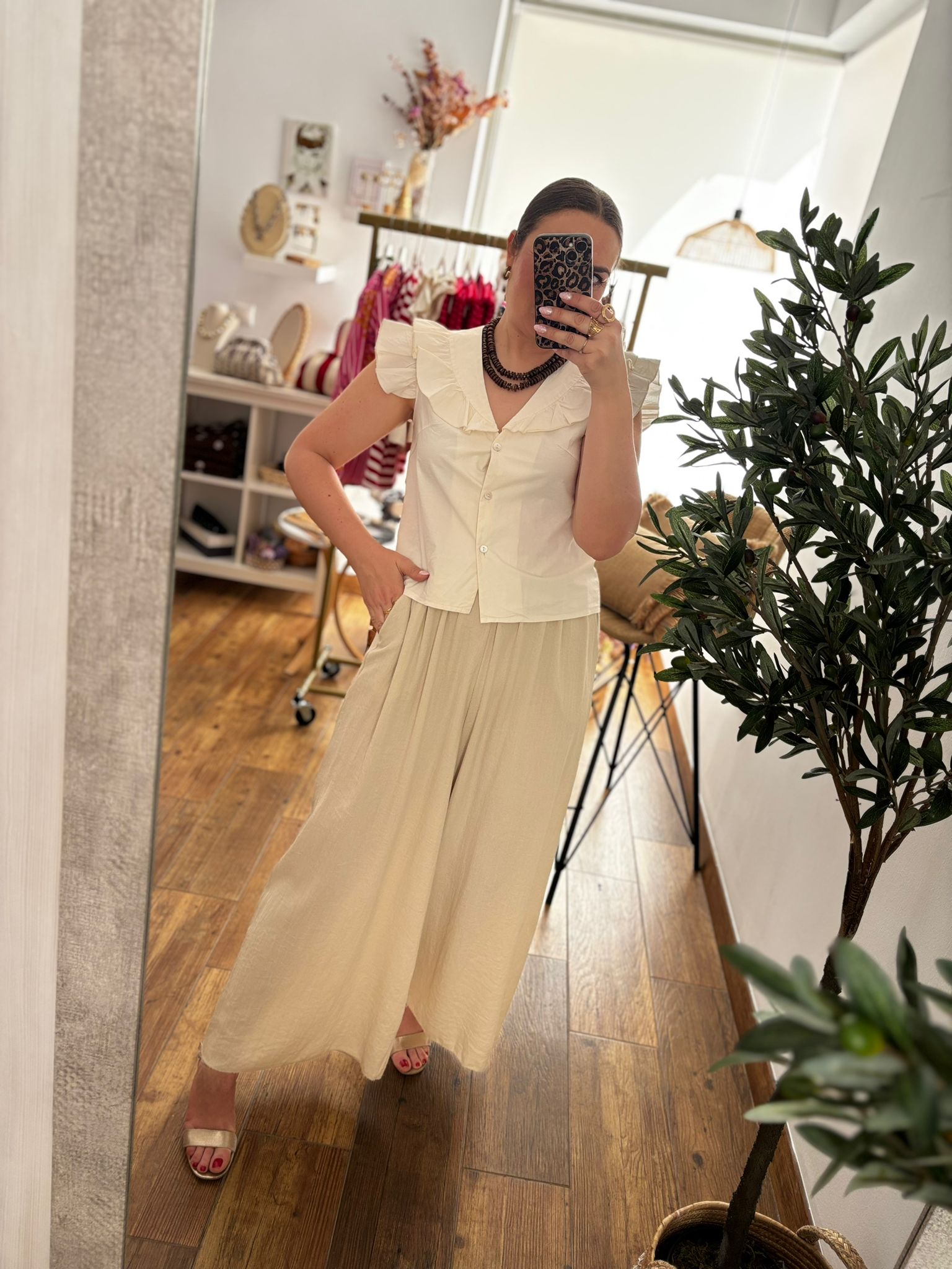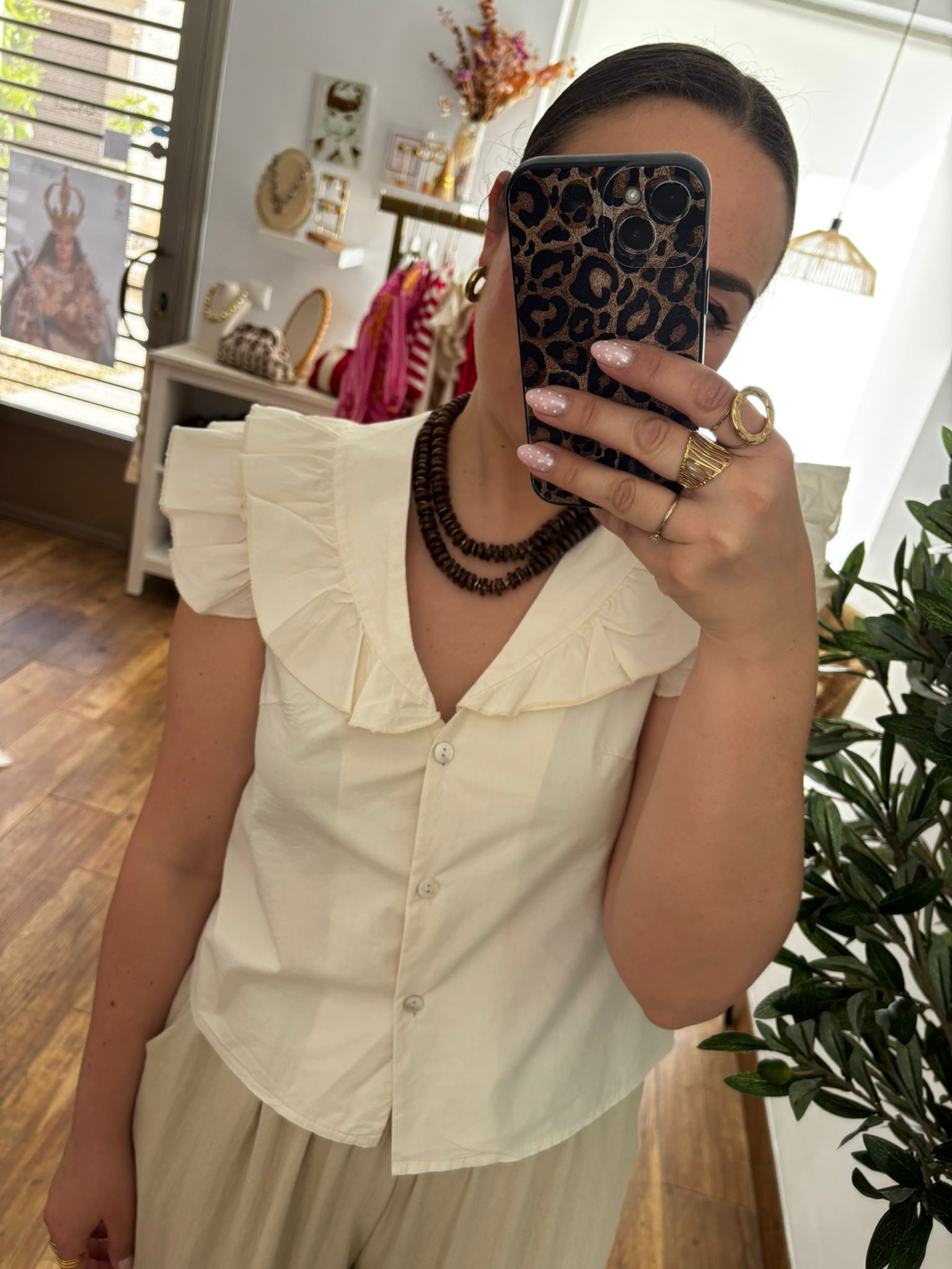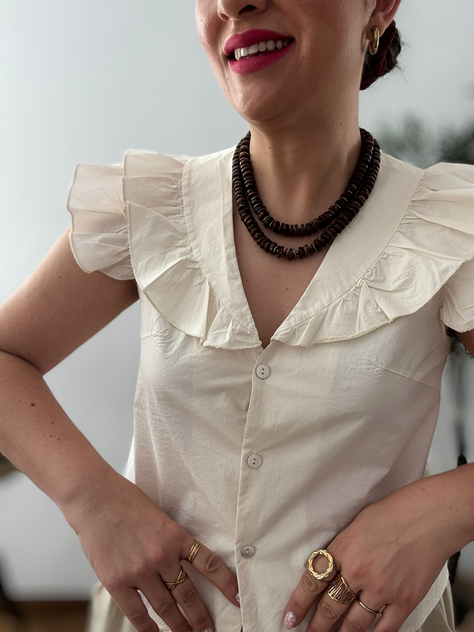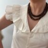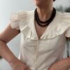 Llévala con pantalones o faldas de talle alto y collares en tonos marrones o dorados