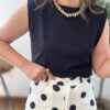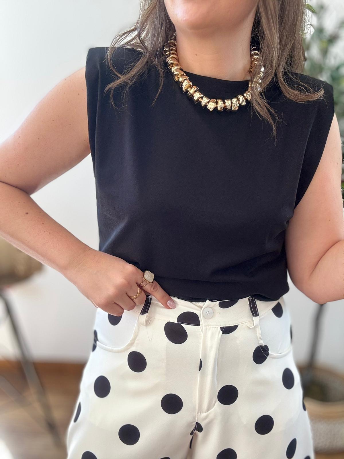 Para un aire chic y divertido, haz como en la foto: combínala con unos pantalones de lunares (o cualquier estampado geométrico) para crear un contraste visual potente. Añade un collar de eslabones dorados XL para iluminar el rostro y unos mules negros. Si buscas algo más profesional, métela por dentro de unos pantalones de sastre beige y añade una blazer; tendrás un conjunto de oficina imbatible.