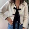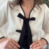 Te va a encantar porque es la prenda perfecta para conseguir ese look de «lujo silencioso» sin complicaciones. Es extremadamente versátil: su corte impecable y el contraste blanco y negro la convierten en una pieza que nunca pasa de moda. Además, los lazos le dan un toque dulce pero moderno que eleva cualquier conjunto básico de diario hacia algo mucho más chic y especial.