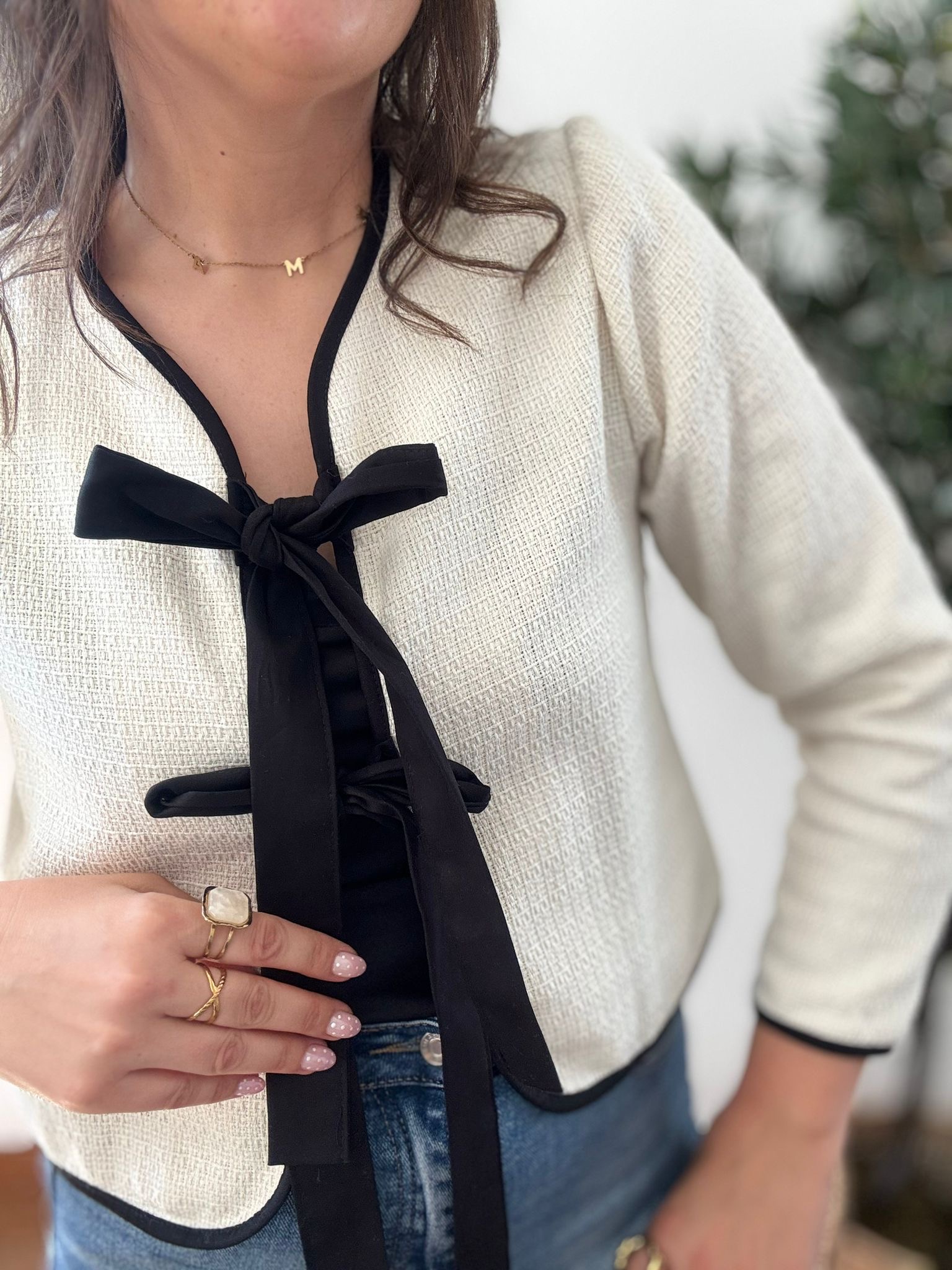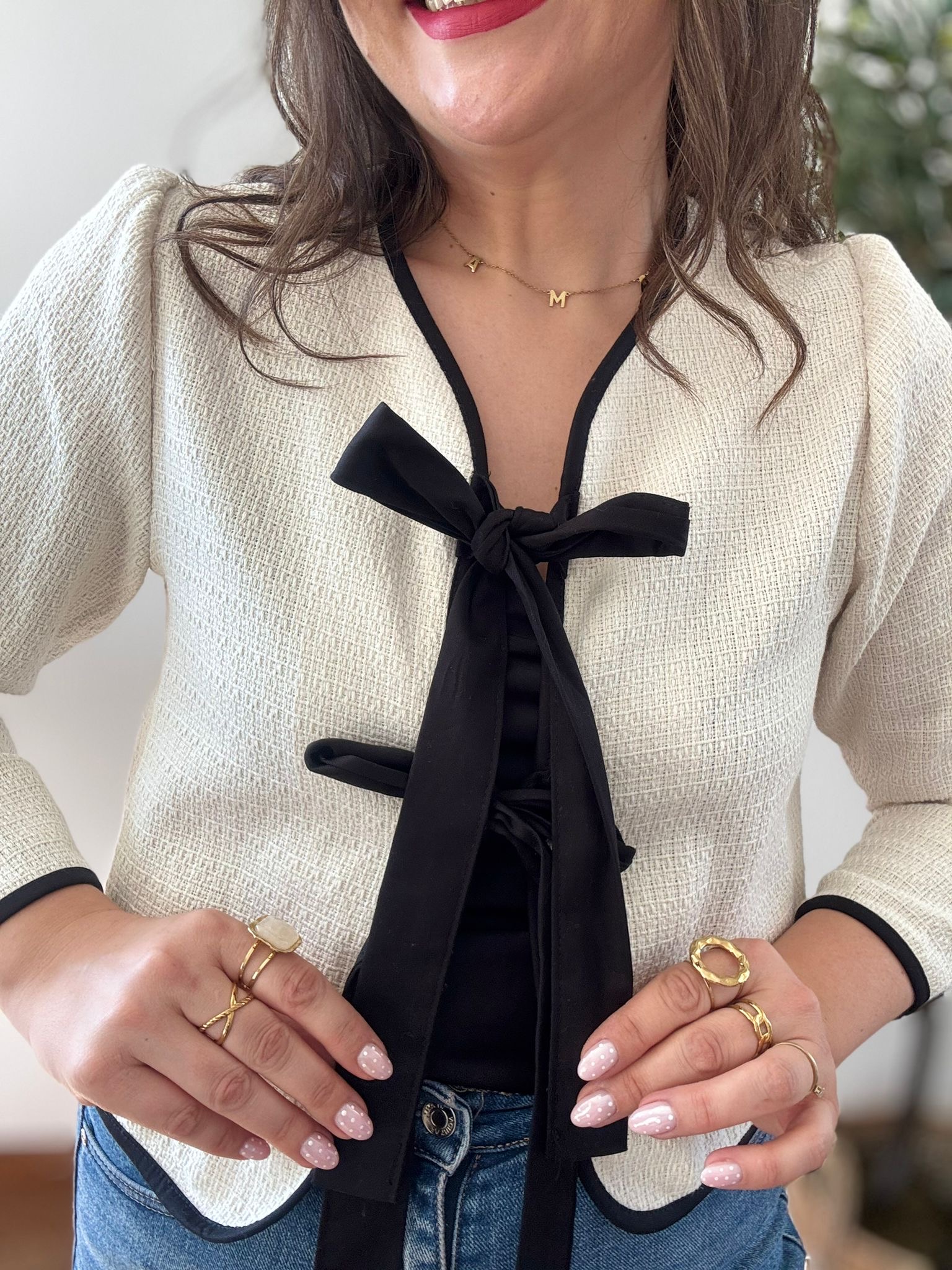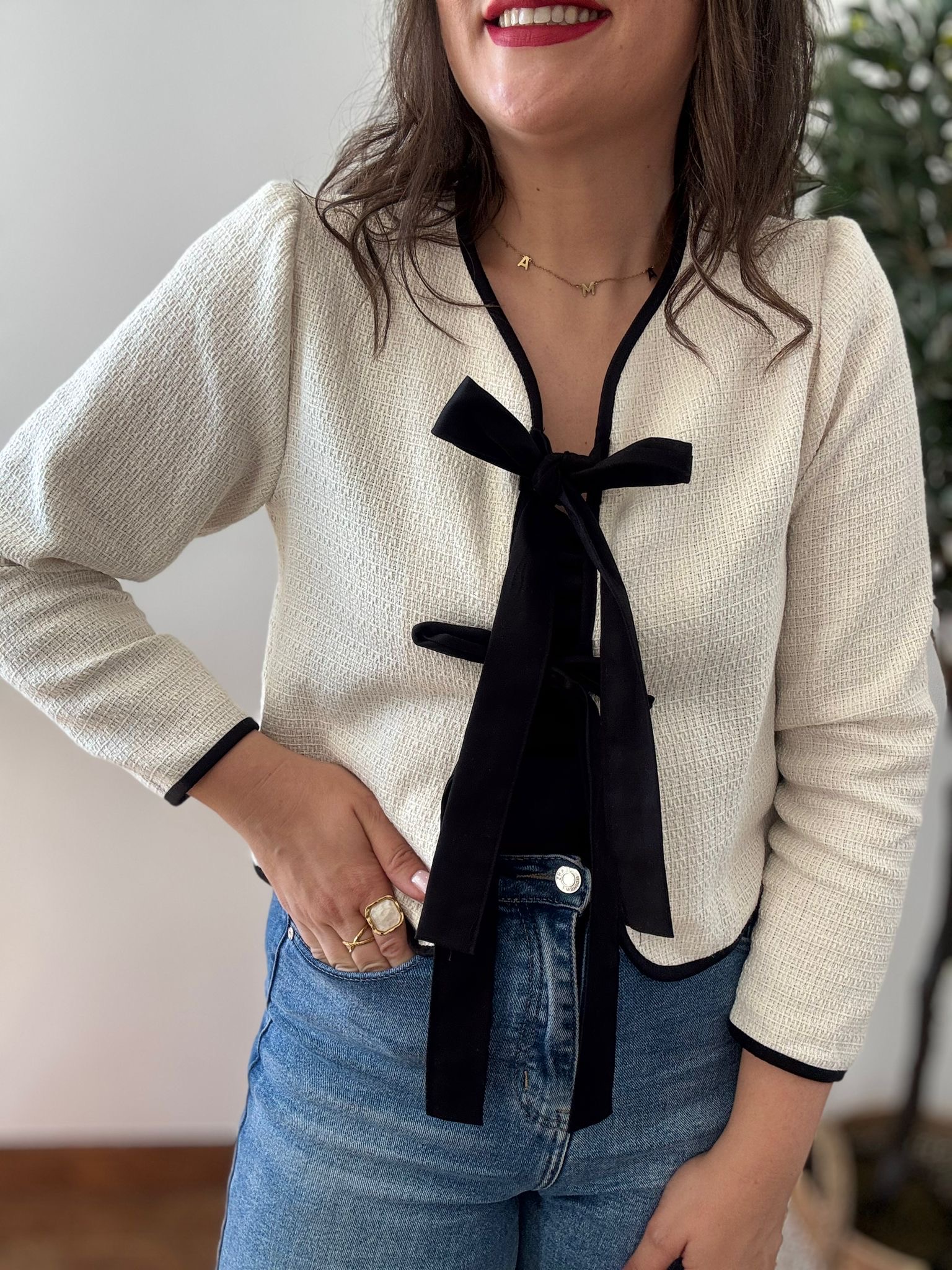 Chaqueta estructurada de manga larga confeccionada en un tejido con textura (similar al tweed) en tono crudo. Presenta un diseño frontal abierto, enmarcado por un ribete de contraste en color negro que recorre todo el perfil y los puños. Su característica más distintiva son los lazos frontales de cinta negra, que actúan como cierre y aportan un aire femenino y sofisticado de inspiración francesa.