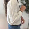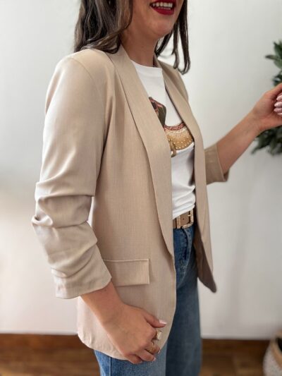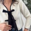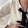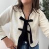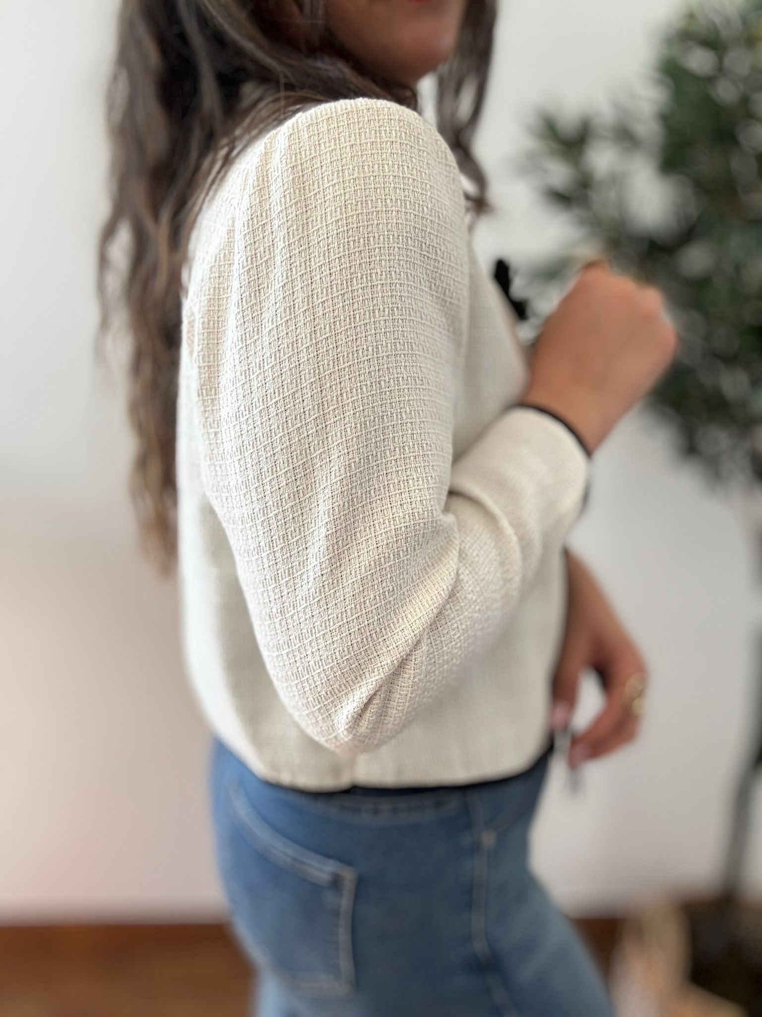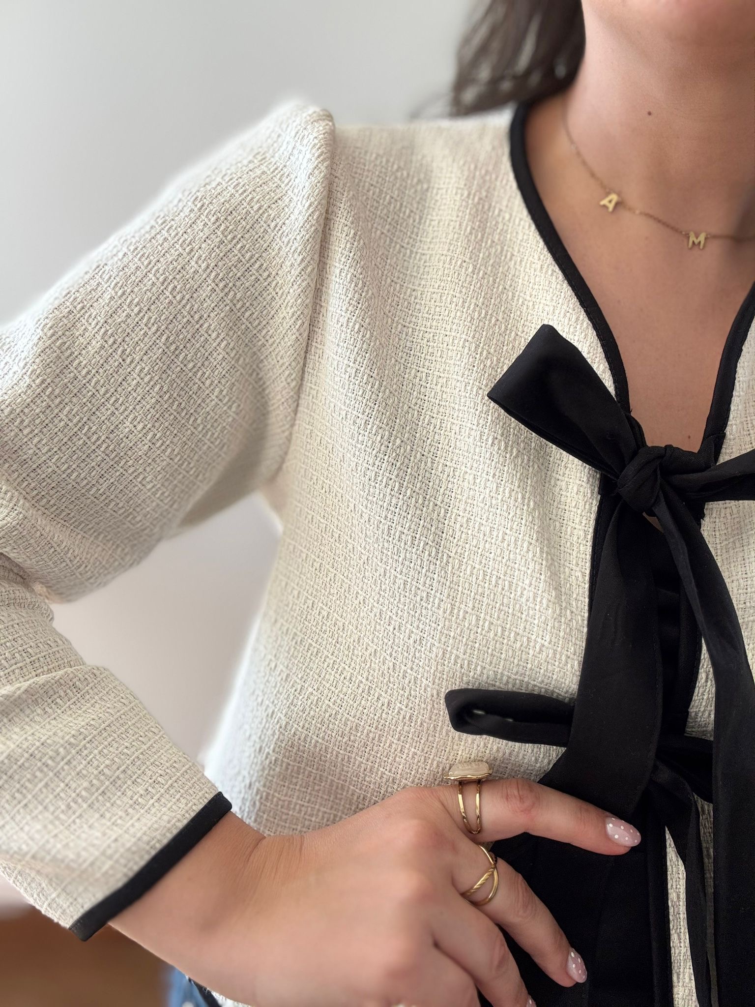 Chaqueta estructurada de manga larga confeccionada en un tejido con textura (similar al tweed) en tono crudo. Presenta un diseño frontal abierto, enmarcado por un ribete de contraste en color negro que recorre todo el perfil y los puños. Su característica más distintiva son los lazos frontales de cinta negra, que actúan como cierre y aportan un aire femenino y sofisticado de inspiración francesa.