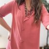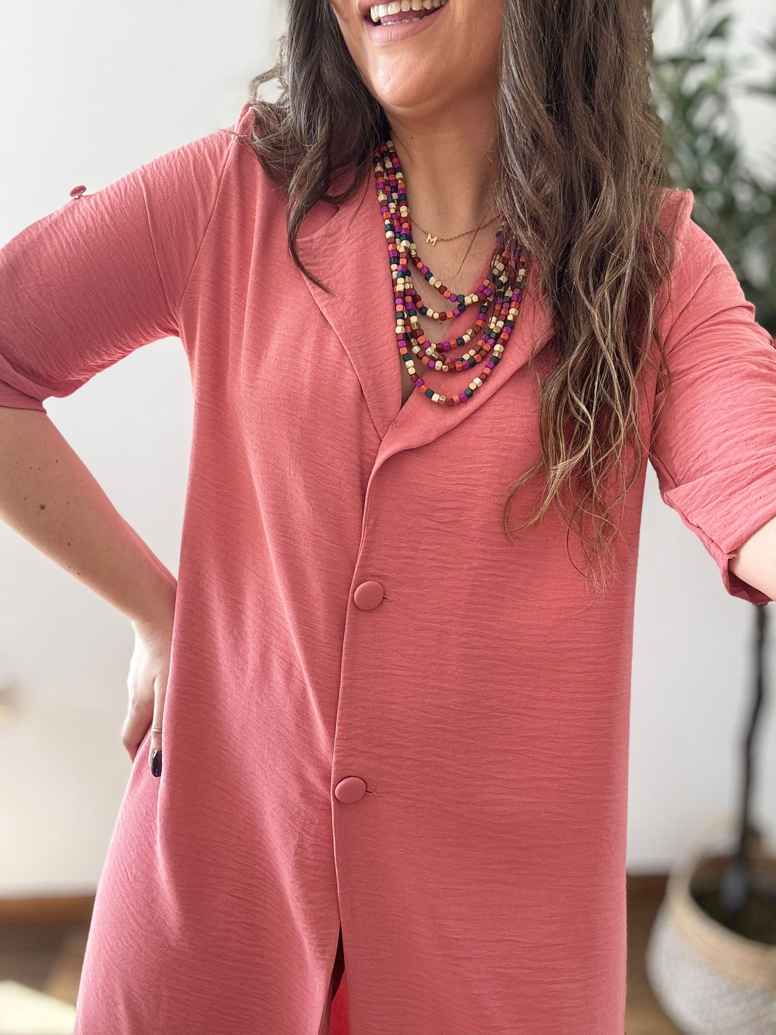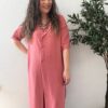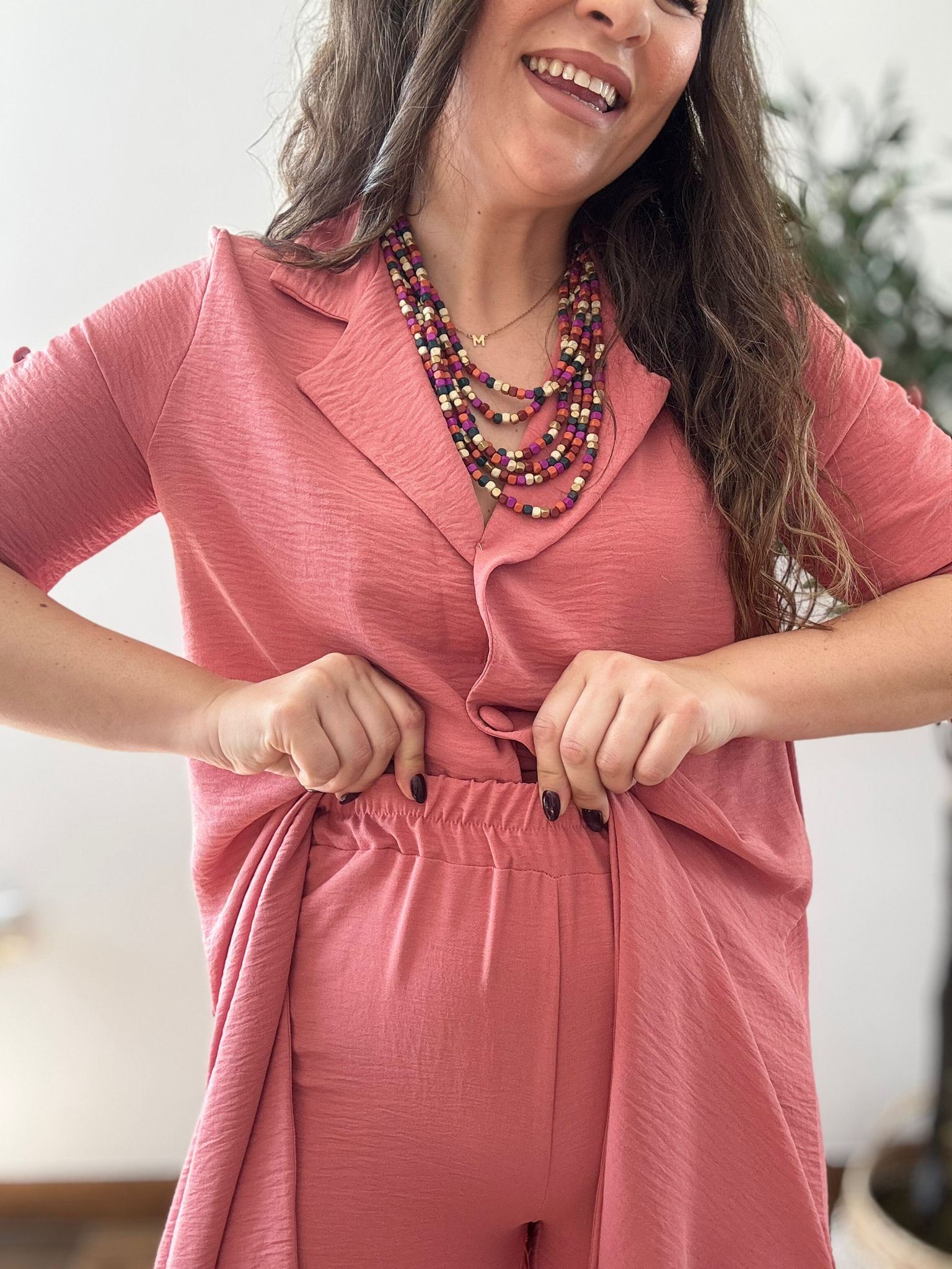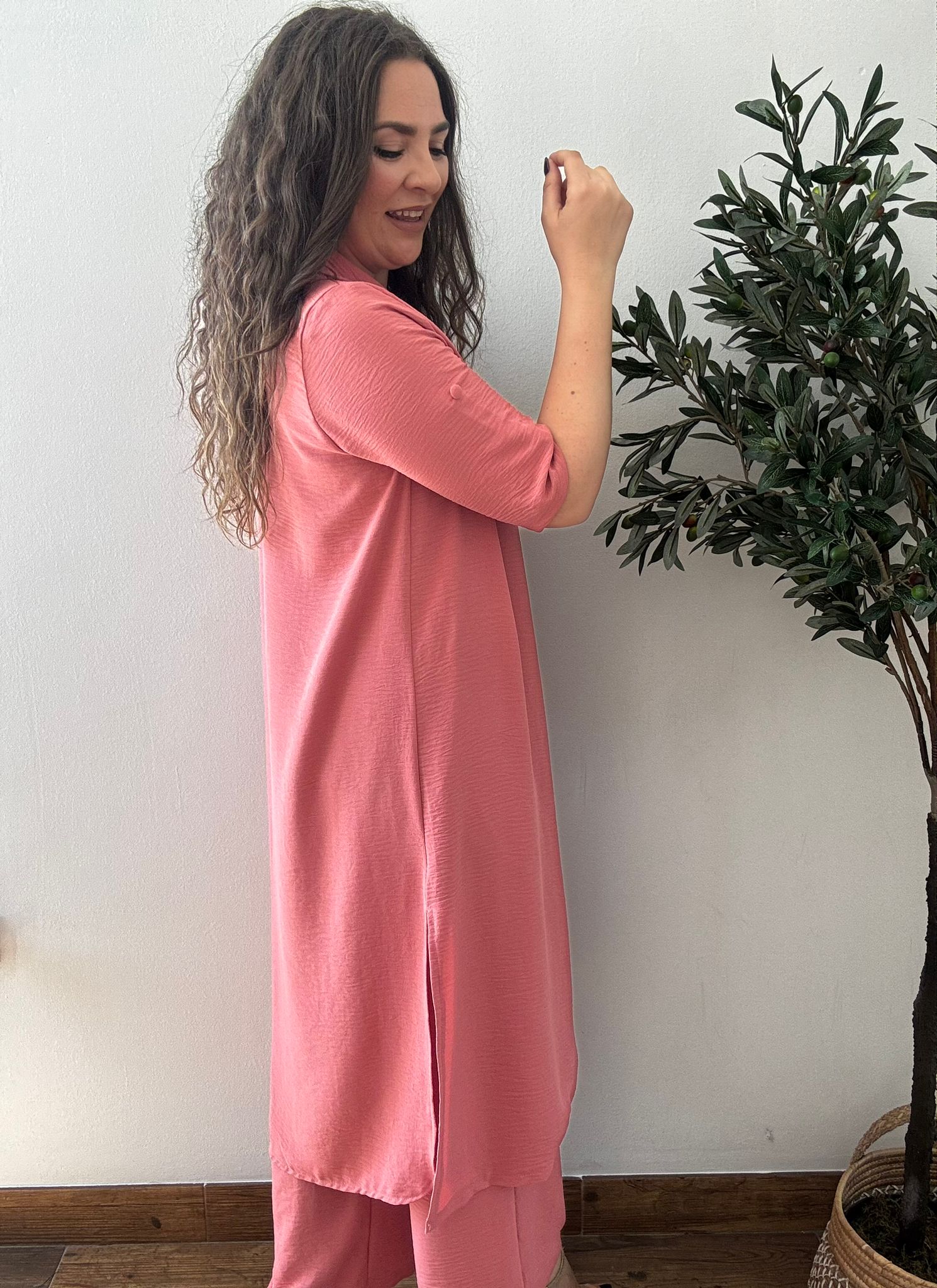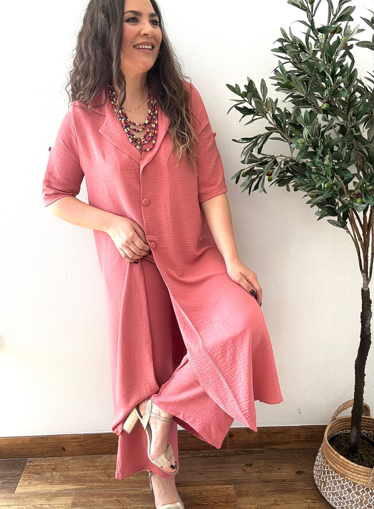 Conjunto de tejido fluido compuesto por camisola abotonada y pantalones engomados en la cintura. TALLA ÚNICA RECOMENDADA 36/44. Ana lleva habitualmente talla L/40 y mide 1.71m